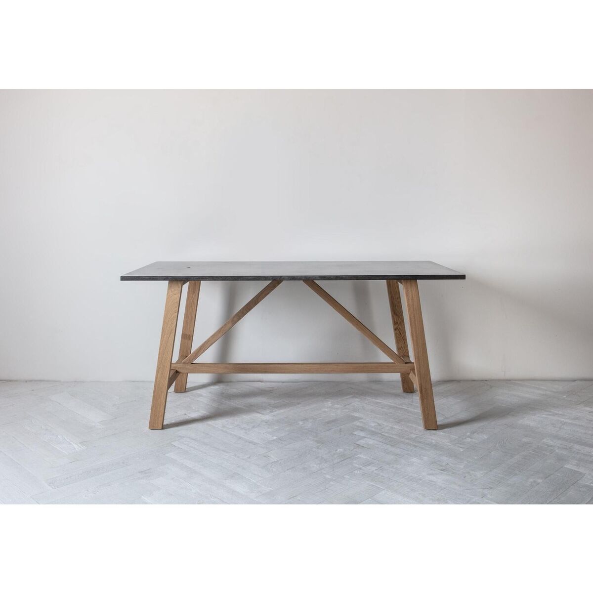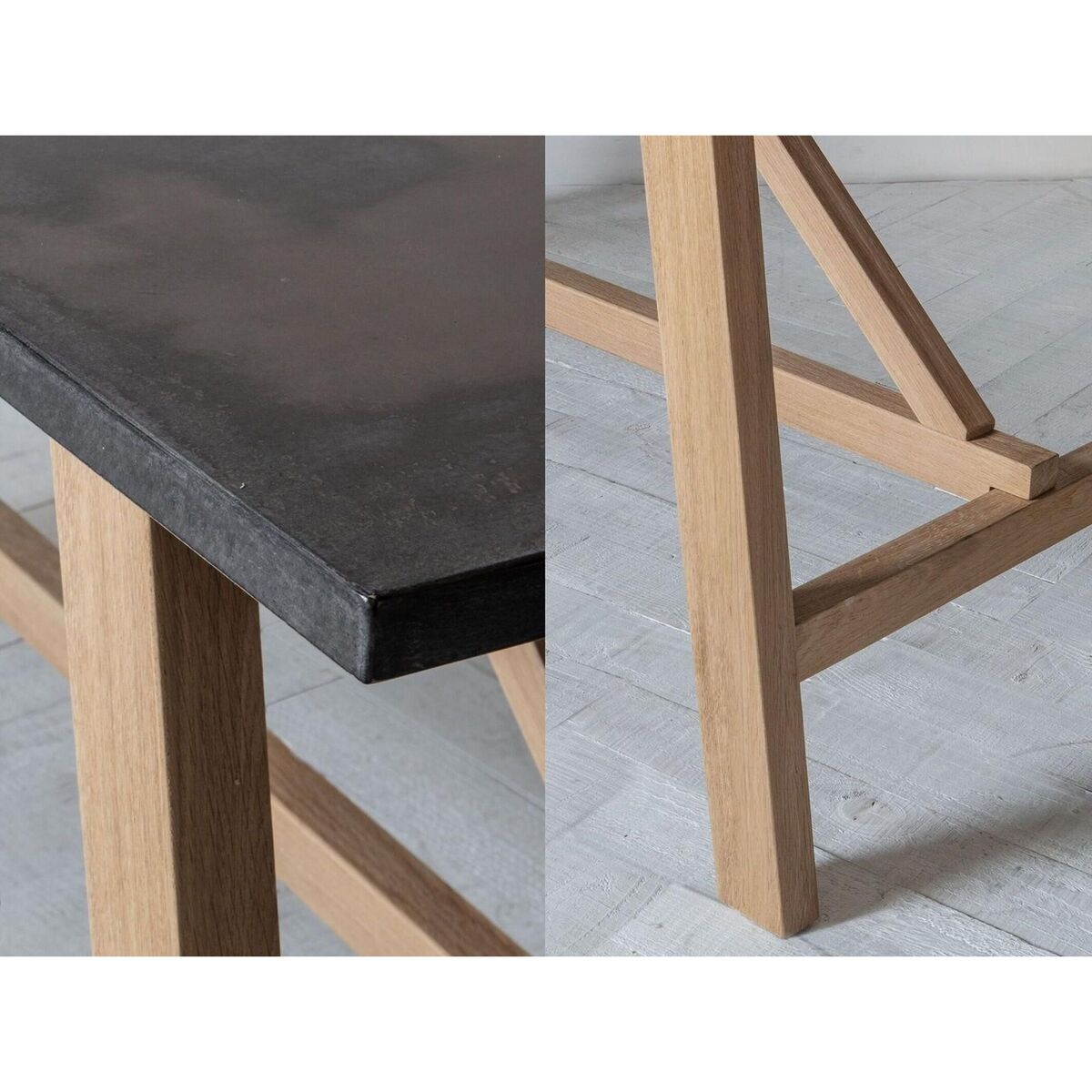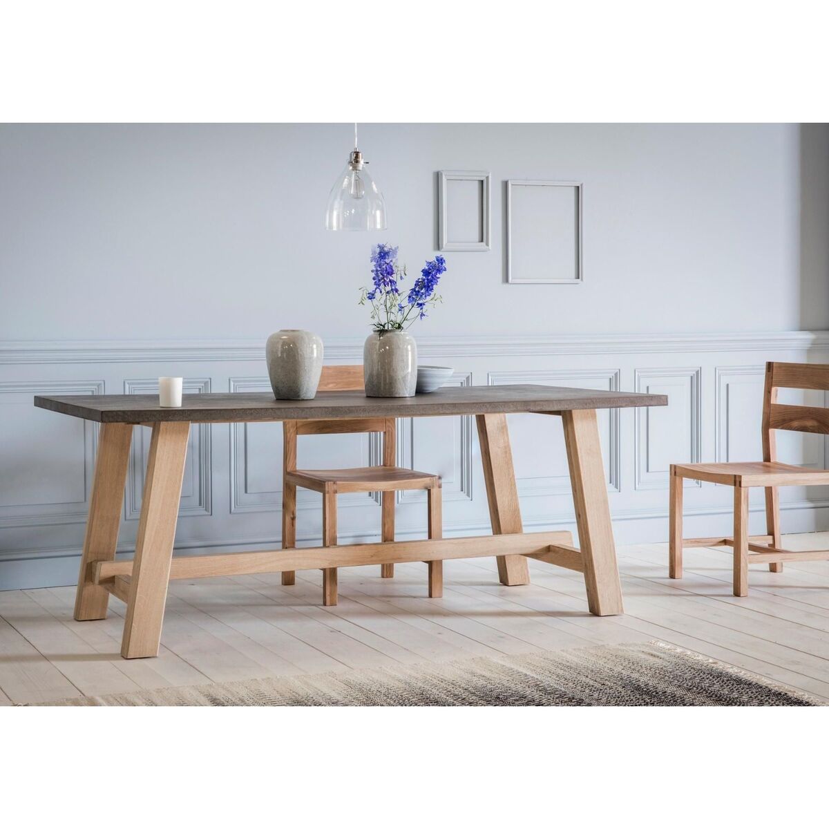 The Alec dining table is like nothing you've seen before - architectural, slightly industrial and beautifully contemporary at the same time. It is crafted from solid European oak, that lends it a natural character which beautifully complements the edgy, metallic bronze finish of its tabletop. The trestle design of its base makes it look light and airy without compromising on strength and robustness. Large in size and generous in style, the Alec sits up to six, providing a stylish scenario for both everyday meals and special occasions. Place it in a sunny dining room and see its top shine and reflect the natural light while infusing a feeling of beautiful calm into the room.