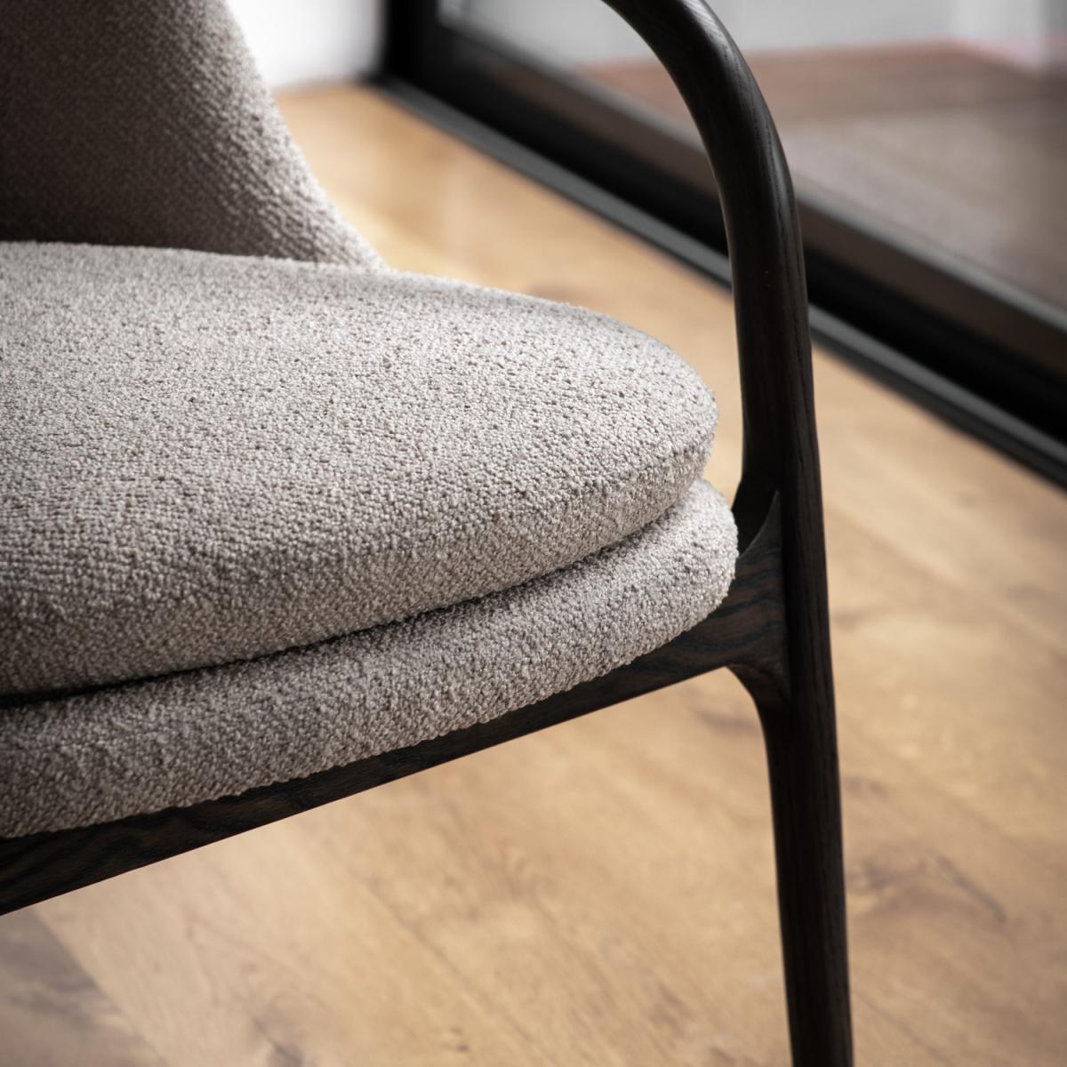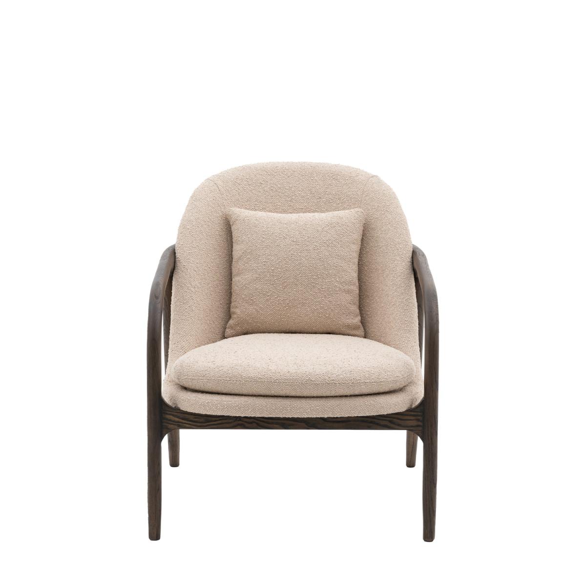 All about me Stylish and quirky mid-century inspired chair with hand curved sleek lines. The dark wood frame curves around the seat creating soft and sleek lines that are perfect for both modern and vintage inspired interiors. Upholstered in neutral taupe fabric to emphasis the dark lines of the chair, with a padded seat cushion and comfortable back cushion. Need to know Dimensions:W68 x D84 x H83 cm Colour: Taupe Finish: Upholstered Material:Oak / Plywood / Polyester / Foam / Polyfibre Assembly required: No