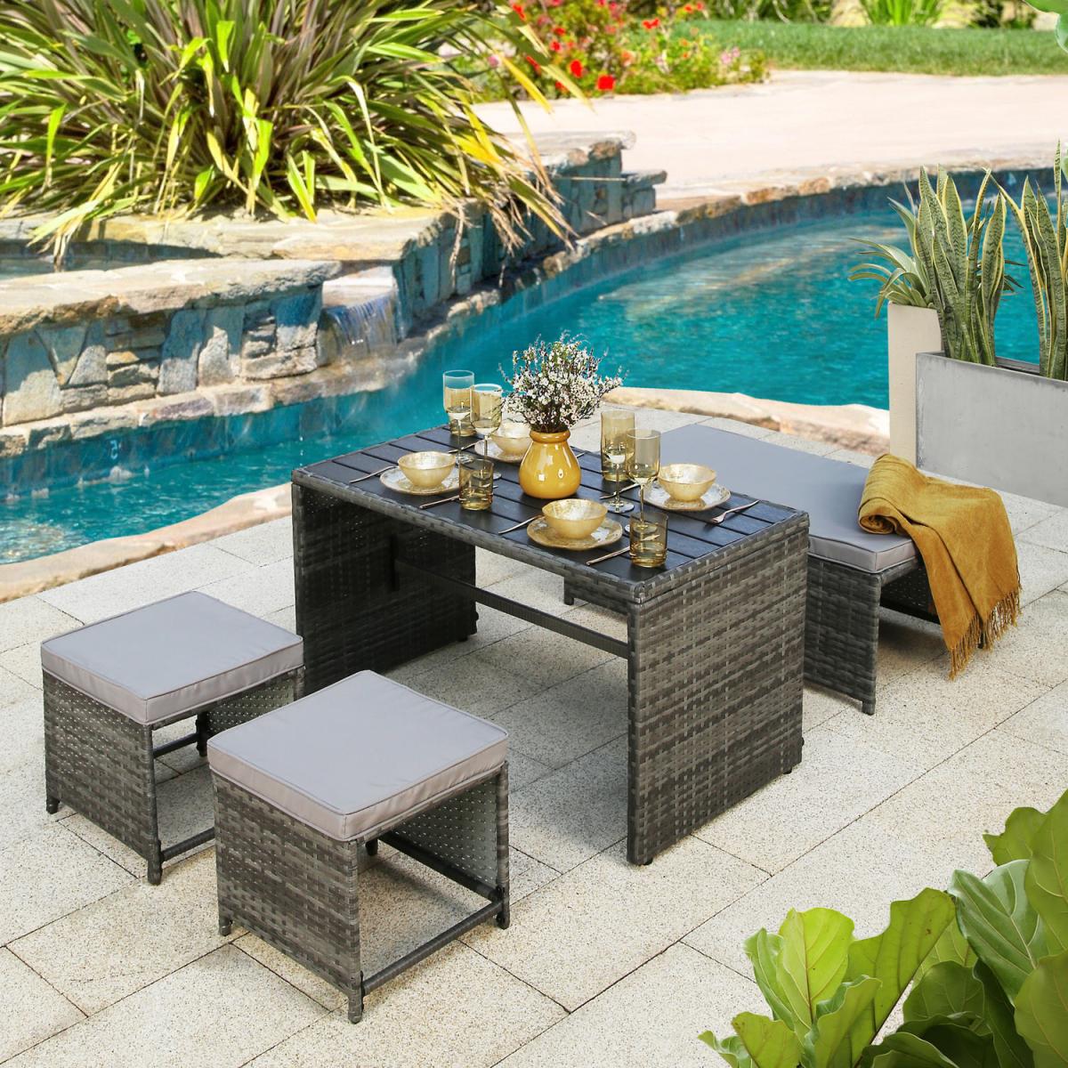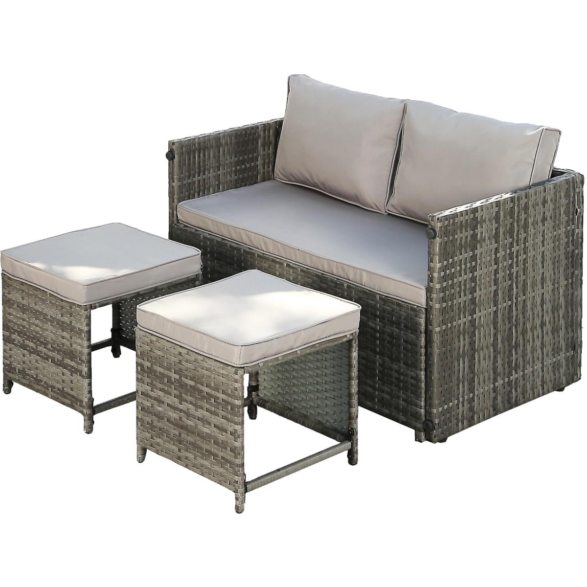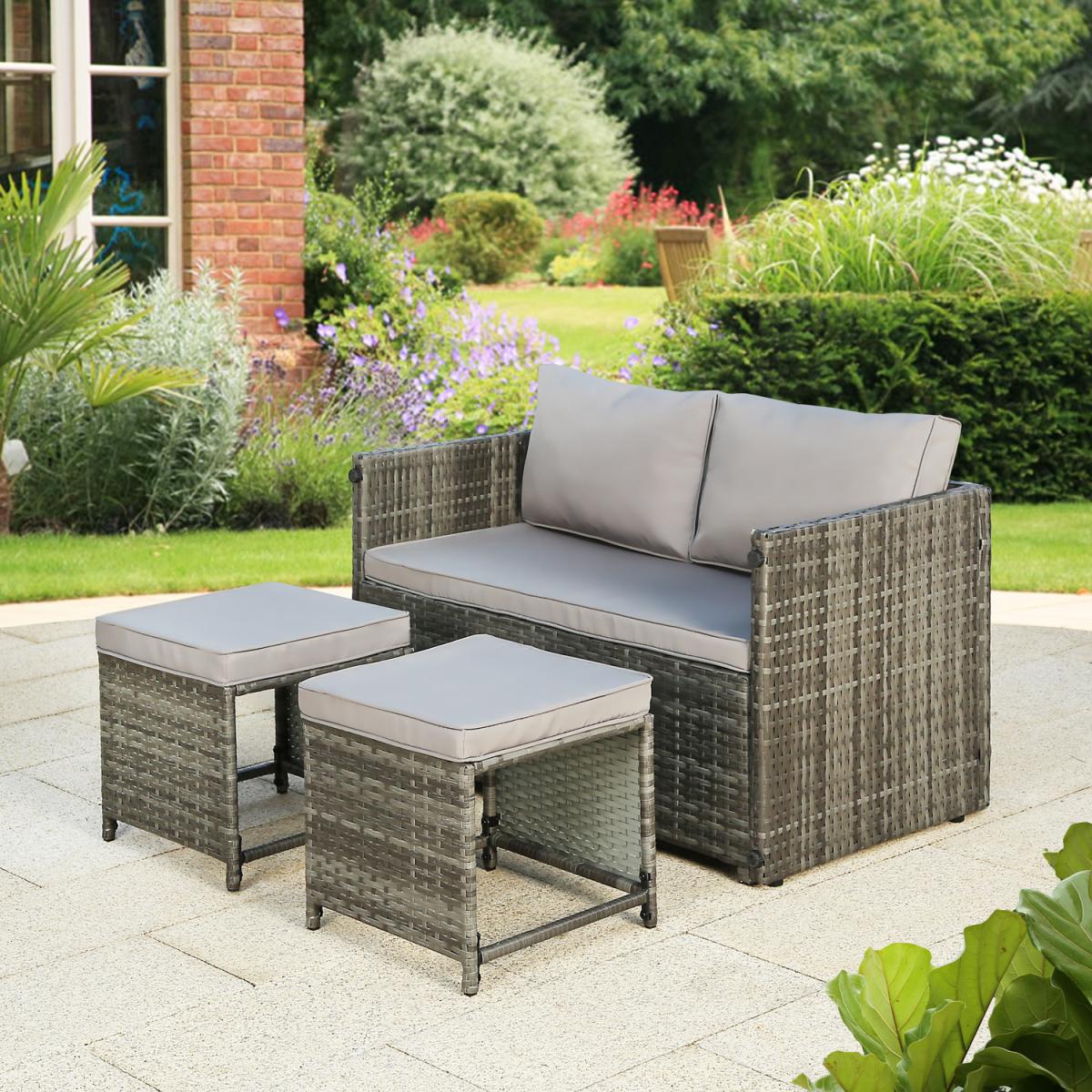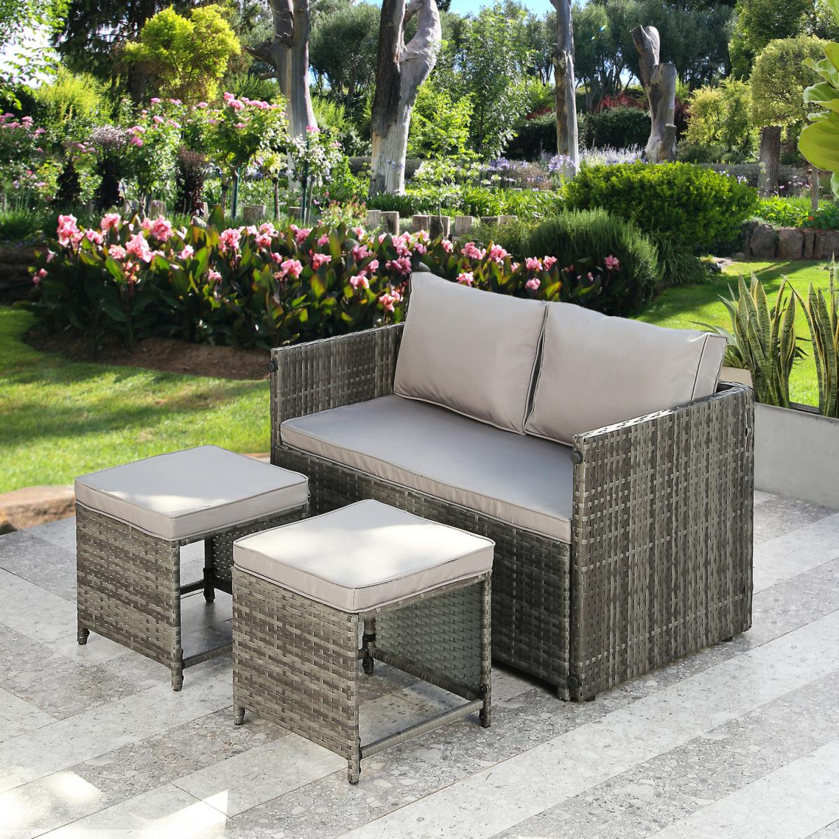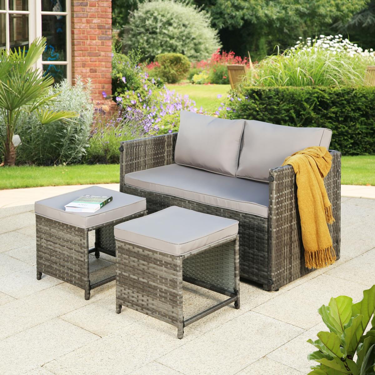 Presenting the Alena 2-seater rattan sofa set. a multipurpose piece of comfortable outdoor furniture. Any patio, garden, or outdoor living place would be ideal for this rattan lounge set. This rattan sofa set includes a sofa and two ottomans. However, the amazing feature of this rattan lounge set is that it can be converted into a 4-seater set with a coffee table (2-seater bench + 2 ottomans). The table's sturdy polywood tabletop, which has dimensions of 110x60cm, offers plenty of room for outdoor meals or lounging. The bench can seat comfortably up to two persons. Each of the two ottomans, can be utilised as extra seating or a footrest. This modern rattan sofa set is not only comfortable and attractive but also convertible into a 4-seater, providing flexibility and convenience for your home. The Alena 2-in-1 convertible rattan set is constructed from premium materials that can withstand outside weather. Moreover, this garden sofa set adds a fashionable and weatherproof finish to last for many years. This set is certain to improve your outdoor living space, whether you're hosting company or spending a peaceful evening outside.
