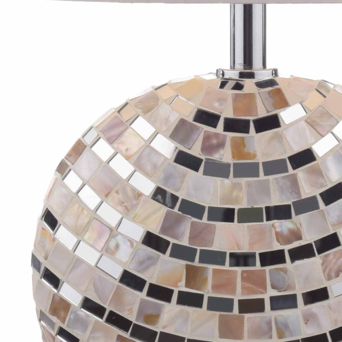 Beautiful shell and mirror mosaic table lamp complete with an ivory cotton shade. A beautifully exquisite table lamp, the Alena Table Lamp is a glamorous piece, exclusive to Pagazzi. Boasting a sophisticated mixture of pearlescent shell and mirror mosaic pieces, this table lamp is complete with a an oval ivory cotton shade. Versatile and decorative, this table lamp is set to be a stunning addition to your living space. Pagazzi offers a range of LED bulbs up to 100w equivalent.