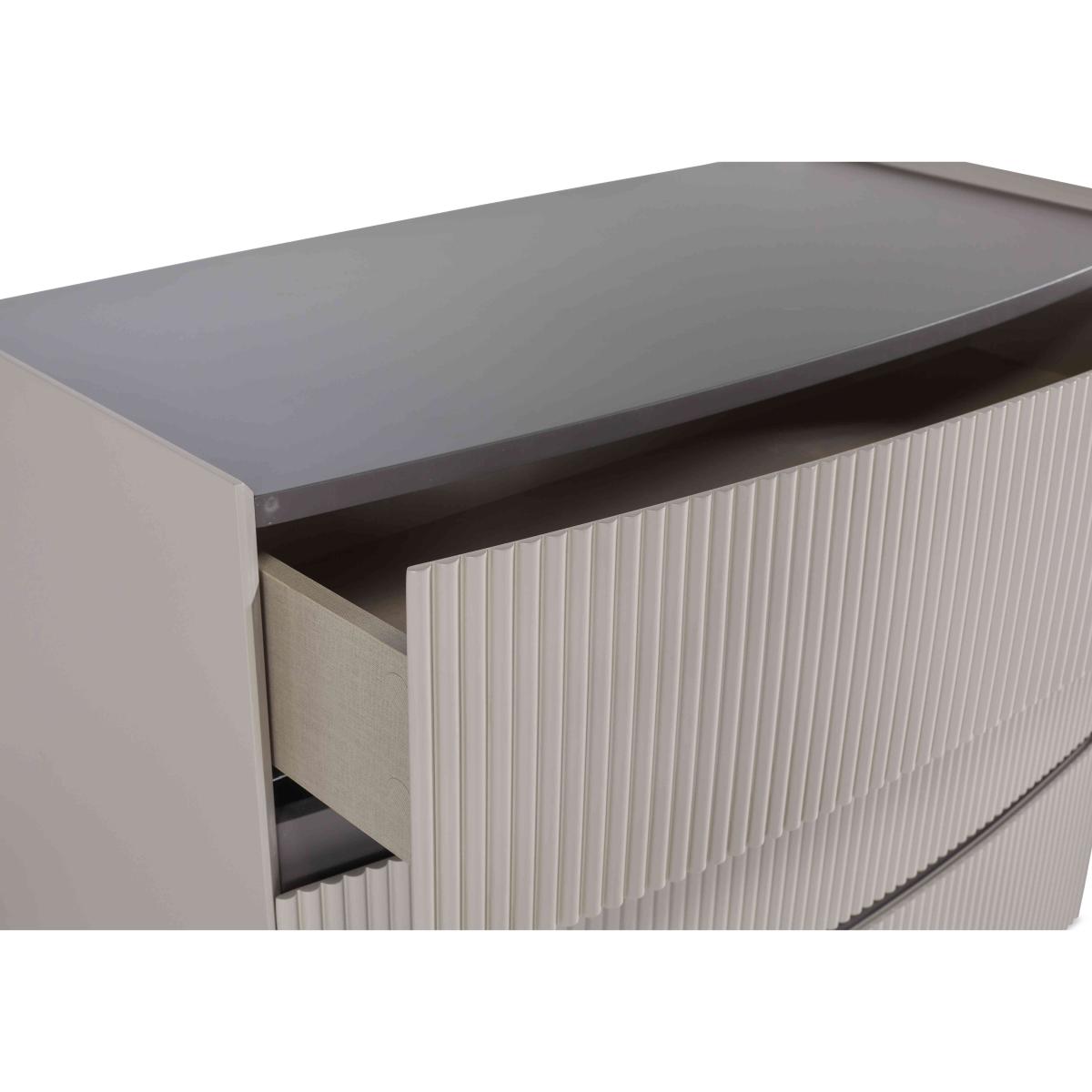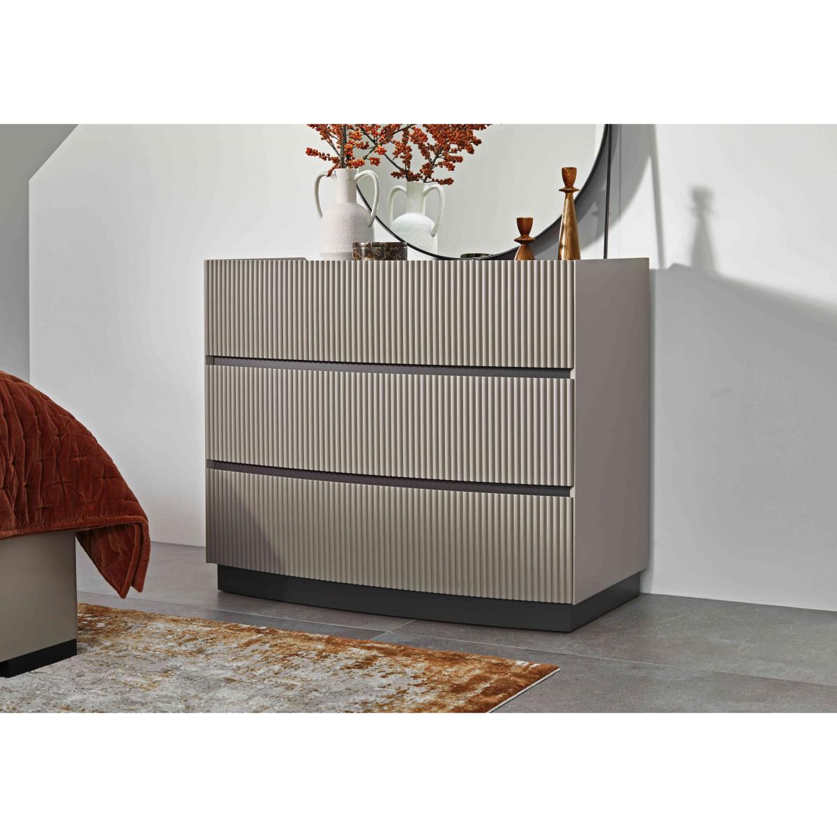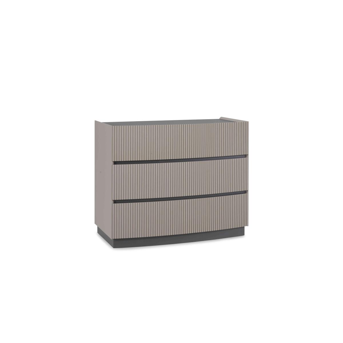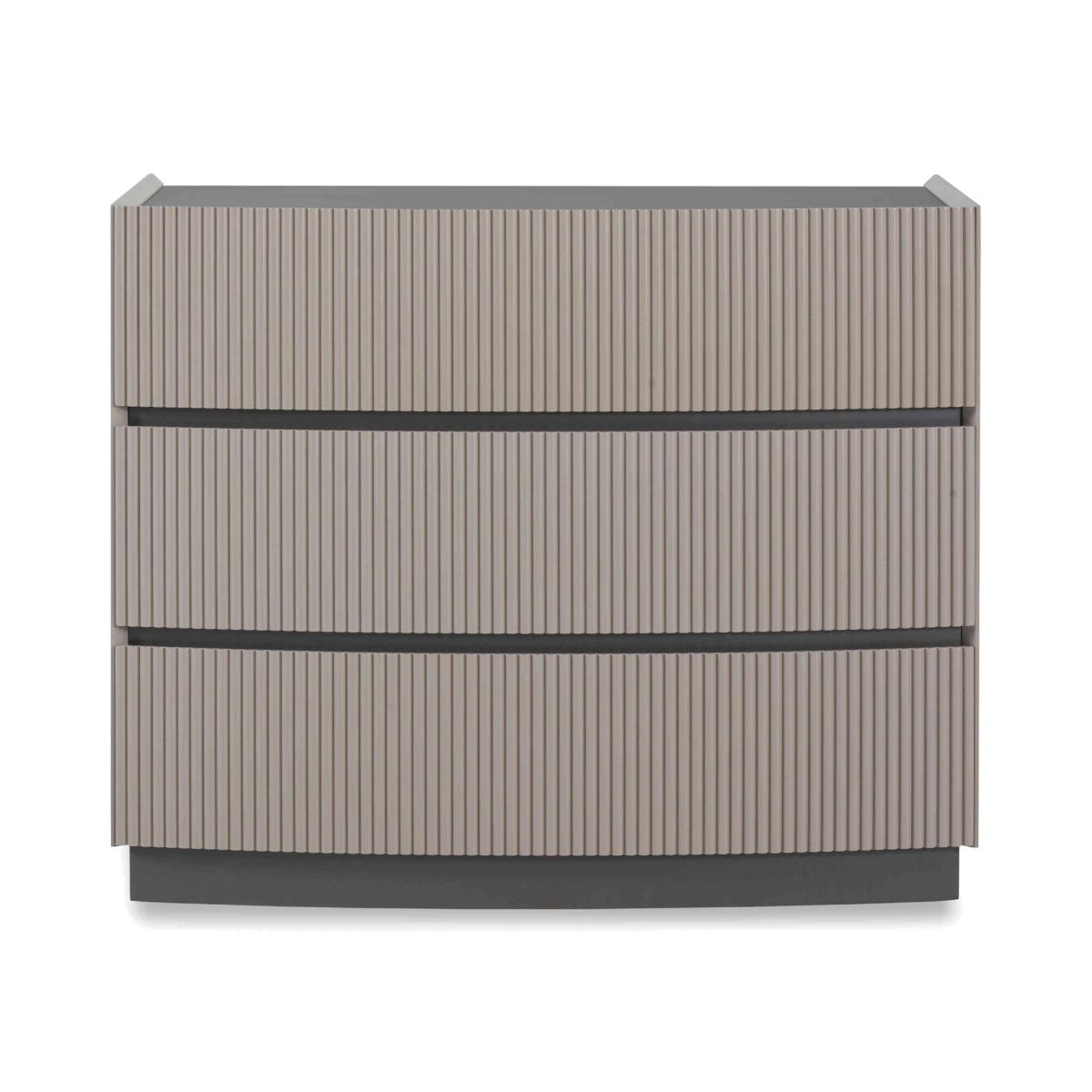 It’s easy to fall in love with our Alessio bedroom furniture collection. With its tonal two-colour palette in soft grey with graphite grey accents and modern matt-painted finish, it’s so on-trend. Plus, this range helpfully includes everything a modern bedroom needs – a bed frame and nightstands, chests of drawers large and small – and demonstrates thoughtful design choices everywhere you look. The striking bed frame has built-in LED headboard lighting, and storage pieces have soft-close drawers with neat finger pulls for a smooth and seamless look. Even better, the range’s chests of drawers arrive fully assembled so you can enjoy your stylish new bedroom right away. Perfect size and perfectly stylish – this on-trend dresser has a matt-painted finish in two shades of grey for a fashionable yet timeless look. Why you'll love it On-trend bedroom furniture style with a fashionable two-tone look. Modern matt painted finish. Soft grey with contrasting graphite grey accents. Smooth and seamless look with integrated finger pulls. Soft-closing drawers. Delivered in one piece – no assembly required. This 3-drawer dresser is part of the Alessio bedroom furniture range. What you need to know 3 drawers. Arrives assembled. Please note that the matt finish may show surface scratches under certain lighting. While durable, this table’s finish is not heat resistant or heatproof. Do not use abrasive cleaning products. Use coasters and placemats at all times. WARNING!