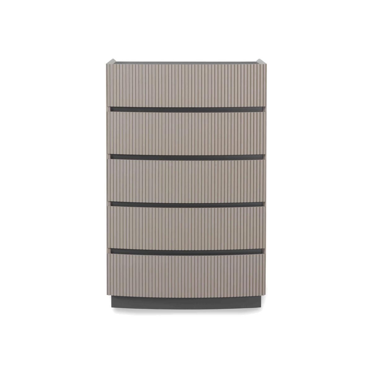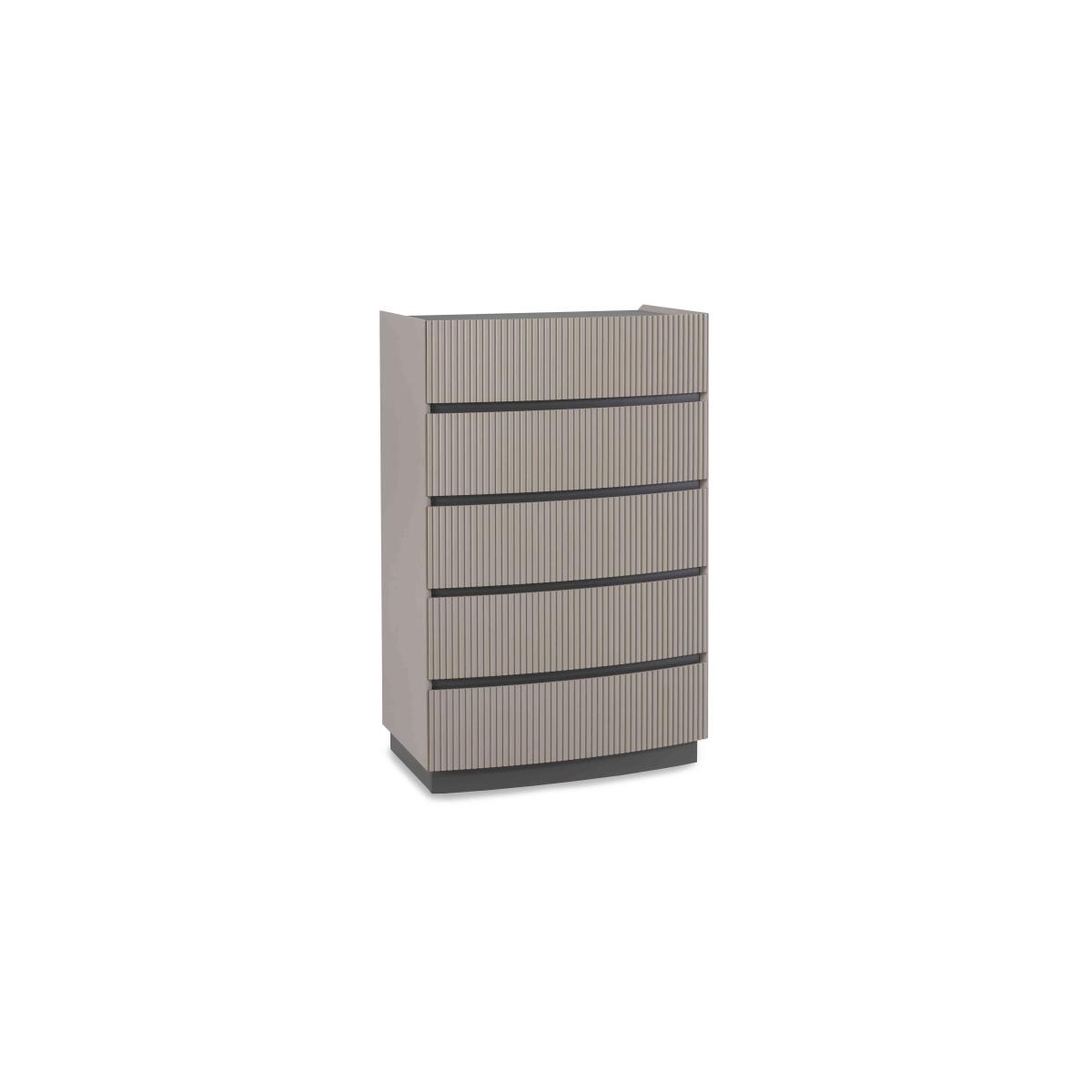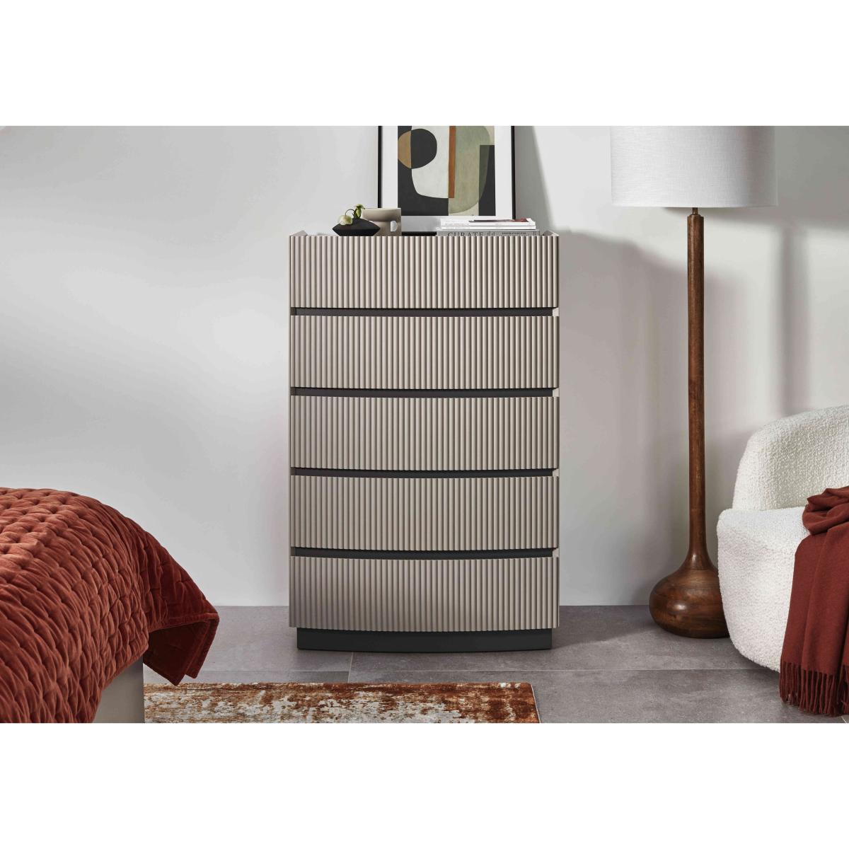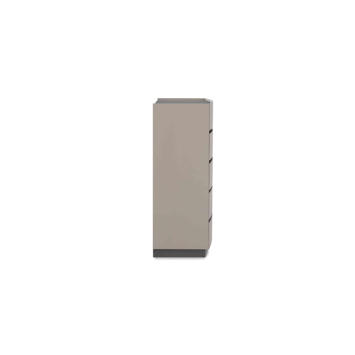 It’s easy to fall in love with our Alessio bedroom furniture collection. With its tonal two-colour palette in soft grey with graphite grey accents and modern matt-painted finish, it’s so on-trend. Plus, this range helpfully includes everything a modern bedroom needs – a bed frame and nightstands, chests of drawers large and small – and demonstrates thoughtful design choices everywhere you look. The striking bed frame has built-in LED headboard lighting, and storage pieces have soft-close drawers with neat finger pulls for a smooth and seamless look. Even better, the range’s chests of drawers arrive fully assembled so you can enjoy your stylish new bedroom right away. The perfect dresser for a smaller bedroom, this tall chest of drawers gives you plenty of storage in less space. And you’ll love its matt-painted two-tone finish in grey. Why you'll love it On-trend bedroom furniture style with a fashionable two-tone look. Modern matt painted finish. Soft grey with contrasting graphite grey accents. Smooth and seamless look with integrated finger pulls. Soft-closing drawers. Delivered in one piece – no assembly required. This tall chest is part of the Alessio bedroom furniture range. What you need to know 5 drawers. Arrives assembled. Please note that the matt finish may show surface scratches under certain lighting. While durable, this table’s finish is not heat resistant or heatproof. Do not use abrasive cleaning products. Use coasters and placemats at all times. WARNING!