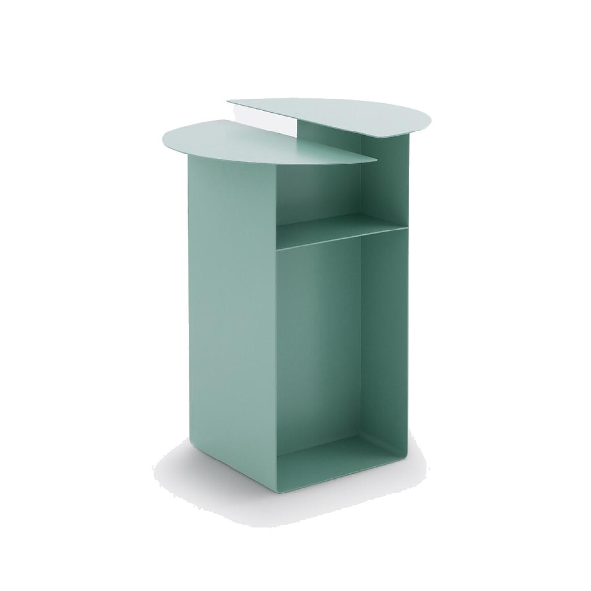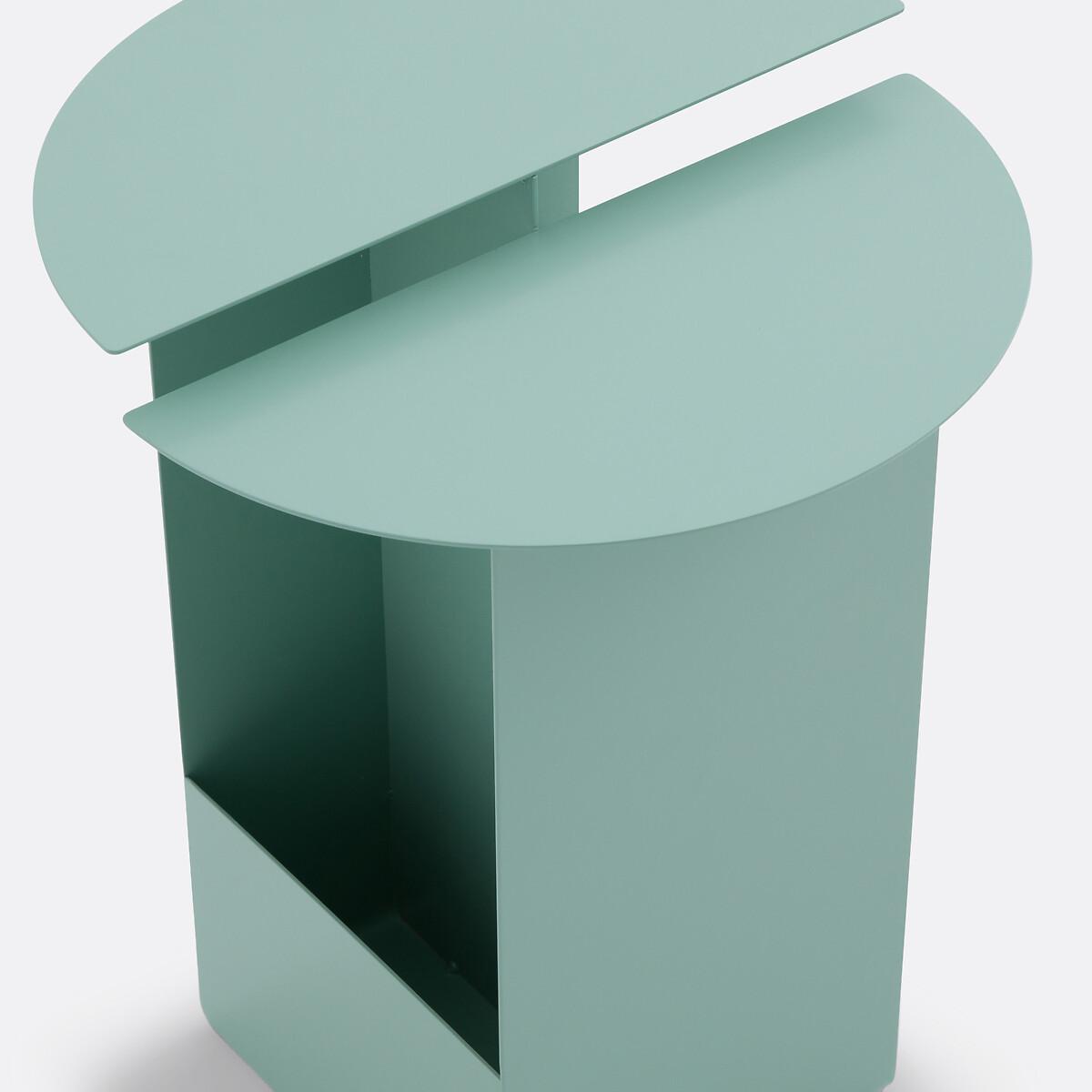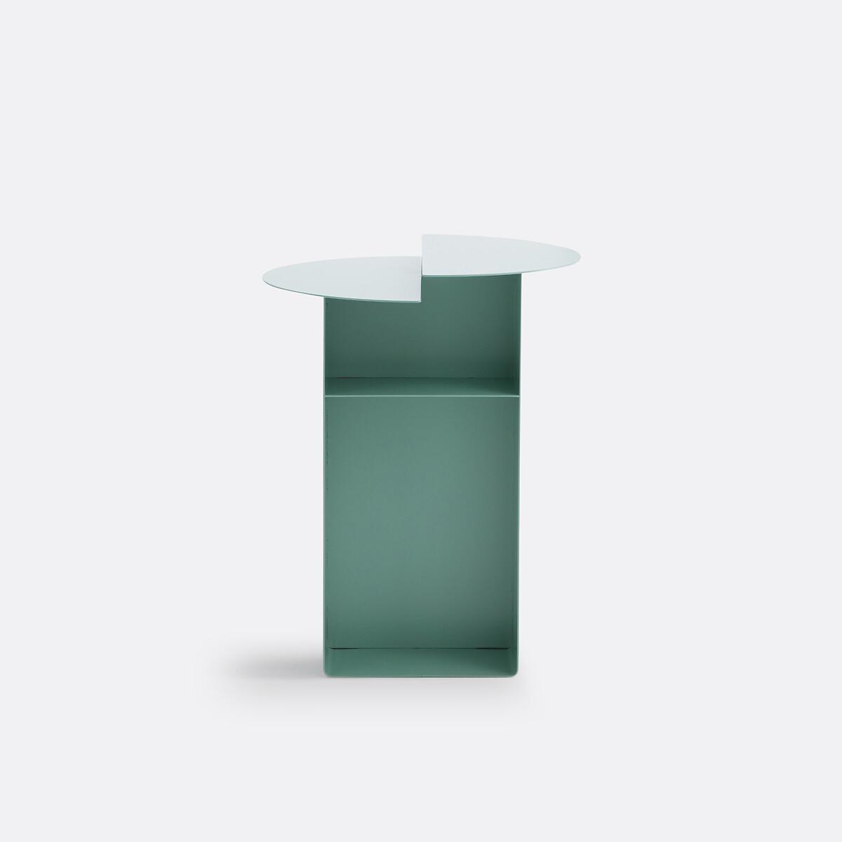 An industrial style and contemporary design. Alessio offers a double semi-circle top and can be used on both sides. Functional and inventive furniture. Product Details • Made from steel with an epoxy finish • Semicircular double tabletop • Reversible: 1 side with a shelf, 1 side with a storage niche • Felt pads on feet • Delivered pre-assembled. Dimensions • Length: 38cm • Depth: 38cm • Height: 48.2cm • Weight: 8.2kgDelivery:.. Note! Please check that all access points are large enough to accommodate your delivery (doors, stairs, lifts).Dimensions and weight of parcel1 parcel • L46 x H57 x D46cm. 10kg