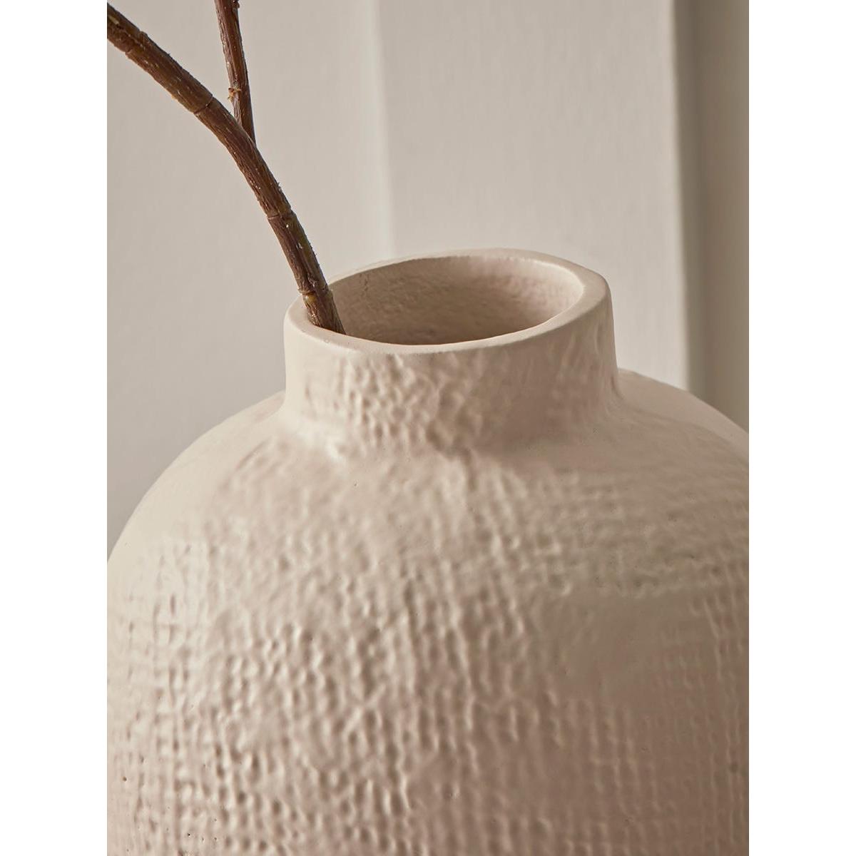 I really like this vase for its tactile, textured surface and neutral tone-perfect for adding subtle visual interest without overwhelming a space. It works well in both contemporary and Scandi-inspired interiors, especially when styled with natural greenery or dried bouquets to highlight its earthy appeal. For practical tips, consider placing it on a sideboard or windowsill where it can stand alone as a statement piece or be grouped with other textured ceramics for a curated look. Its size makes it versatile for small arrangements or even as a decorative sculpture when empty. Overall, it’s a simple yet sophisticated addition that can elevate a variety of interior styles.