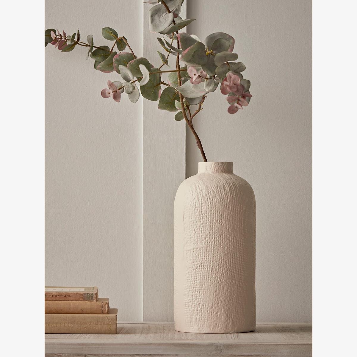 A simple bottle shaped vase in pale terracotta tones. A hessian like woven imprint adds visual interest and texture. A short narrow mouth makes it ideal for holding tall stems of either faux or fresh flowers in place.