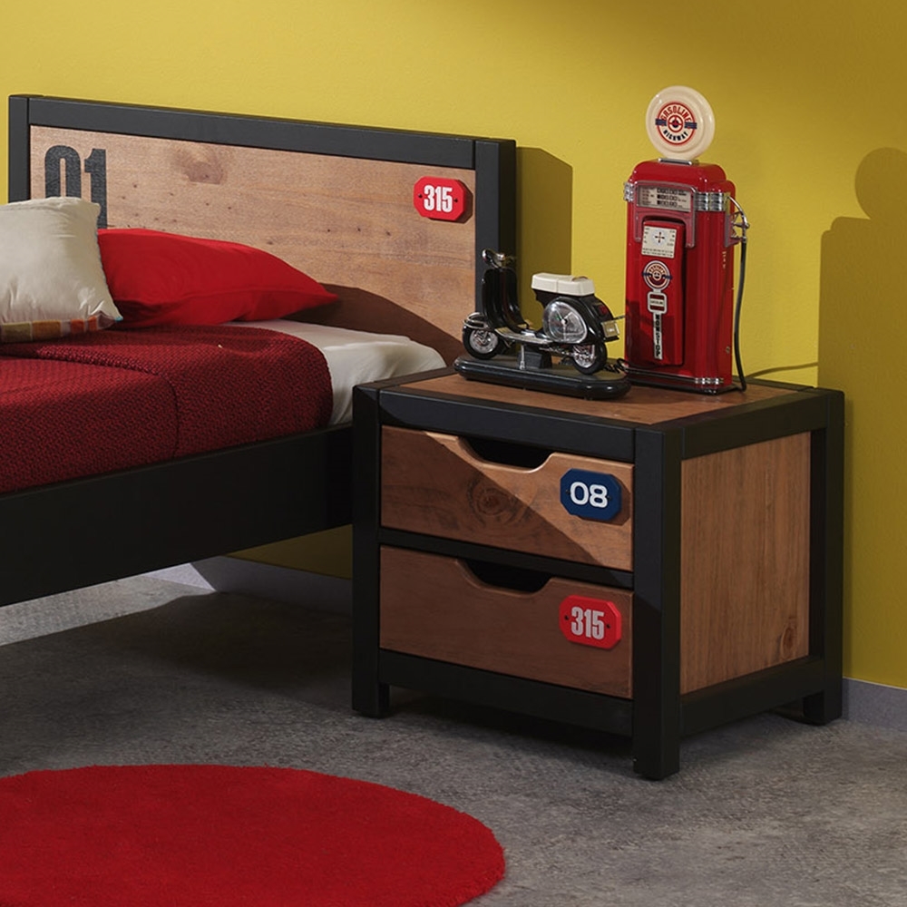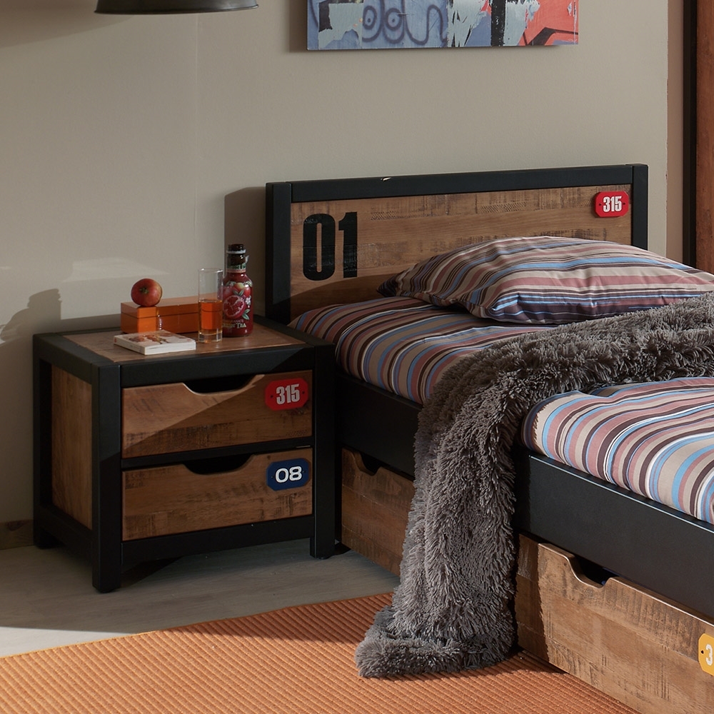The Alex Bedside Table will be the perfect spot for that bedside lamp. Perfect for any late-night bedtime reading. With two handy drawers both with funky bright coloured number details, your youngster will be able to keep all of their treasured possessions close to hand. The rustic industrial style finish will be sure to see your little one all the way into their teenage years, why not pair with other prices from the Alex range to create a cool and funky bedroom for your youngster.