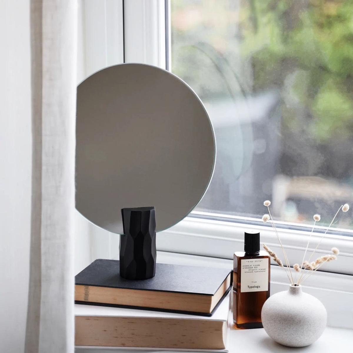 I really like this black table mirror for its sleek, contemporary look. It works particularly well in modern or minimalist interiors where clean lines and monochromatic palettes are key. The bold black frame adds a touch of sophistication, making it a versatile piece that can elevate a dresser, vanity, or side table. Practical styling tips include pairing it with neutral-toned accessories or textured materials to create visual interest without overwhelming the space. Placing it near a window allows natural light to enhance its functionality, while layering it with books or small decorative objects can add personality and depth to your vignette.