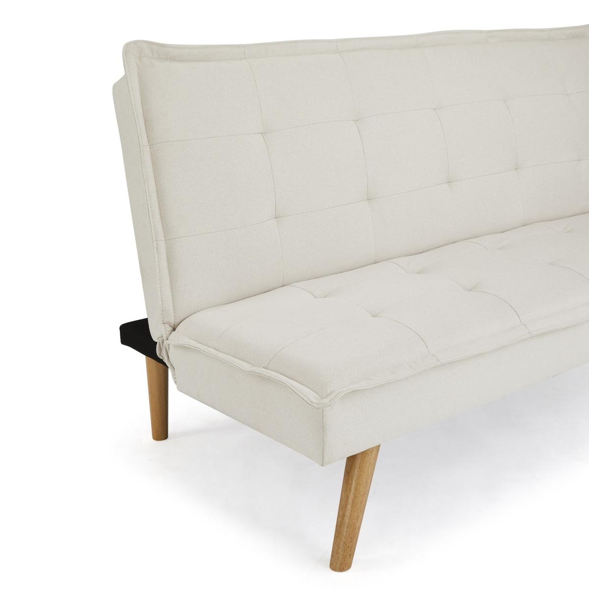 Introducing ALEXANDER a 3-seater fabric sofa bed, available in beige fabric. This ALEXANDER sofa bed is the right choice if you are looking for a modern style. This sofa bed features generously filled pillow topper style padded cushions with tufted padded seat and backrest, flanged cushion with no arms giving a sleek silhouette, it also has tapered wooden legs. Convertible design - this sofa bed has a simple clic-clac mechanism that allows it to swiftly and simply transform from a sofa to a recliner to a bed, making it ideal for overnight guests. This sofa bed cannot be freely positioned in your room. The back of this sofa bed is upholstered in a black woven fabric that does not match the colour of the sofa bed fabric. Due to differences in lighting and screen resolution on laptop, desktop, and mobile devices, some fabrics may appear somewhat different in person. To get the most out of your sofa bed we recommend gently cleaning with the upholstery attachment of your vacuum cleaner or using a soft hand brush once per week. You might need to screw the legs to the underside of some of our sofa beds since they don't all have pre-drilled holes. All of our sofa beds come with an easy-to-follow assembly guide. Delivered by our friendly couriers on a 2-man delivery service within 3-7 working days. The courier will deliver to a room of your choice.