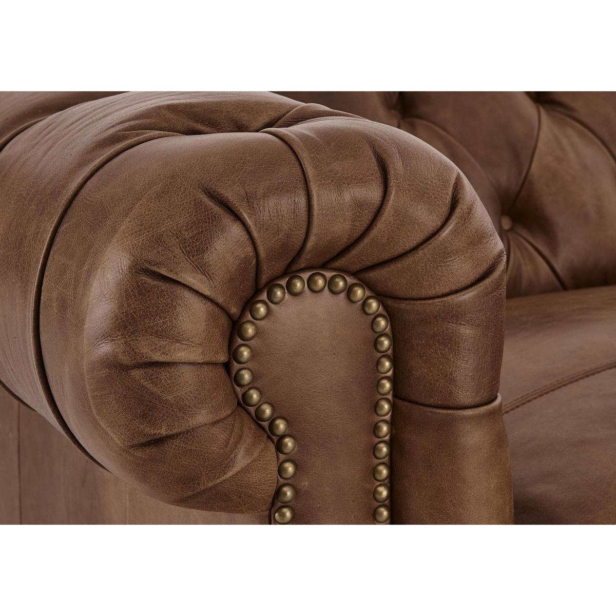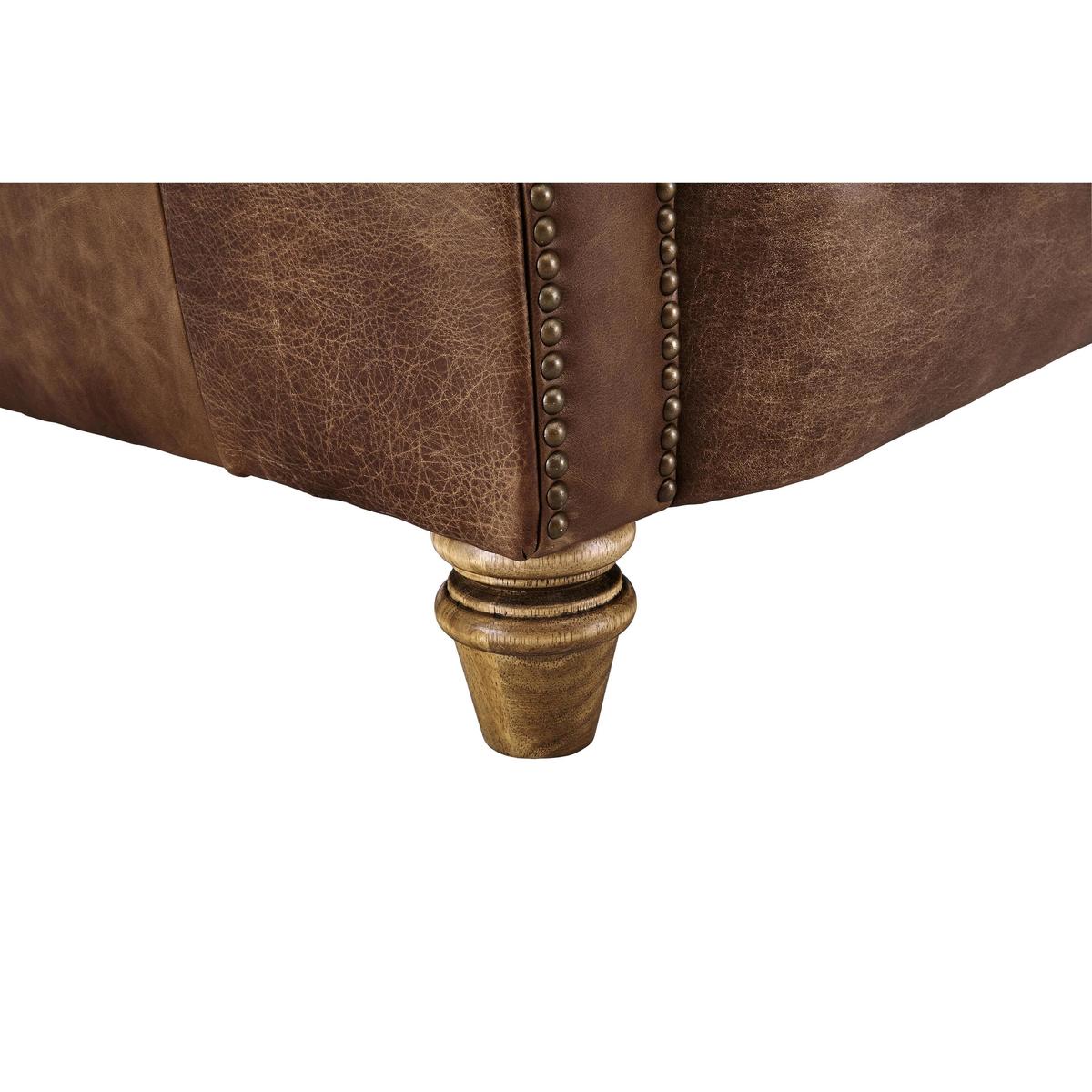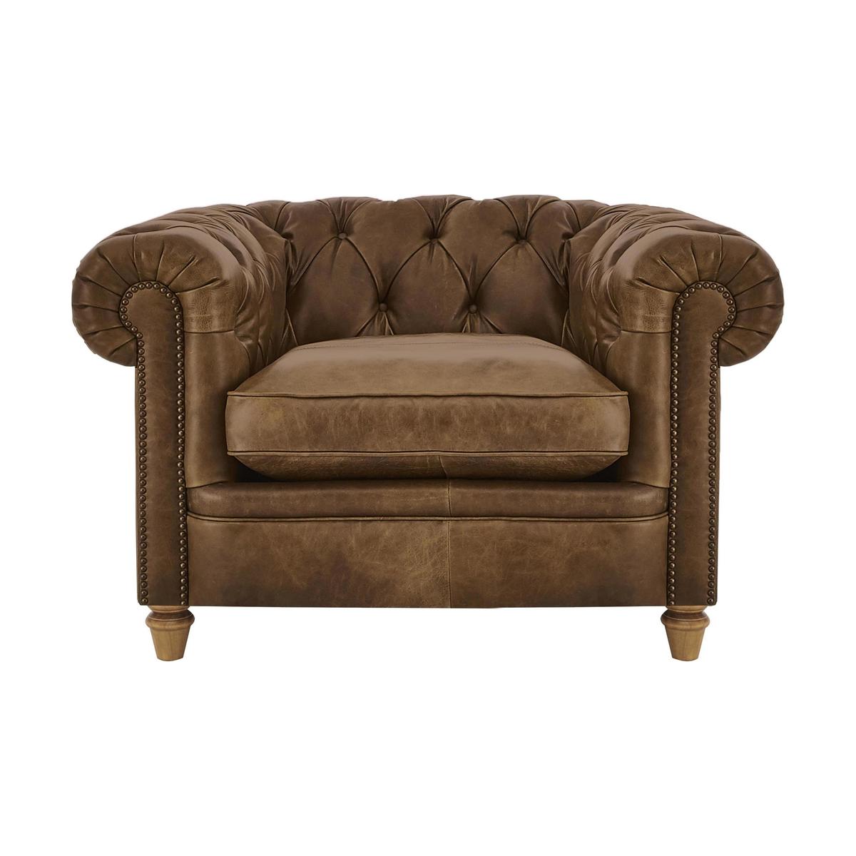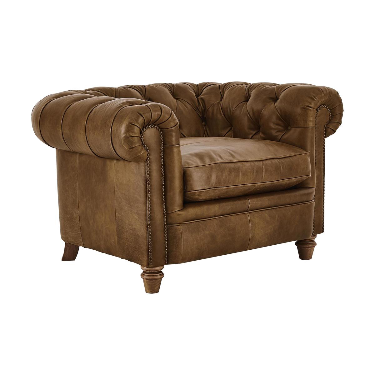 Discover iconic British style with the classic New England collection, made exclusively for Furniture Village by Alexander and James. Mix and match hand finished natural leathers, soft velvets, linen blends and British wools for a fashionable textured look. Sprung seats, supportive backs, feather and fibre filled scatters and lavish buttoning offers luxurious comfort. Just kick back and unwind, New England style. Made by Alexander and James, the Newport armchair is timeless and classic, with scroll arms, hand-turned wooden feet in a choice of finishes and lavishly buttoned back in the Chesterfield style. Thanks to its beautiful hand finished leather upholstery in a choice of grades and colours, it can either blend into a traditional interior or make a statement in a contemporary home. Like all of the pieces in the New England collection, the Newport is also available in a wide selection of fabrics including linen blends, velvets and wools. When it comes to your favourite armchair, comfort is everything. This chair certainly won’t disappoint, offering a luxuriously comfortable sit thanks to its sprung seat and back, foam filled back cushion and sumptuous foam and fibre seat cushion. The Newport leather armchair with solid hardwood rails is part of the New England collection, made exclusively for Furniture Village.