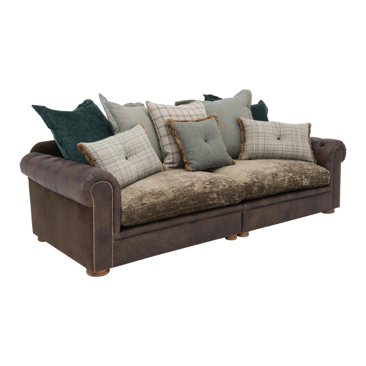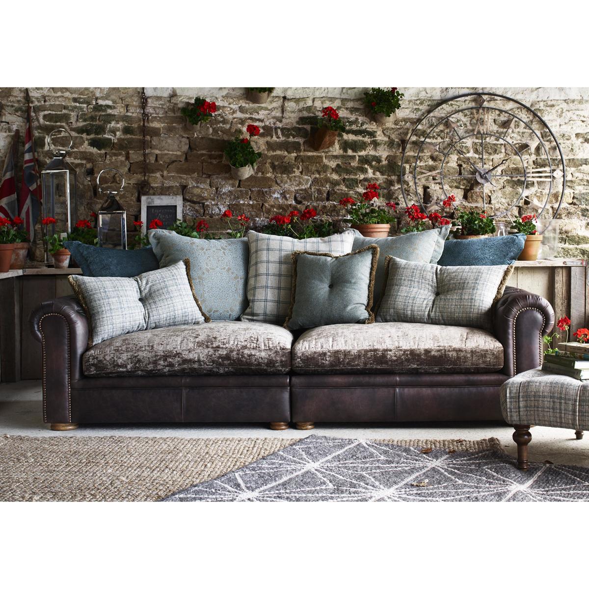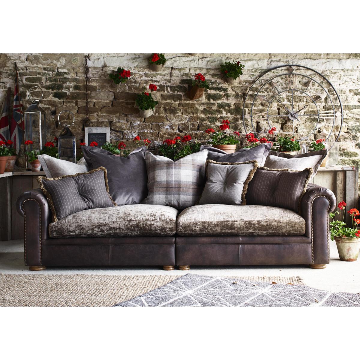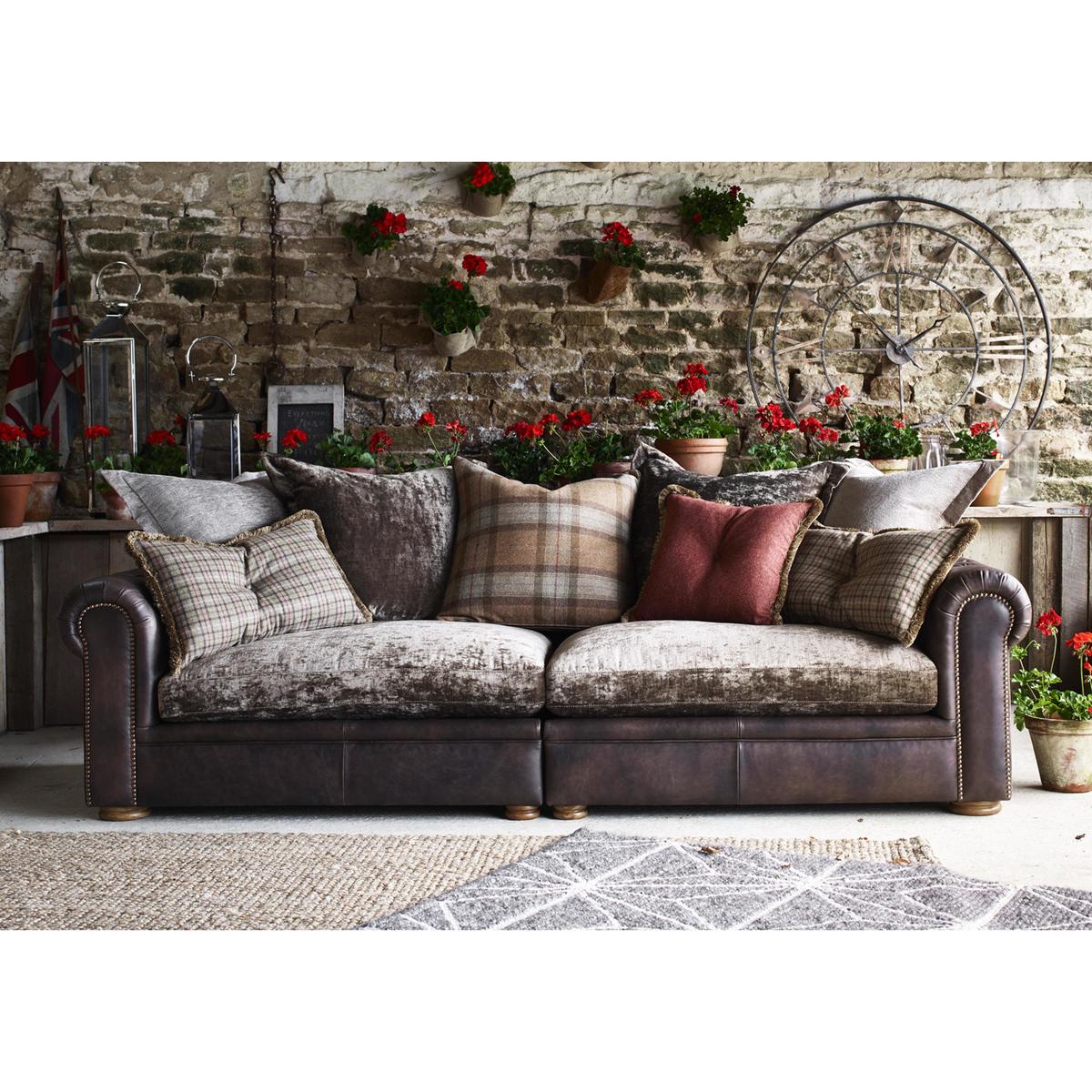 Large and inviting multi-textured 4 seater sofa is handcrafted. On trend mix of leather and fabric upholstery. Scatter back style with 5 coordinating fabric cushions. Buttoned scroll arm, antiqued studding, and weathered oak feet. Backs are foam with fibre, seats are foam with fibre and feather. Zig zag spring suspension, firm front edge seats keep their shape. Split back for easier manoeuvrability, comes with 2 scatters. Part of the New Romance Collection, only at Furniture Village