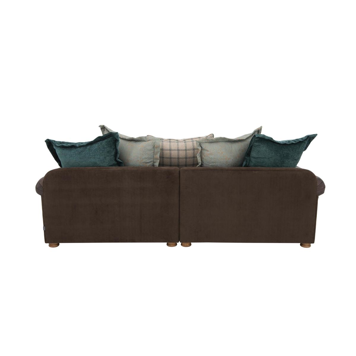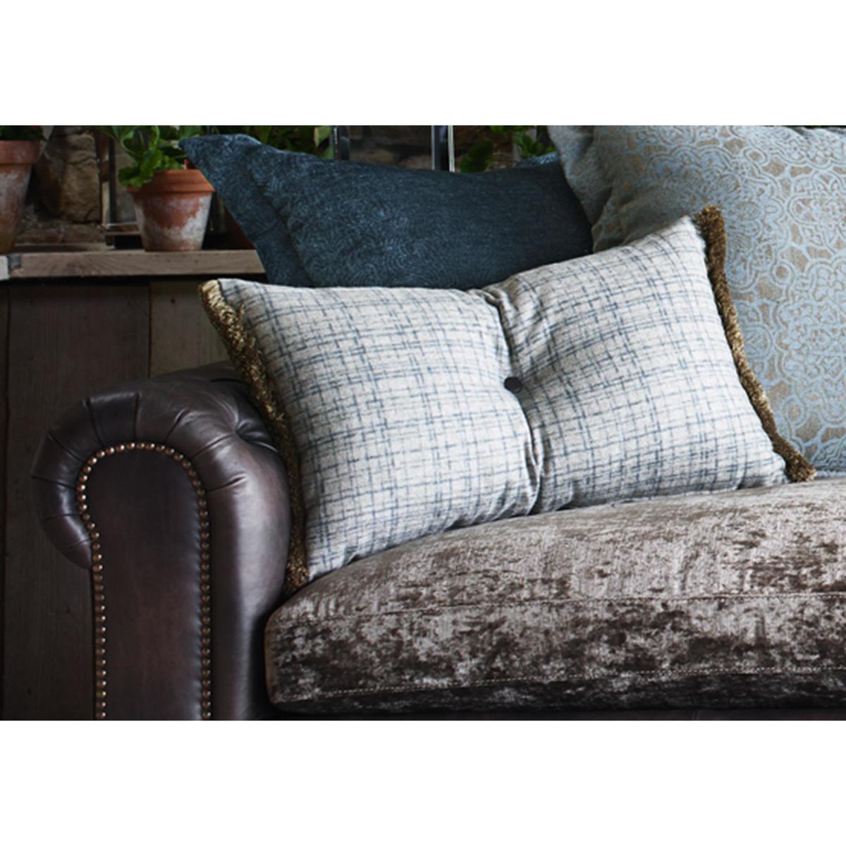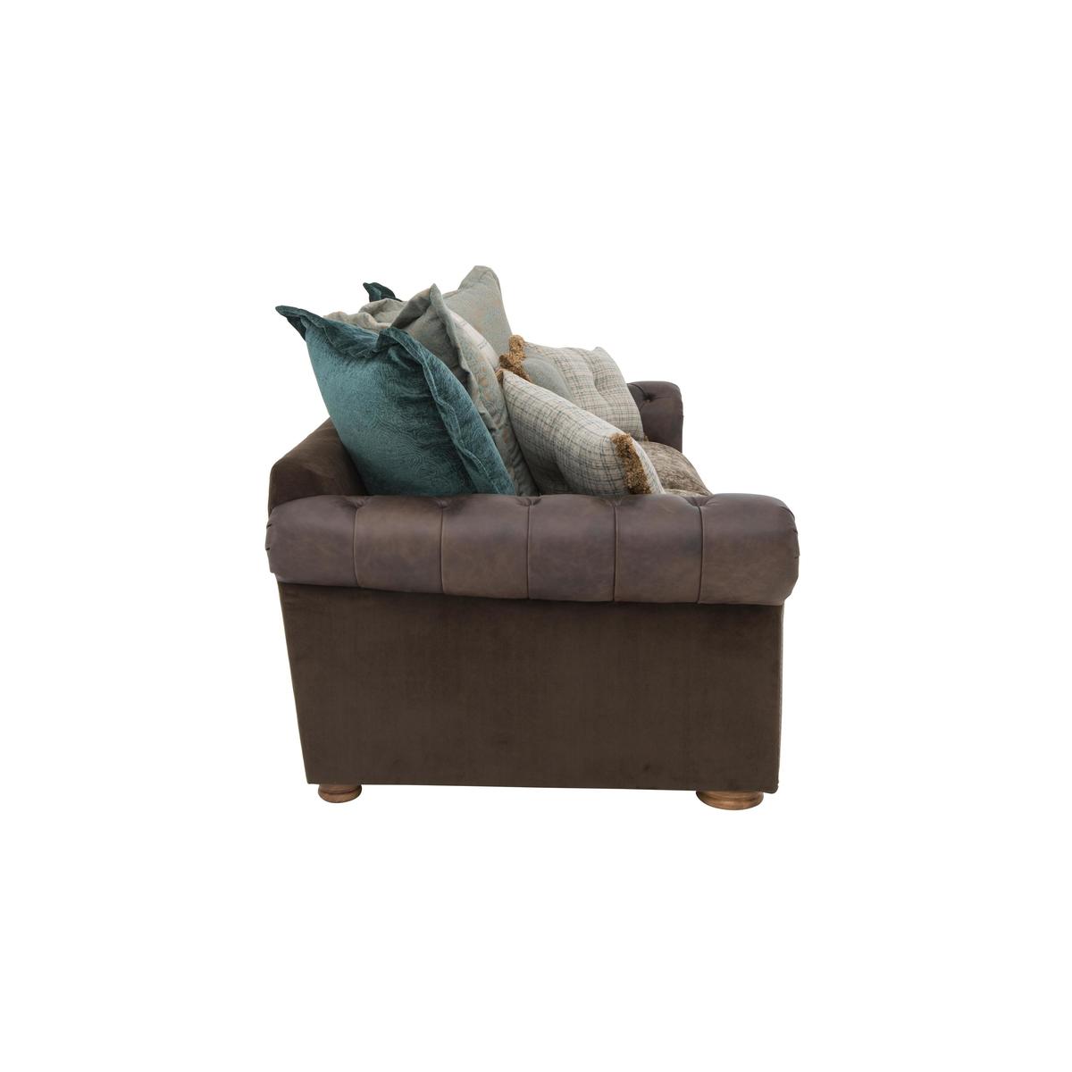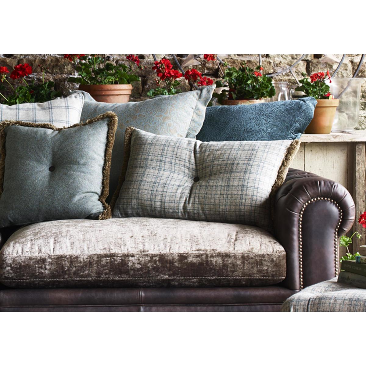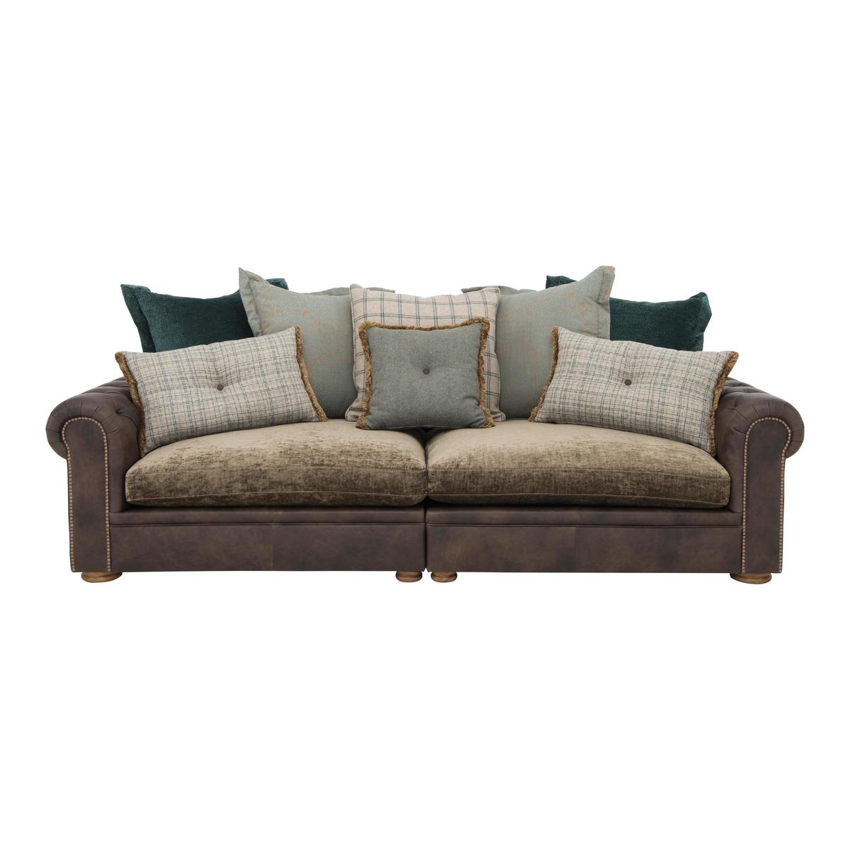 Large and inviting multi-textured 4 seater sofa is handcrafted. On trend mix of leather and fabric upholstery. Scatter back style with 5 coordinating fabric cushions. Buttoned scroll arm, antiqued studding, and weathered oak feet. Backs are foam with fibre, seats are foam with fibre and feather. Zig zag spring suspension, firm front edge seats keep their shape. Split back for easier manoeuvrability, comes with 2 scatters. Part of the New Romance Collection, only at Furniture Village