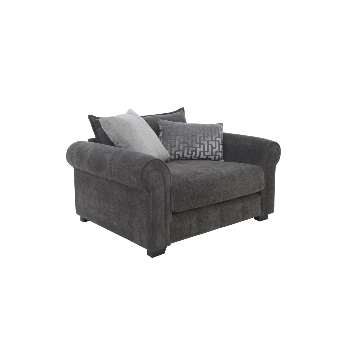 Take your shoes off, and snuggle up. The Alexander and James Sumptuous sofas and chairs feel like heaven, indulging you from head to toe with ultra-deep encore foam seats, sumptuous cushions and luxurious scatters and bolsters. The super soft touch velvet upholstery is sourced from the finest Italian mills. Hand applied piping and studding adds sparkle and style, while the front borders are finished with hand-quilted panels. Handcrafted exclusively for Furniture Village, the Sumptuous range is modular so you can create your own bespoke sofa. Classic glamour and indulgent comfort, on a grand scale. You can share this beautiful snuggler chair but you may want to keep the deep-seated, velvety loveliness all to yourself. Scatter and bolster included. Why you’ll love it It’s so luxuriously roomy it’s almost like a small sofa. Classic glamour with deep-seated comfort. Super-soft Italian velvet upholstery, in warm, sophisticated colours. Ultra-deep encore foam sprung seat. No-turn seat cushion with no plumping required. Soft, supportive pillow-style back cushion. One large velvet scatter and one reversible Deco-inspired bolster included. Beautiful. hand-applied chrome piping and studding. You can also choose gold piping, or piping in the sofa’s body fabric. Handcrafted exclusively for Furniture Village. What you need to know: Upholstery is soft touch, stonewashed, woven velvet. Pillow back cushions are fibre filled, arm cushions feather filled. One-sided seat cushion is high density encore foam. Bolster has velvet body fabric on one side, geometric pattern on the reverse. Handcrafted frame with solid hardwood rails. Light or dark wood feet. Feet and arms are removable. Some fabrics can show wear on areas of more use or in direct sunlight. Rotate seat and back cushions regularly if possible. Please read our upholstery care guide for more advice.