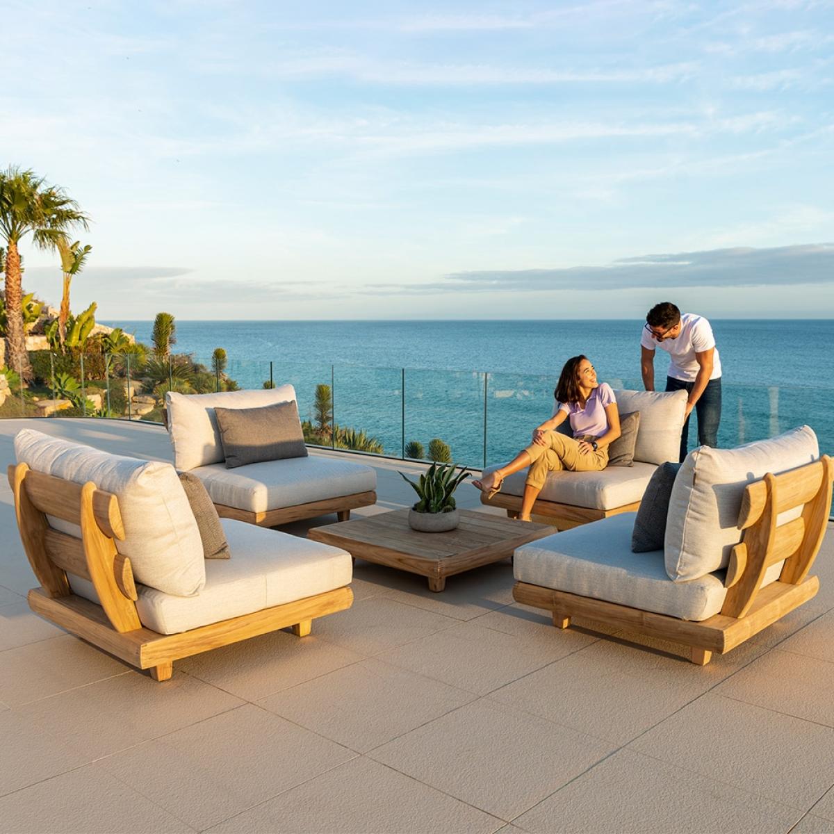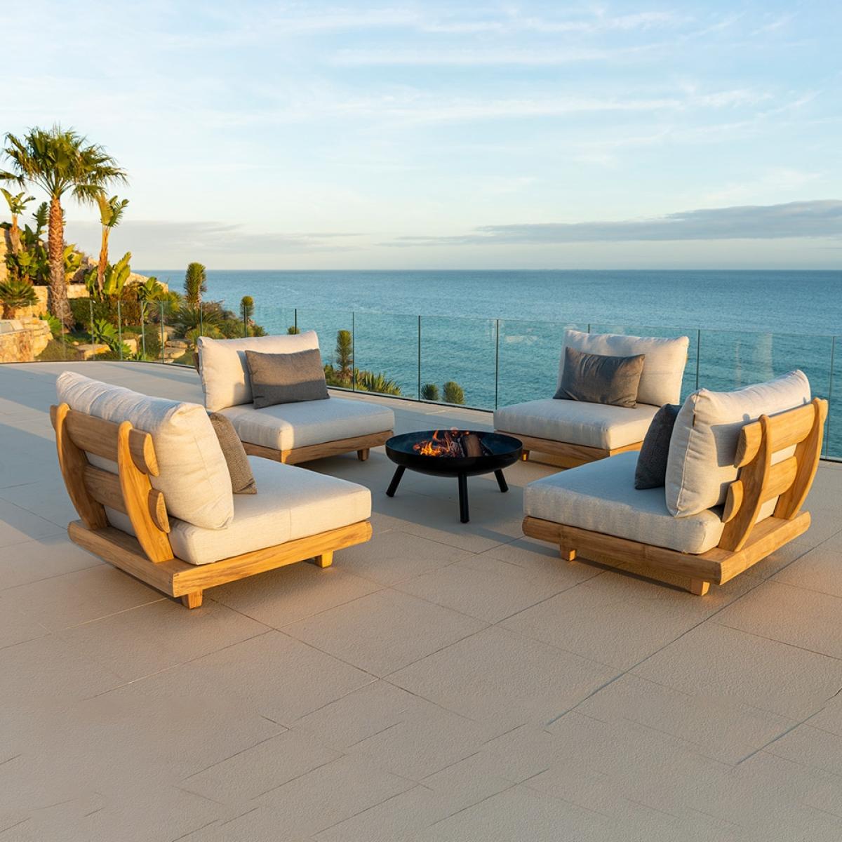 The Alexander Rose Sorrento 4 Seater Set is ideal for much needed catch ups and days spent in the garden with friends. Crafted from beautifully thick rounded  teak wood and complimented  with luxury deep filled cushions, you'll be sinking into full relaxation mode before you know it! The individual seats are the perfect set up for around a BBQ or cosy fire pit, gathering your loved ones for a well-needed reunion. If you're feeling a tad isolated, just push two of the chairs together and get snuggled up with your amigo and let the chit chat flow into the starry night!.