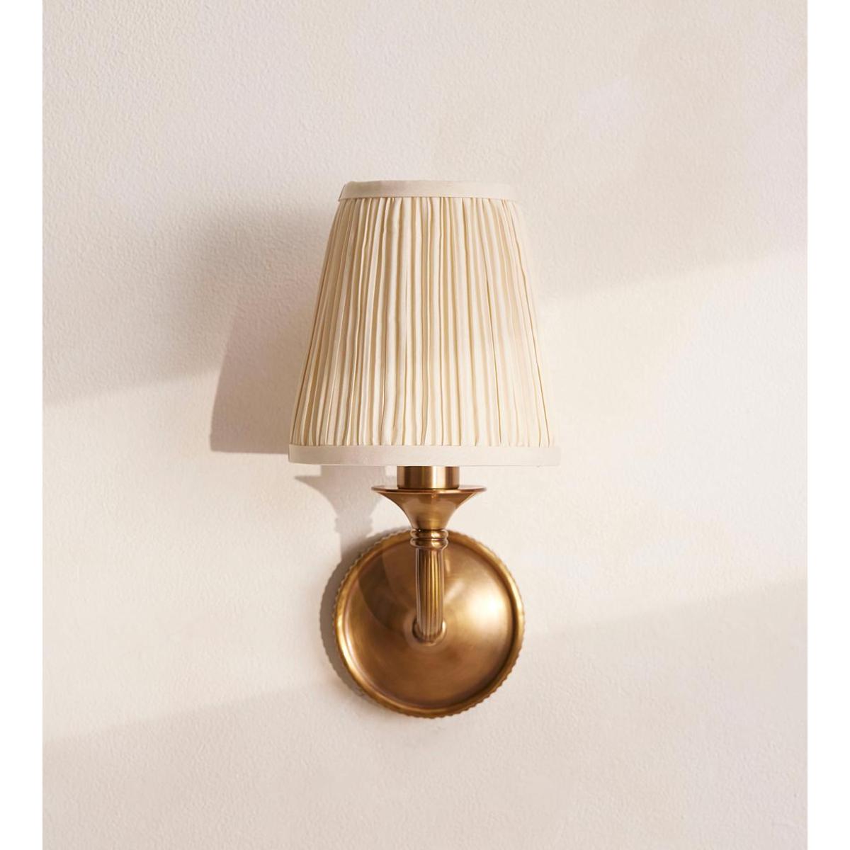 This wall light is crafted from real brass that's adorned with fine ribbed detailing around the arm. Inspired by the brass finishes and cosy pockets of light you'll find around Soho House 76 Dean Street, this wall-mounted lamp is topped with a pleated silk shade. A co-ordinating table lamp and floor lamp are also available.