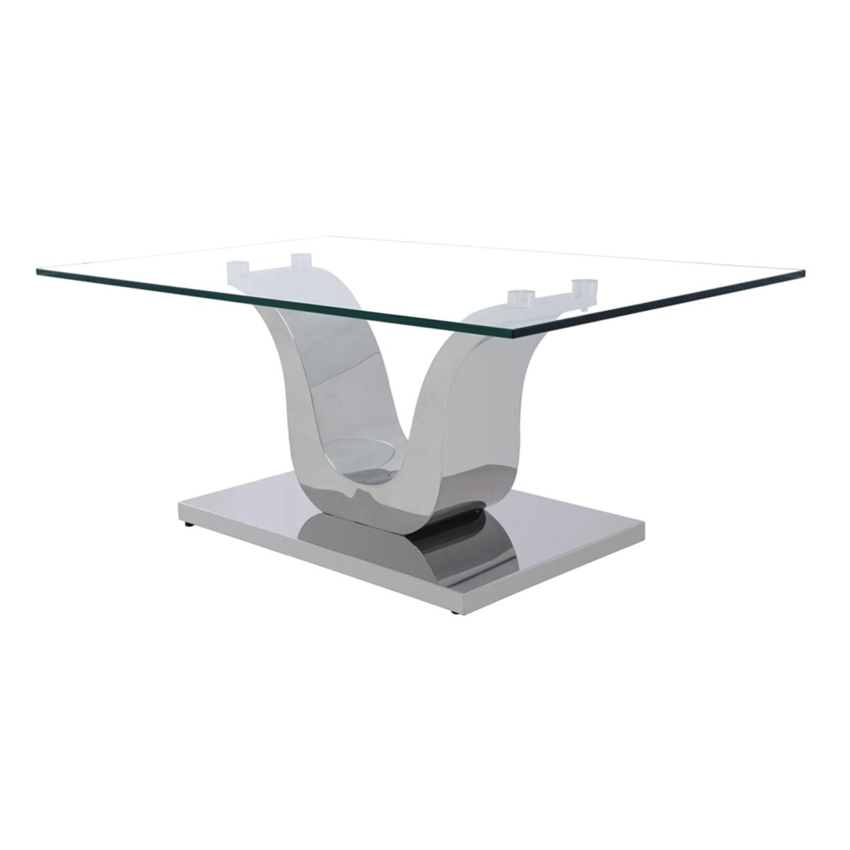 pInspired by Greco Roman architectural design the Alexandria glass chrome coffee table will usher in a sense of elegant style to any home decor. With its majestic U shaped pillar frame and bevelled edge polished glass, it's sure to impress every guest.pp. Made of high-quality stainless steel, the Alexandria glass and chrome coffee table is finished to a mirror shine, not only is this table stunning to look at but its strong and sturdy structure makes it ideal for everyday use. Complementing the base is a well-proportioned glass top measuring 110 x 70 cm, large enough for practical everyday use.p p. The 10mm thick tempered glass is toughened for safety and features bevelled edges with subtly rounded corners. The glass table top is attached to the base via 4 stainless steel discs bonded to the glass, not only are these fixtures an aesthetic detail in their own right but they ensure the clear coffee table remains a single solid structure.p