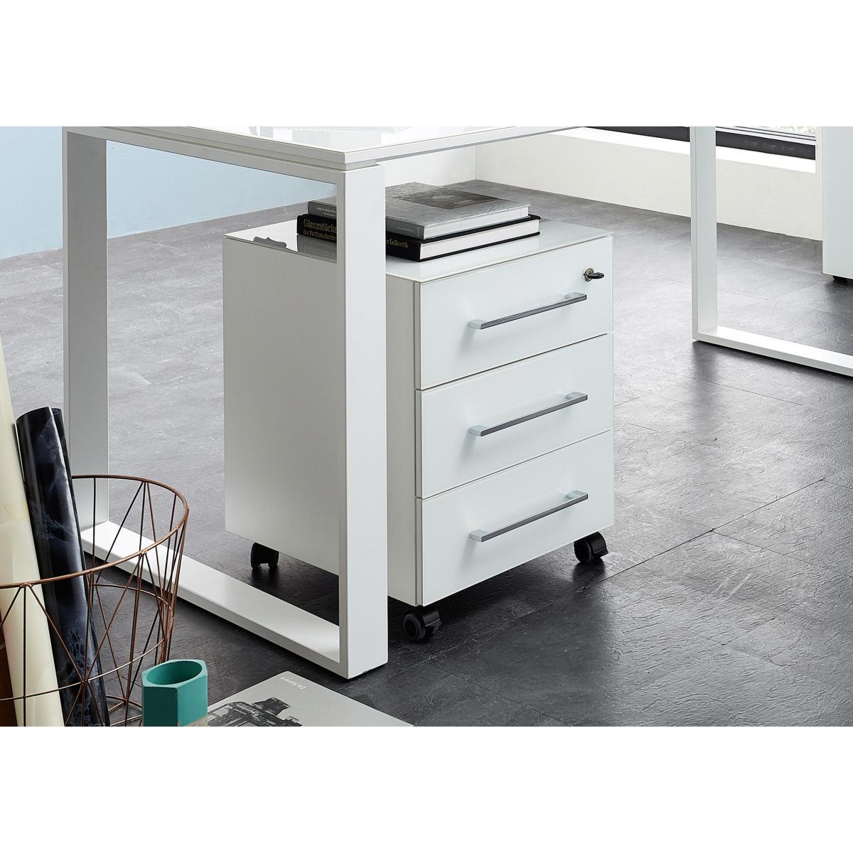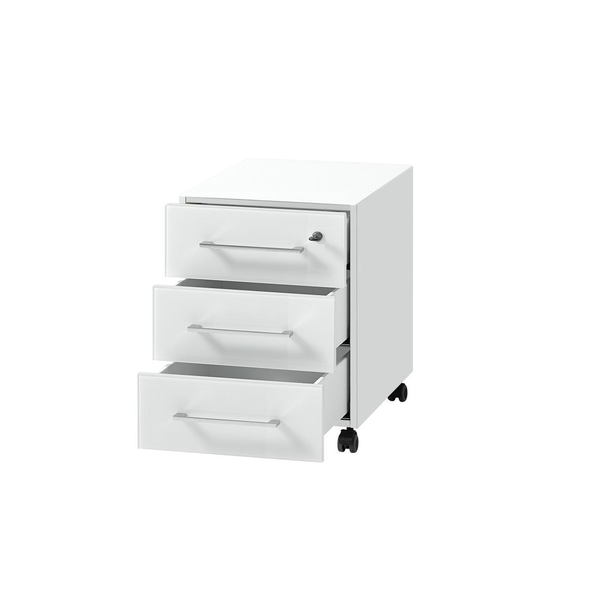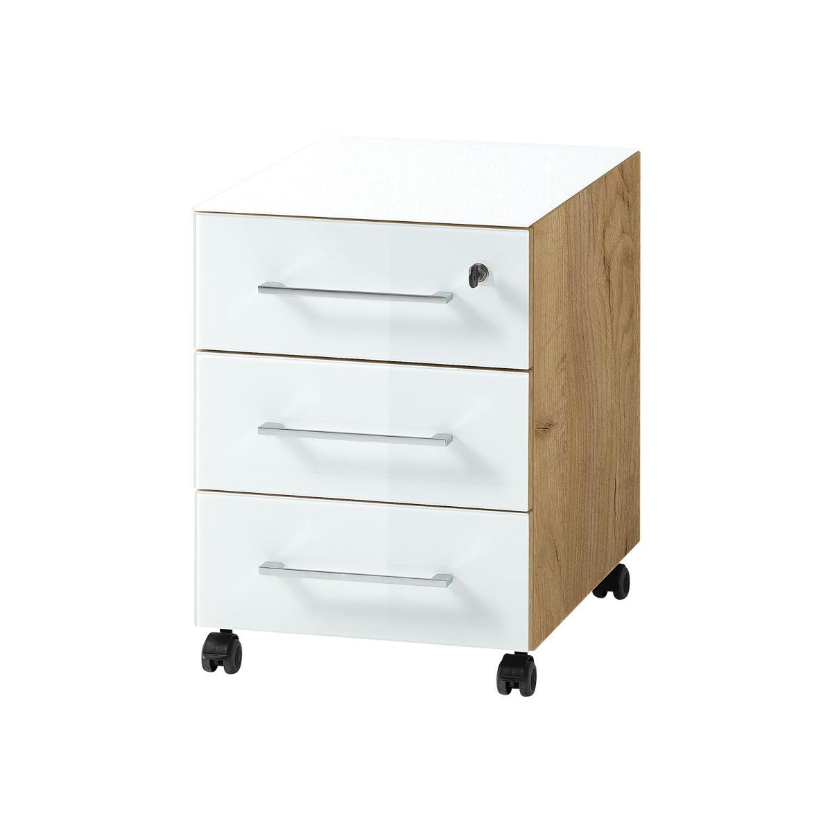 *This is a self-assembly item*. Sleek, compact and stylish pedestal unit on easy-to-move castors. With a white toughened safety glass top and drawer fronts. Choose a glossy white or white and Navarra oak finish. Why you’ll love it. Sleek and simply designed, ideal for home-working. Modern, minimalist style. In a white or white and Navarra oak effect finish. White glass top and white glass drawer fronts. Lockable for security, and on easy-move castors. Three self-close drawers, with chrome-finish linear handles. German designed and precision made, at a great value price. What you need to know. Easy self-assembly required, full instructions included. Construction is particle board with a melamine resin finish. Haptic wood finish resembles real wood in look and texture. The finish safeguards against scratches, stains and heat damage. Protective ‘ABS’ edging adds durability. Top and door fronts are toughened safety glass. Part of the Alexi coordinated home office range.