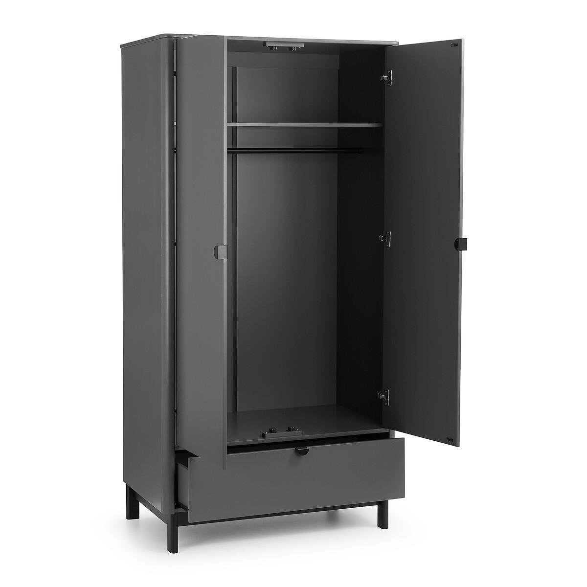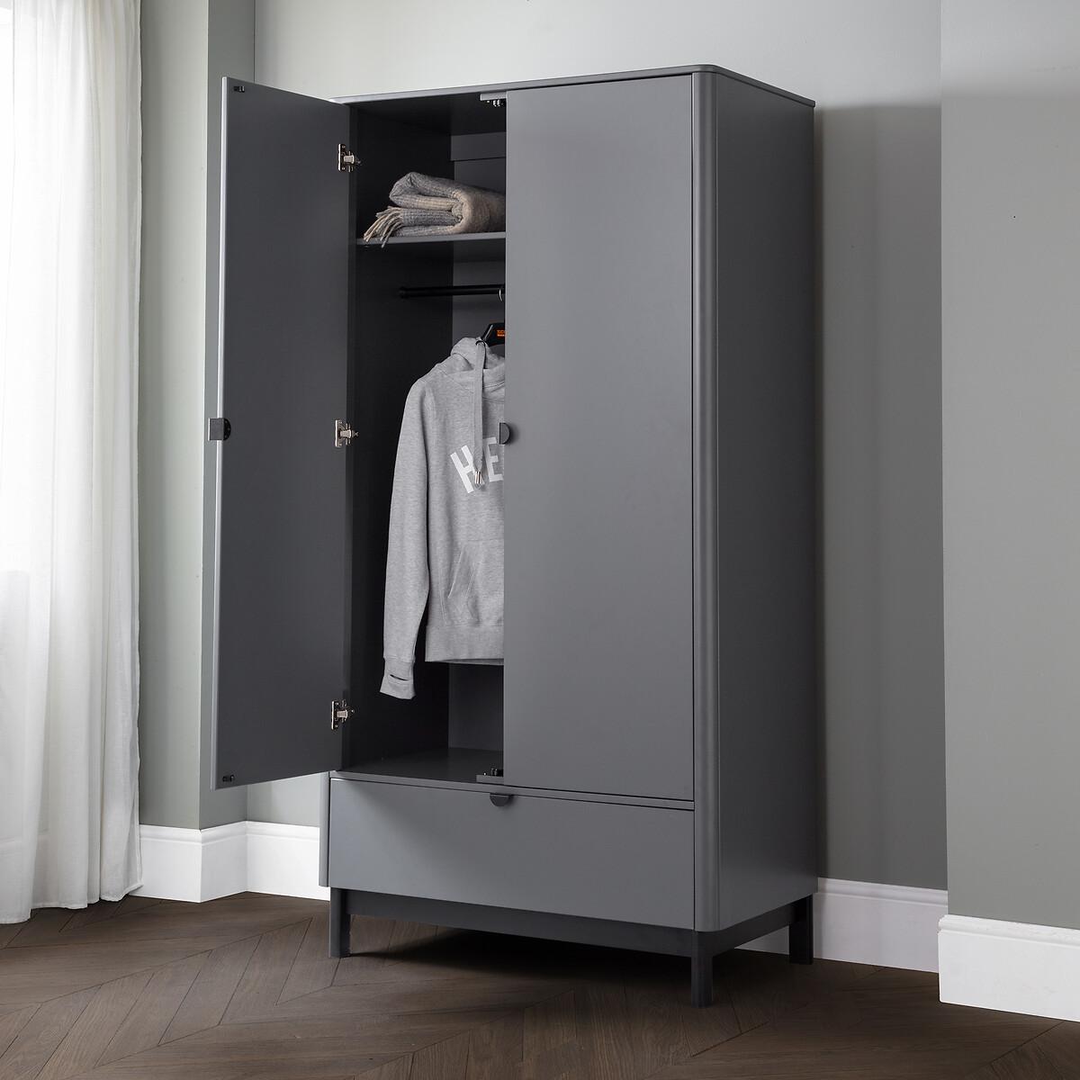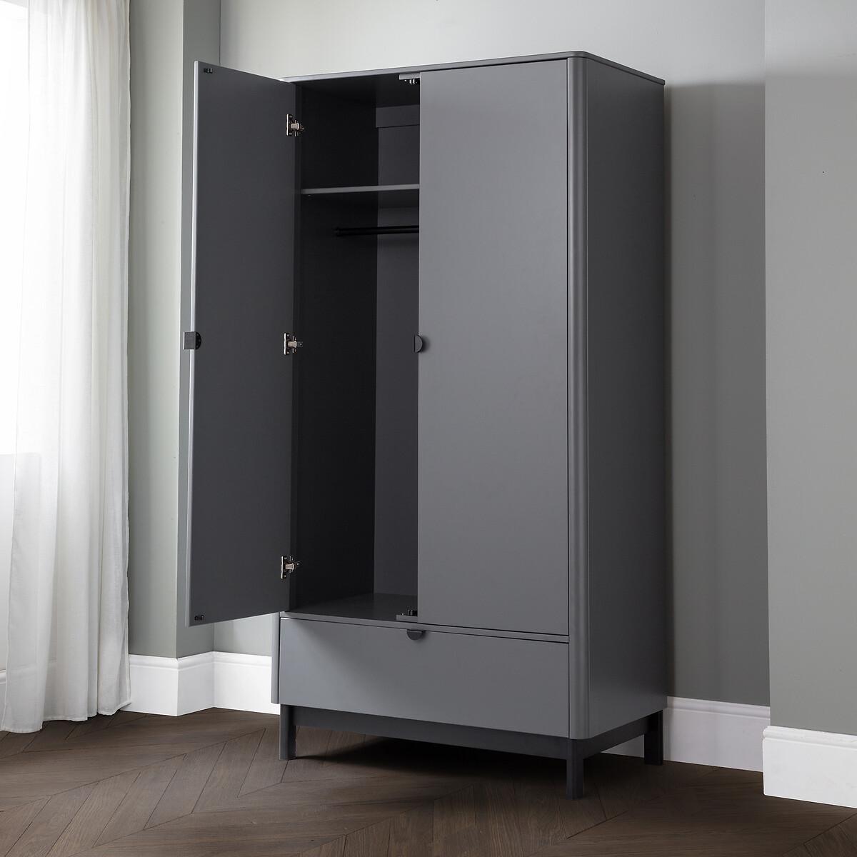 The Alexis Bedroom collection has a modern, retro style finished in a storm grey lacquer with satin black wooden legs and handles. The corners are rounded for a softer look, creating perfect balance between style and functionality. This wardrobe features a large hanging area behind 2 doors, along with a drawer for additional storage. Product details • 2 door wardrobe • Single hanging rail • Storage drawer • Lacquered doors and carcase • Satin black handles • Rounded corners • Square matte black feet • Assembly required • Fixings supplied • 12 month manufacturers warranty. Product Composition - 95% Wood, 5% Metal. Product Dimensions - 55 cm x95 cm x190 cm , Weight - 65 KGParcel 1 Packaged Dimensions - 181.5 cm x 53.5 cm x 13.5 cm, Weight 45.9 kg Parcel 2 Packaged Dimensions - 106 cm x 62 cm x 16 cm, Weight 31 kg. Please note: this product cannot be be delivered to all Offshore Islands Northern Ireland or Republic of Ireland. This product will be dispatched by one of our trusted suppliers. You’ll be contacted by their selected courier about your delivery.