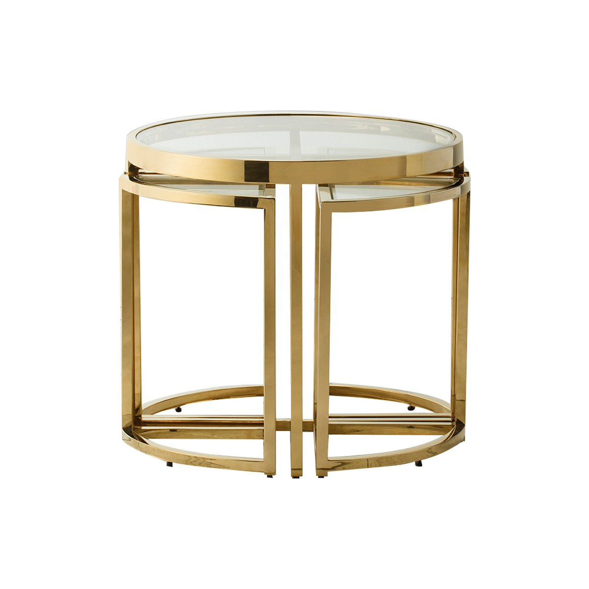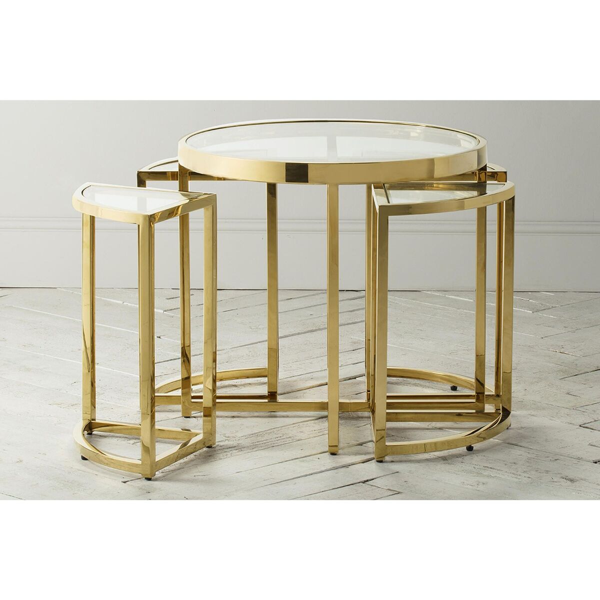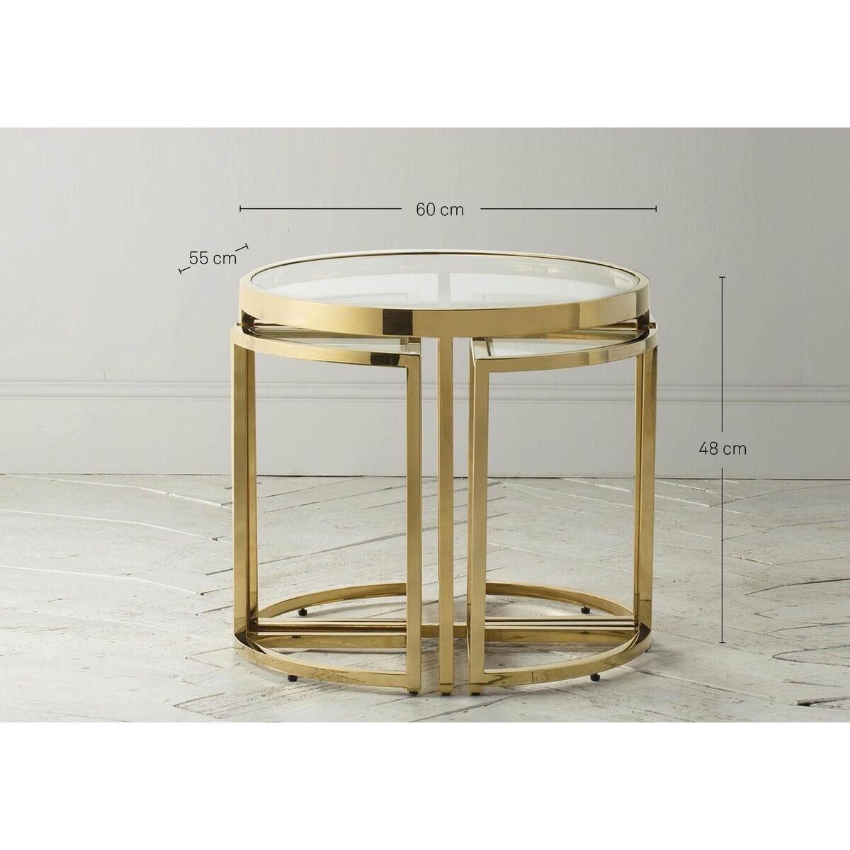For the everyday that feels naturally luxurious. Add a touch of glam with the Alexis range, perfect for traditional interiors and neutral palettes in search of dazzling pieces with the wow factor. Modern and eye catching this range features a unique nesting design with a sumptuous golden finish and a clear glass top to create the perfect side table. Add just the simplest of accessories to make this piece truly pop, a faux plant, tray or vase is all it takes. More Information: Materials:Metal, GlassDimensions:H:48cm x W:60cm x D:55cm; 22kgs Assembly Required: No