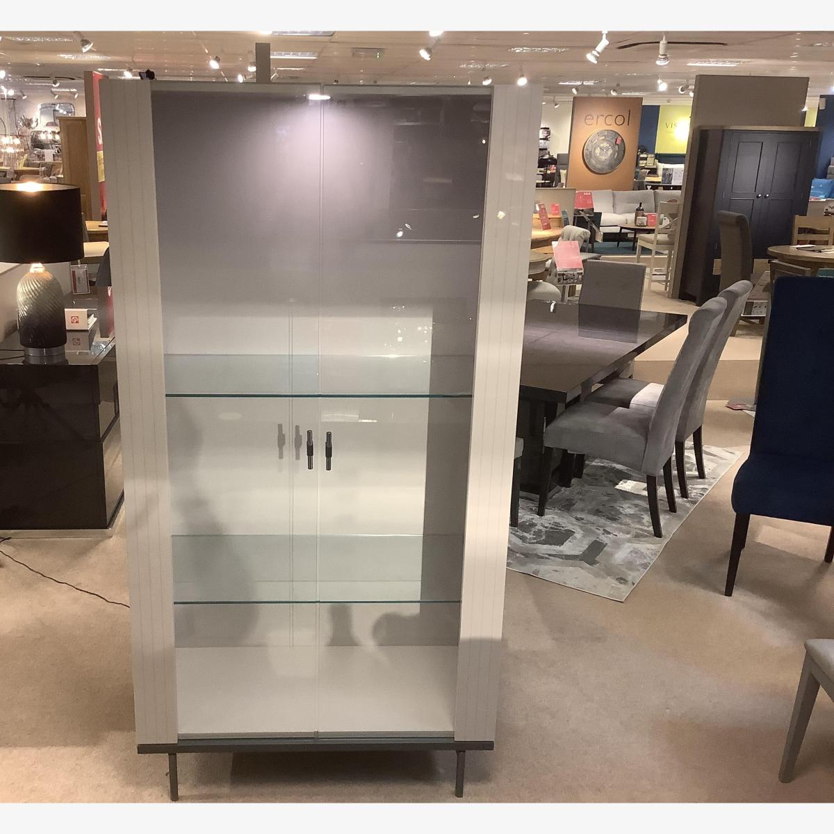 Show off your treasured possessions, trophies or whatever you want in this luxurious high- gloss and glass curio cabinet from Italian Furniture makers ALF. High- end style at a great value price. Why you'll love it Sleek, glossy modern display unit from ALF. With inbuilt lighting to show off all your treasures. Two adjustable glass shelves behind two glass doors. Stunning high- gloss lacquer finish in warm pearl. Six coats of lacquer for a high shine, durable finish. Distinctive vertical etching on the front. Fantastic value price for high- end style. Designed and made in Italy exclusively for Furniture Village What you need to know Two adjustable tempered glass shelves. Two tempered glass doors. Wood and particle board construction. Pearl coloured high gloss lacquer finish. Legs and door handles are dark grey precision milled steel. Cabinet doors may need aligning over time. Conditon Right hand door has a screw missing from middle hinge.