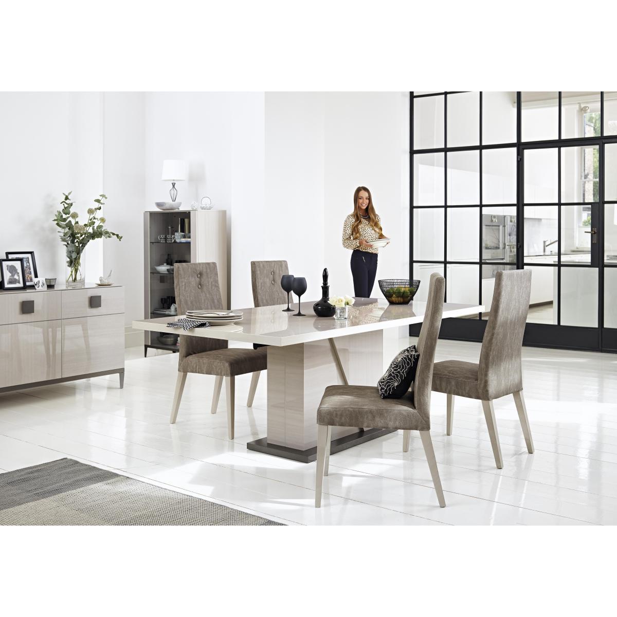 The Italians know a thing or two about style and glamour, as this sleek contemporary dining and living collection from ALF shows. Each piece is finished with luxurious cream coloured Koto wood veneers while detailing includes distinctive square wooden handles and fashionably tapered legs. Your guests may never want to say ciao!. Italian designed glass fronted curio cabinet. Clean, contemporary lines. Lacquered light Koto wood veneers. Distinctive square wooden handles. Three glass shelves inside. Short, tapered legs. Designed exclusively for Furniture Village. Did you know?. Hairline marks are a natural feature of this furniture's high gloss finish. As the finish varies, the extension leaves cannot exactly match the table top.