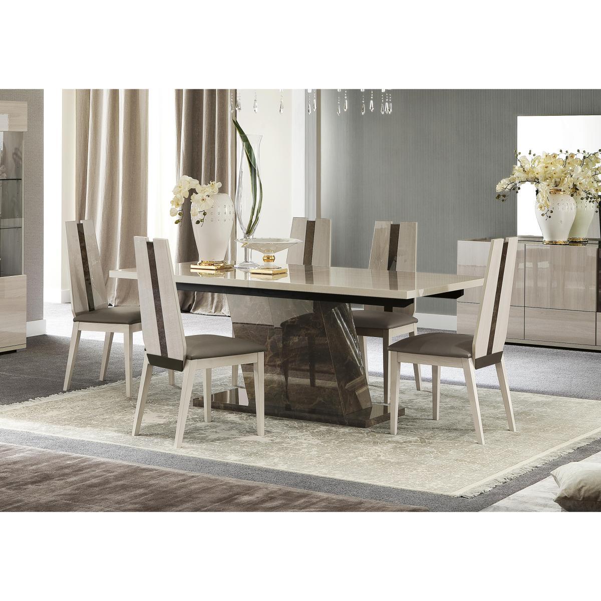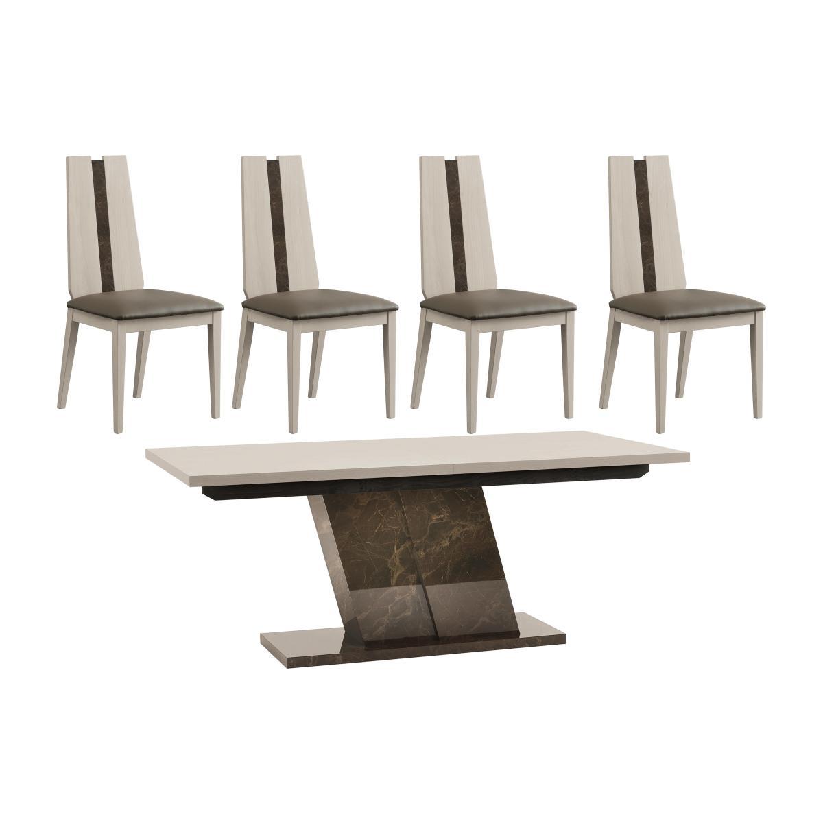 Exciting modern Italian style at its finest. The bold and contemporary Andorra dining collection combines wood finished with glossy pale elm veneers with a luxurious dark Emperador marble-like stone. Linear, angular lines create a striking look - from the dining table's angled pedestal base to the shaped chair backs with stone insets. Ultra-modern Italian dining style from master furniture crafters ALF. Striking dining table has angled base made of Emperador stone. Dining chairs feature bold angles and glossy wood veneers. With its stylish angles and fabulous finish, the ALF Andorra dining table and 4 dining chairs dining set epitomises the very best of exciting, modern Italian furniture design. The large dining table features a show stopping angled pedestal base crafted from smooth and glossy marble-like Emperador stone, and has a solid wood top finished with eco-friendly high-gloss elm veneers, beautifully pale and interesting. The perfect look for a luxurious and stylish dining room, this exceptional dining table extends to seat ten in splendid style. It’s paired with four coordinating dining chairs with solid wood frames. Chairs have bold lines and are finished with glossy elm veneers. They feature striking Emperador stone inset panels and have softly-cushioned seats upholstered in grey faux leather. Made in Italy, the ALF Andorra dining table and 4 dining chairs dining set represents high-end contemporary design from master furniture crafters ALF. Did you know?. Hairline marks are a natural feature of this furniture's beautiful, high gloss finish.