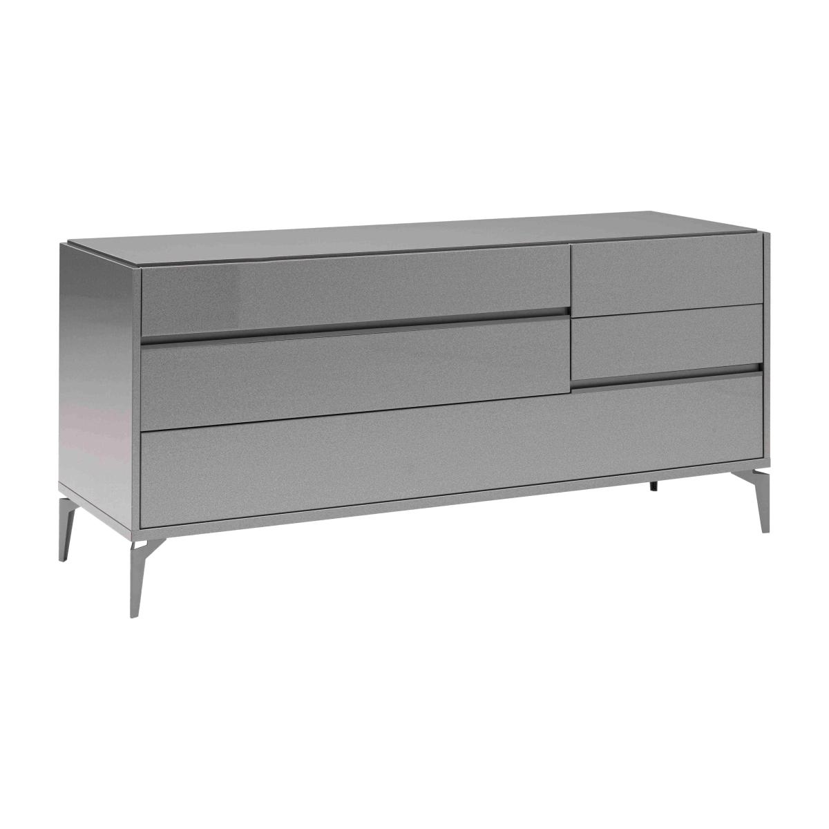 The ALF Cristina bedroom range makes it easy to create a sophisticated modern glam bedroom retreat. This carefully curated collection offers a statement king size bedroom and a choice of bedroom storage furniture all of which showcase the range's signature high-gloss lacquered finish – seven layers deep – in on-trend graphite grey. Mix and match the low dresser with the tall chest of drawers, and complete the perfect storage arrangement with a nightstand or two. The collection's sleek style is matched only by its smooth functionality. Drawer units offer spacious and well-designed storage, and all drawers are fitted with Blum soft-close mechanisms. Handmade in Italy. This dresser is the new essential bedroom storage piece. Sleek and low, it has five roomy drawers of varying sizes that makes organising clothes and accessories a delight. Why you'll love it Unique multi-drawer dresser is sleek and spacious. Modern glam Italian style. Beautiful high-gloss lacquered finish is 7 layers deep. In on-trend graphite grey. Cool asymmetric drawer setup offers versatile storage options. Hidden metal finger pulls ensure a sleek silhouette. Blum soft-close mechanisms. Handmade in Italy. Exclusive to Furniture Village and only available online. This dresser is part of the ALF Cristina bedroom collection. What you need to know 5 drawers. Metal legs. The high-gloss finish may show surface scratches under certain lighting. Do not place in direct sunlight. Do not use abrasive cleaning products. Wipe clean with a damp cloth, and dry with a soft duster. We recommend using coasters and placemats at all times. Love the look? Explore our ALF Cristina dining collection.