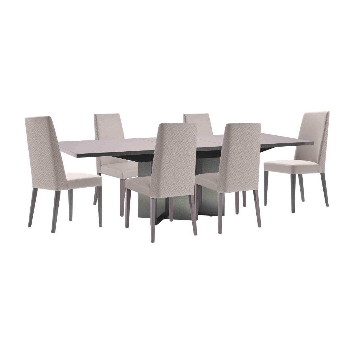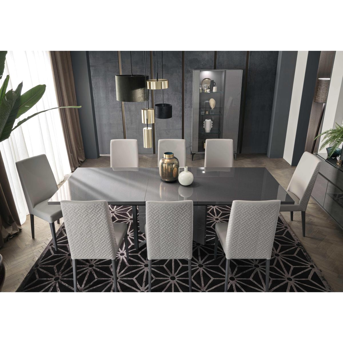 Effortlessly elegant, the modern glam ALF Cristina dining collection brings together a fabulous high-gloss graphite-grey lacquered finish and truly distinctive furniture design in the form of eye-catching table bases and creative use of metal accents. As with all ALF furniture, this range is both lovely to look at and a delight to live with. The statement dining table smoothly extends in seconds, storage furniture offers well-designed spaces enhanced by soft-closing doors and drawers, occasional tables have smoked glass tops over alcoves and shelves, and display cabinets feature built-in lighting. In short, everything works beautifully and looks incredible. Handmade in Italy. Bold and beautiful, this dining set brings together a stunning high-gloss table finish with six elegant dining chairs. The extending table seats up to ten. Handmade in Italy. Why you'll love it This design-led dining set will be a talking point at any dinner party. Modern glam Italian style. Table’s high-gloss finish is 7 layers deep, the result of a painstaking process. Distinctively different wood and metal base. In striking yet versatile graphite. Extension leaf is stored within the table. Slides into place in seconds. Dining set includes 6 dining chairs with lacquered wood legs. Upholstered in pale taupe faux leather with basket weave-effect stitching. Handmade in Italy. Exclusive to Furniture Village. This dining set is part of the ALF Cristina dining collection. What you need to know Chair cushioning is made of foam. Wood frame and legs. Table seats 8 and extends to seat 10. Supplied with a centre extension leaf. Extension leaf can be stored under the table top when not in use. The high-gloss finish may show surface scratches under certain lighting. Do not place in direct sunlight. Do not use abrasive cleaning products. Wipe clean with a damp cloth, and dry with a soft duster. We recommend using coasters and placemats at all times. Love the look? Explore our ALF Cristina bedroom collection.