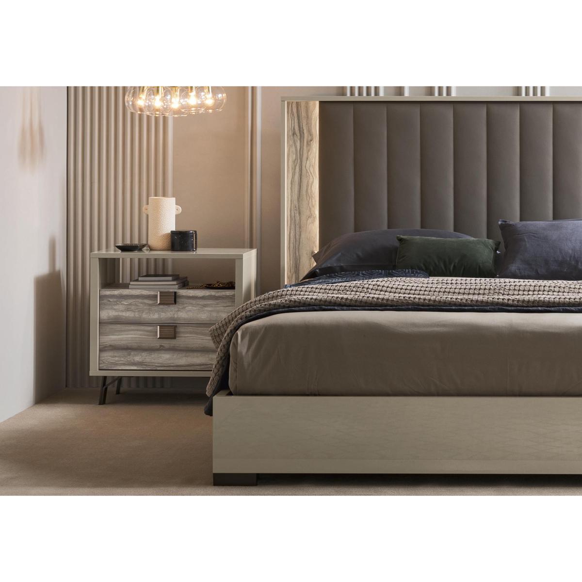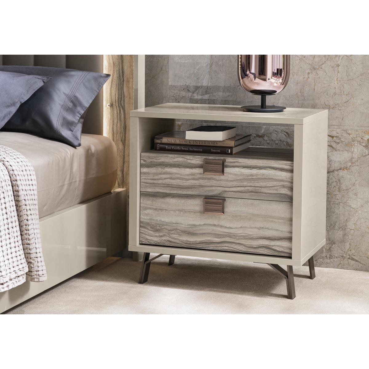 If you’re looking for bedroom furniture that has the wow factor – in an entirely contemporary Italian way – you’ve found it. With its uniquely stylish finish that’s a combination of high-gloss and matt surfaces, the ALF Franco bedroom range instantly says distinctive Italian style. This carefully-curated collection comprises a statement bed frame with a tall upholstered headboard, several sizes of chests of drawers and two styles of bedside cabinet. The details are lovely too – drawers have a bold marbled accent pattern and bronze-coloured handles. An online exclusive, the ALF Franco bedroom furniture collection is handcrafted in Italy. The ALF Franco range also includes living room and dining room furniture. You can always rely on ALF to design furniture that’s ultra-stylish and beautifully functional – like this bedside cabinet with two roomy drawers and a handy alcove shelf. Handmade in Italy. Why you'll love it Fabulous and functional 2-drawer bedside cabinet with open shelf. A truly different look from this Italian design house. High-gloss frame and marbled, matt-finish drawers make a statement. Soft-closing drawers have bronze-coloured handles. Durable finish stands up to scratches and scuffs. Handmade in Italy. A Furniture Village online exclusive. This 2-drawer bedside cabinet with open shelf is part of the ALF Franco bedroom collection. What you need to know Finish may show small scratches as a result of the polishing process. Do not place in direct sunlight. Do not use abrasive cleaning products. Wipe clean with a damp cloth, and dry with a soft duster. We recommend using coasters and placemats at all times. The ALF Franco look is also available in living and dining room furniture. WARNING!