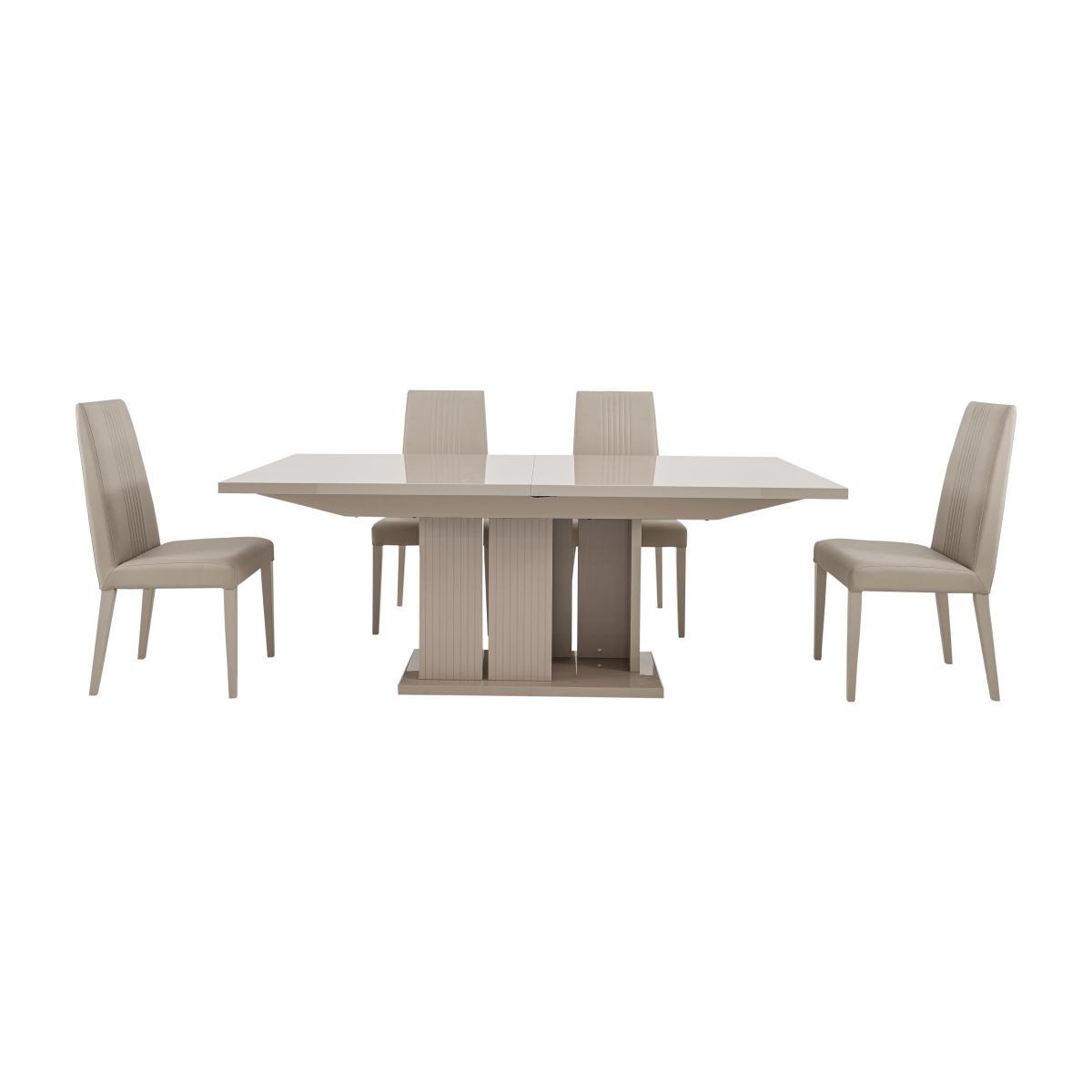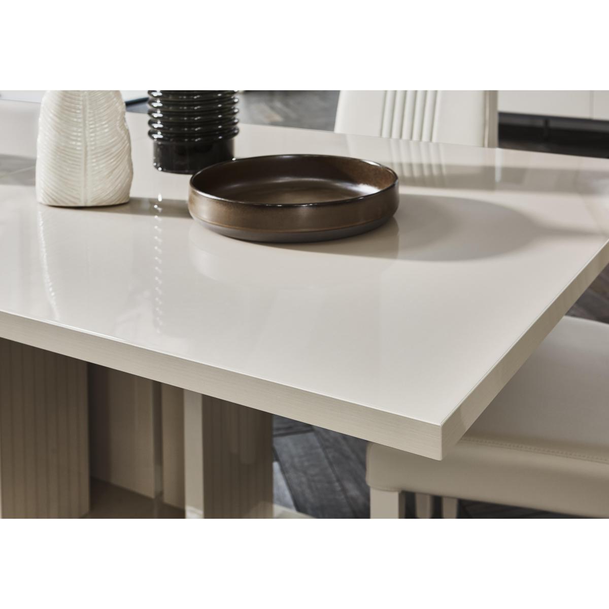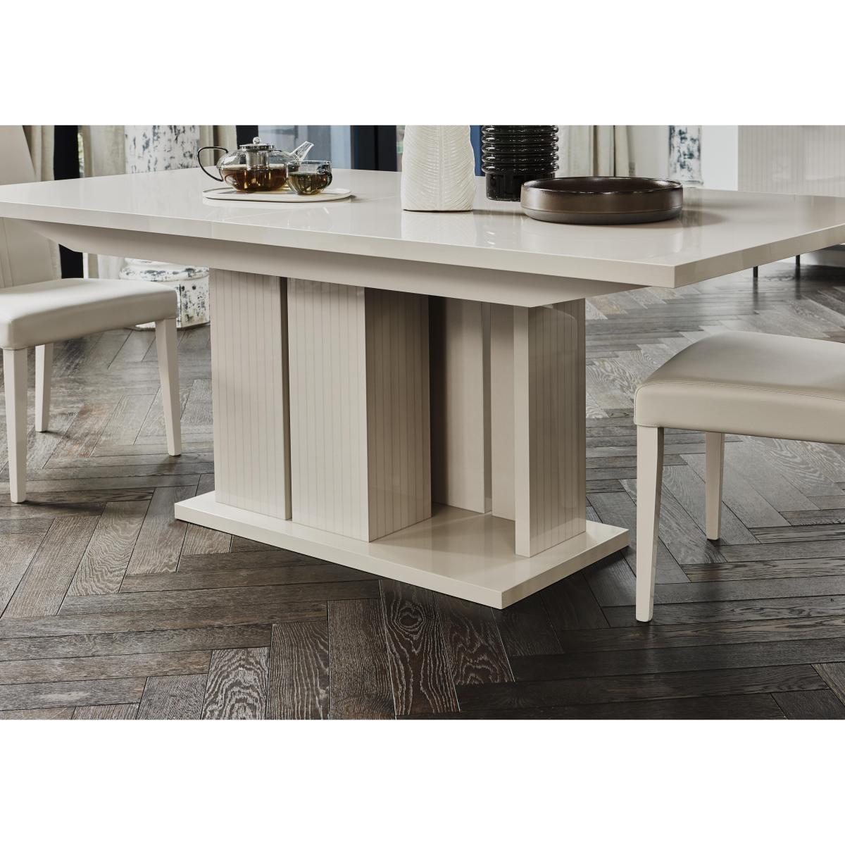 Luxurious modern Italian design by ALF. High-gloss lacquered dining table with 4 faux leather dining chairs in a pale pearl colour. The small table extends to seat up to eight, the large up to ten. Exclusive to Furniture Village. Why you'll love it. Glamorous, contemporary dining set from ALF. Sleek, streamlined Italian design. Table in a stunning high-gloss finish in warm pearl. Six coats of lacquer for a high shine, durable finish. Striking statement pedestal base has vertical etching detailing. Small table seats 8 when fully extended, the large table up to ten. With 4 elegant high backed faux leather dining chairs. Designed and made in Italy exclusively for Furniture Village. What you need to know. Table extends on runners. Extension leaf can be hidden in compartment under the table top. Wood and particle board construction. Pearl coloured high gloss lacquer finish. The lacquering process is labour and time intensive, with multiple layers of lacquer applied and dried under UV light, for a clean finish that is highly durable. Hairline marks are a natural feature of this furniture's high gloss finish. Polyurethane and like surfaces can reveal the polishing process in the form of small scratches. Faux leather is water-resistant and easy to clean. Avoid abrasive cleaners and direct sunlight. Wipe clean with a damp cloth and dry with a soft duster. Coasters and placemats are recommended. Part of the extensive ALF Livia dining range of dining sets and occasional furniture.