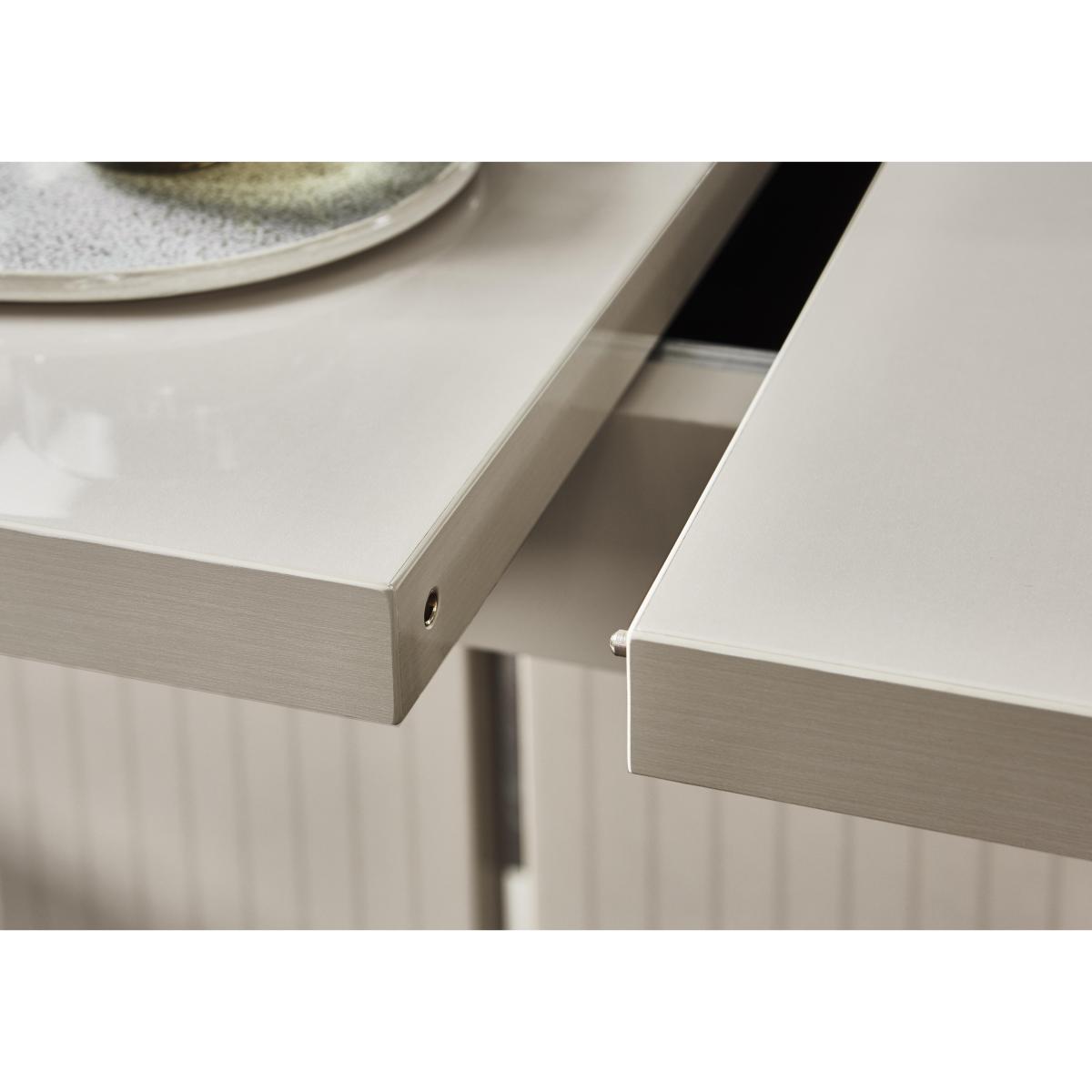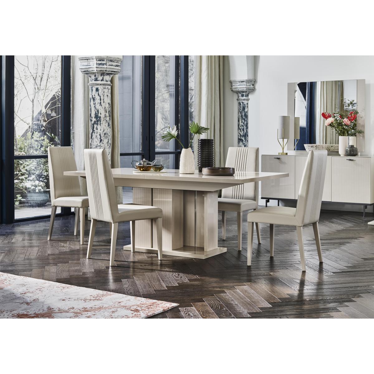 Luxurious modern Italian design by ALF. High-gloss lacquered dining table with 4 faux leather dining chairs in a pale pearl colour. The small table extends to seat up to eight, the large up to ten. Exclusive to Furniture Village. Why you'll love it. Glamorous, contemporary dining set from ALF. Sleek, streamlined Italian design. Table in a stunning high-gloss finish in warm pearl. Six coats of lacquer for a high shine, durable finish. Striking statement pedestal base has vertical etching detailing. Small table seats 8 when fully extended, the large table up to ten. With 4 elegant high backed faux leather dining chairs. Designed and made in Italy exclusively for Furniture Village. What you need to know. Table extends on runners. Extension leaf can be hidden in compartment under the table top. Wood and particle board construction. Pearl coloured high gloss lacquer finish. The lacquering process is labour and time intensive, with multiple layers of lacquer applied and dried under UV light, for a clean finish that is highly durable. Hairline marks are a natural feature of this furniture's high gloss finish. Polyurethane and like surfaces can reveal the polishing process in the form of small scratches. Faux leather is water-resistant and easy to clean. Avoid abrasive cleaners and direct sunlight. Wipe clean with a damp cloth and dry with a soft duster. Coasters and placemats are recommended. Part of the extensive ALF Livia dining range of dining sets and occasional furniture.