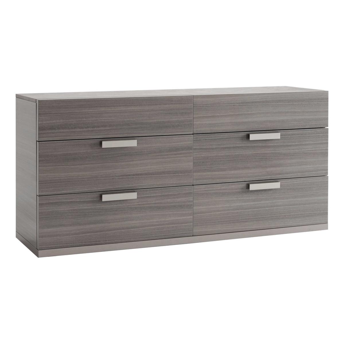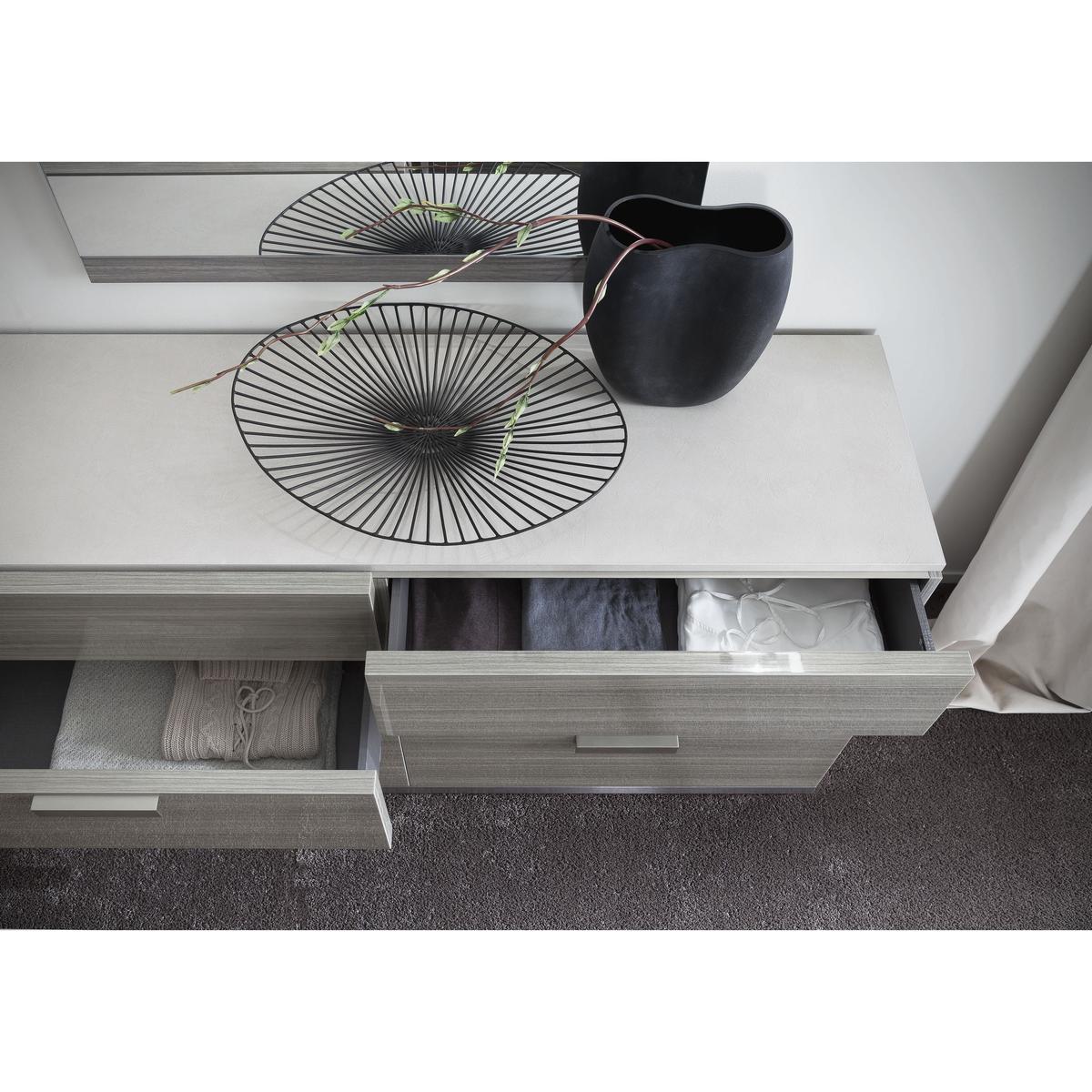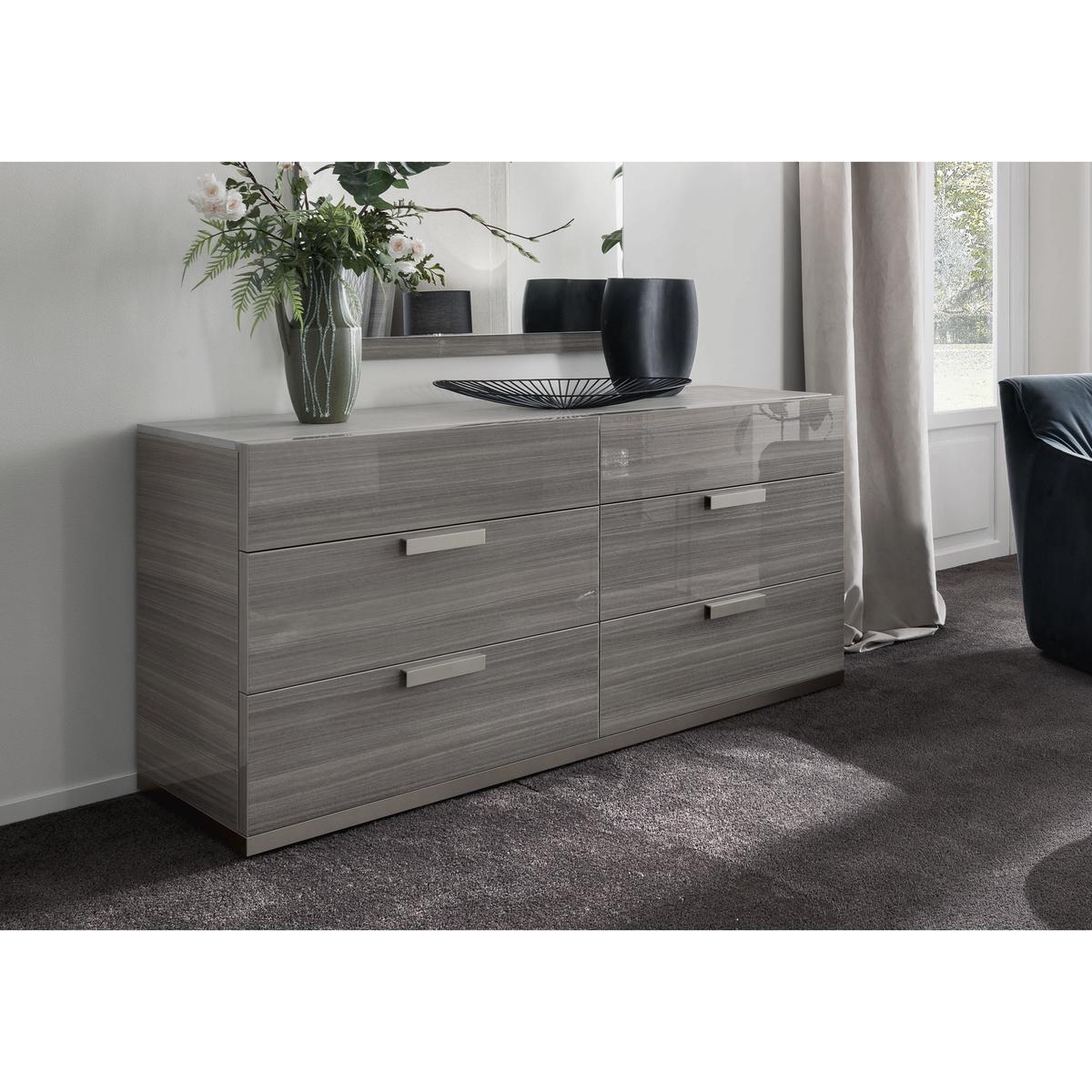 Made in Italy by ALF, furniture makers of renown, the ALF Movado bedroom collection combines sophisticated style with ingenious functionality and, of course, superb craftsmanship. This wide collection comprises wardrobes, chests of drawers, bedside cabinets, bedframes and more, all of which features the range’s signature stunning high-gloss grey finish. Concrete-like cabinet tops have a modern-industrial look, and soft-closing doors and drawers are finished with chrome-effect handles. Style is matched only by the well designed and precisely engineered storage spaces. ALF Movado is exclusively available at Furniture Village. High-gloss grey finish with 7 coats of lacquer. Well-crafted contemporary Italian style. Made by ALF and exclusive to Furniture Village. Showcasing ALF’s commitment to both well-designed functionality and a sleek luxurious finish, the ALF Movado 6 drawer chest of drawers is the perfect large chest of drawers for the contemporary bedroom. Like all pieces in the fabulous ALF Movado collection, it features a gorgeous high-gloss grey finish that’s sleek, stylish and very sophisticated. The concrete-like top and chrome-effect handles add just the right amount of contemporary style. Drawers are arranged in two stacks of three drawers, which means this chest also offers a large surface area on which you can create a beautiful display of framed family photos or favourite pieces of glassware. The ALF Movado 6 drawer chest of drawers is part of the extensive ALF Movado bedroom collection. Centred around an impressive bedframe that’s available in king and super king sizes, this stylish collection includes a wide range of storage pieces including wardrobes, chests of drawers and bedside cabinets. Made in Italy and exclusive to Furniture Village. Hairline marks are a natural feature of this beautiful high gloss finish.