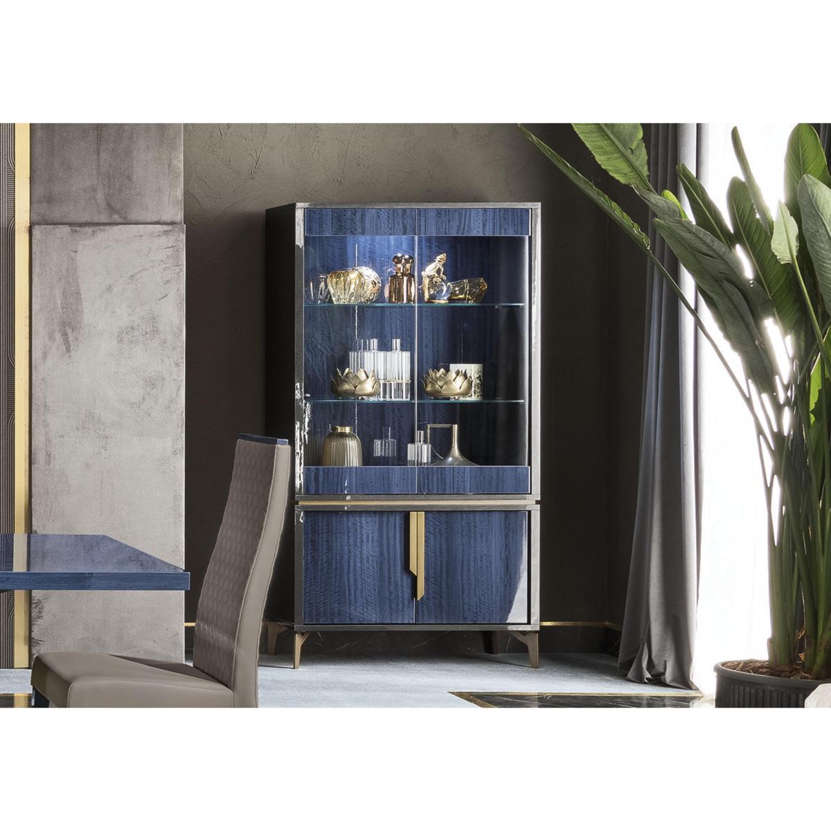 Storage gets a glamorous makeover with the ALF Oceanum cabinet. Featuring LED lights and stunning gold accents, this sleek Italian design beautifully spotlights the pieces you love the most. Why you'll love it. Luxury two door cabinet from prestigious Italian design house ALF. LED-lit display highlights all of your most treasured possessions. Large scale glass design for all your glassware, ceramic pieces and books. Two full-height soft-closing glass doors and fixed glass shelves. Two soft-closing wooden doors and fixed shelves on the base. Attractive brushed brass handles and legs. High-gloss effect in a stunning deep blue cobalt shade. Beautiful and incredibly durable seven-layer lacquered finish. Handcrafted in Italy. What you need to know. The cabinet is made from natural eucalyptus wood veneers and glass. Finish may show some very light marks as a result of the buffing process. Slight differences are not defects but rather provide added artisanal value. Avoid abrasive cleaners. Wipe with a damp cloth. Part of the contemporary bedroom and living room collection from ALF Italia. WARNING!. Furniture can tip over unexpectedly and cause injury. This item should be fixed to a wall using the anti-tip kit provided with the furniture. Be sure to use the correct wall fixings suitable for the walls in your home.