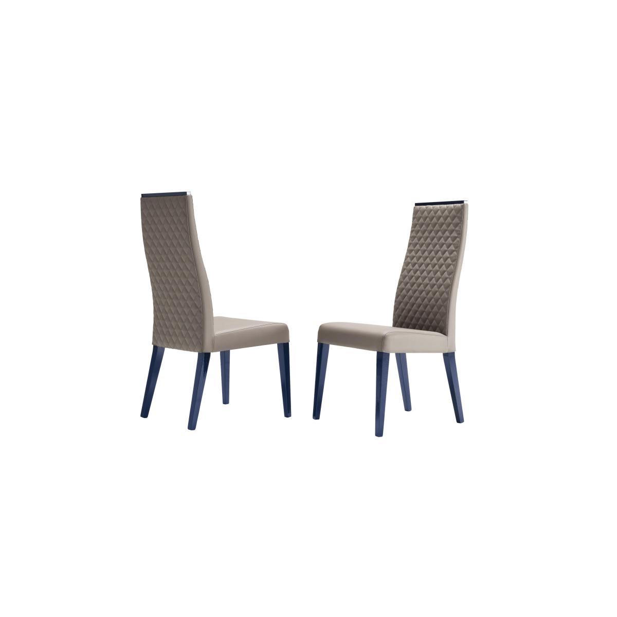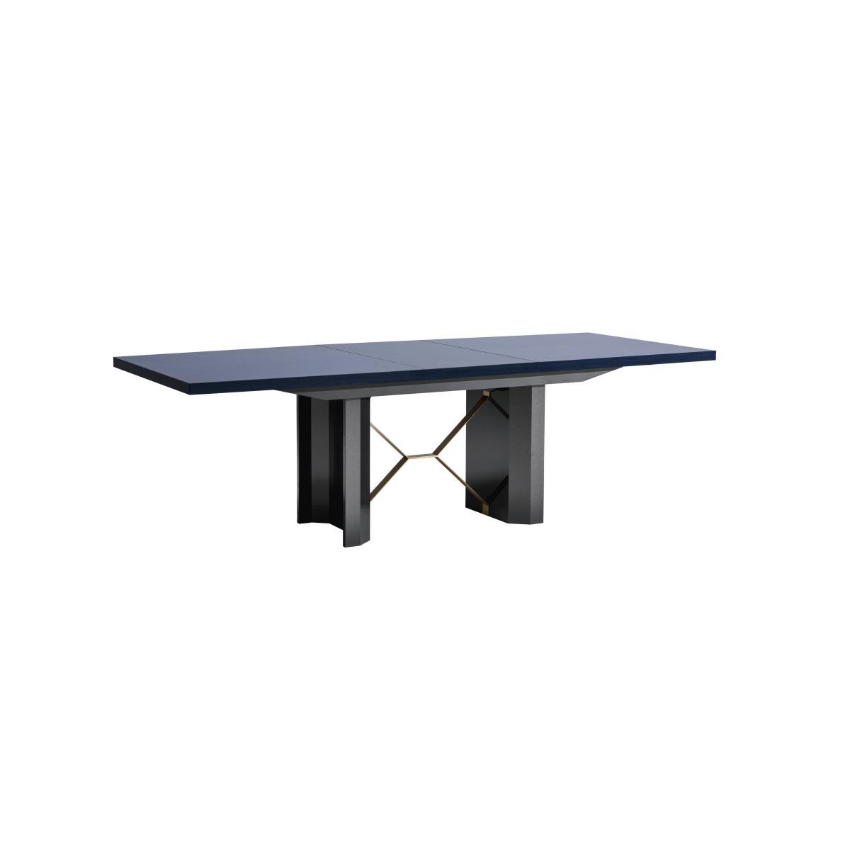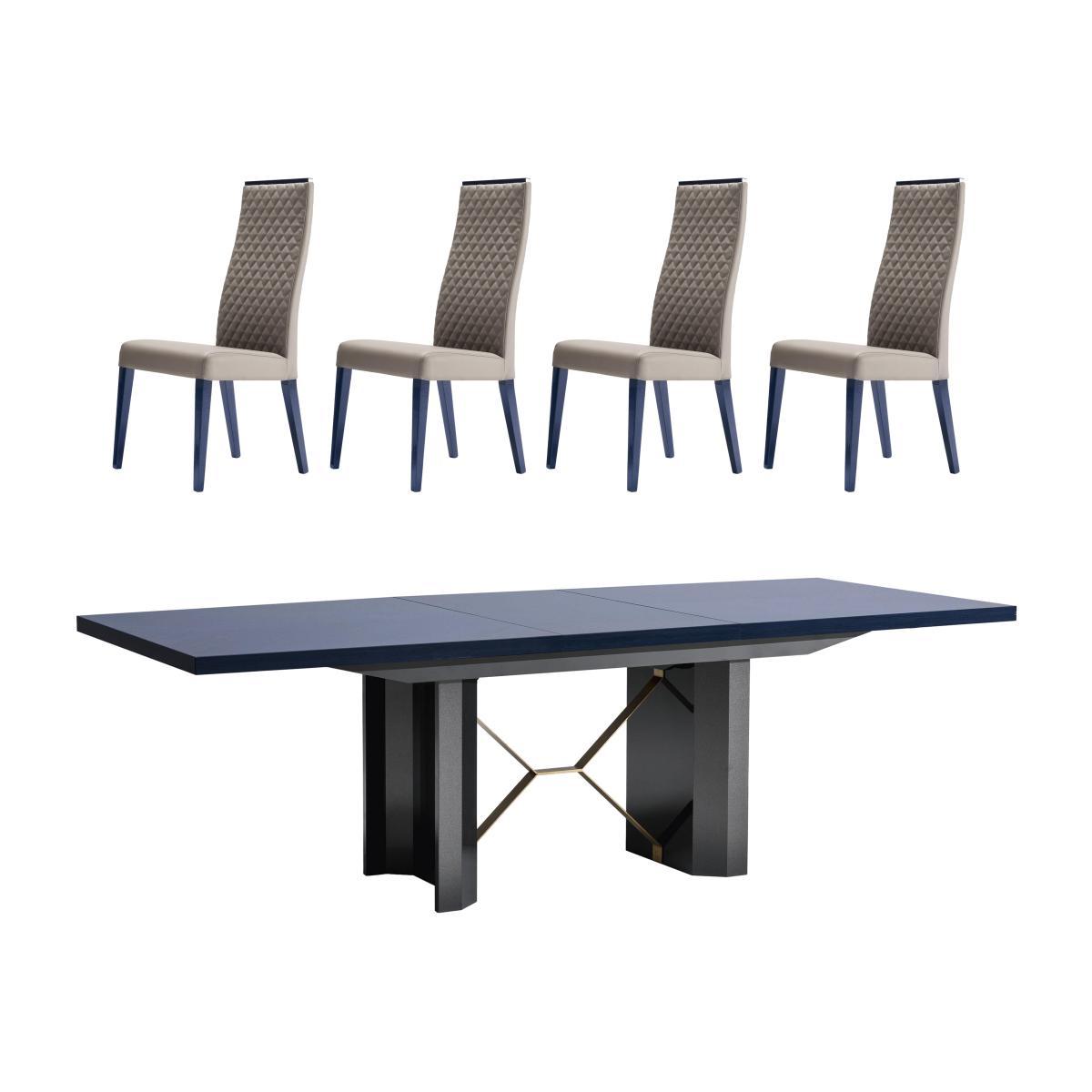 The ALF Oceanum dining set brings the full Italian fine dining experience home. The sleek table has a high-end, high-gloss finish and the chairs boast a comfy foam seat – just take a seat. Why you'll love it. Luxury extending dining table and four chairs from prestigious Italian design house ALF. Grand design with plenty of seating space. High-gloss effect in a stunning deep blue cobalt shade. Comfy seat foam interior on chair for the ultimate comfort. Statement chairs with taupe eco-leather back and Rhombus-shaped stitching. Beautiful and incredibly durable seven-layer lacquered finish. Effortlessly smooth mechanism with a hidden extra leaf for more seating space. Handcrafted in Italy. What you need to know. Dining table is made from natural eucalyptus wood veneers. Table extends on runners. Seats have foam interior. Extension leaf can be hidden in compartment under the table top. Finish may show some very light marks as a result of the buffing process. Slight differences are not defects but rather provide added artisanal value. Part of the contemporary bedroom and living room collection from ALF Italia.