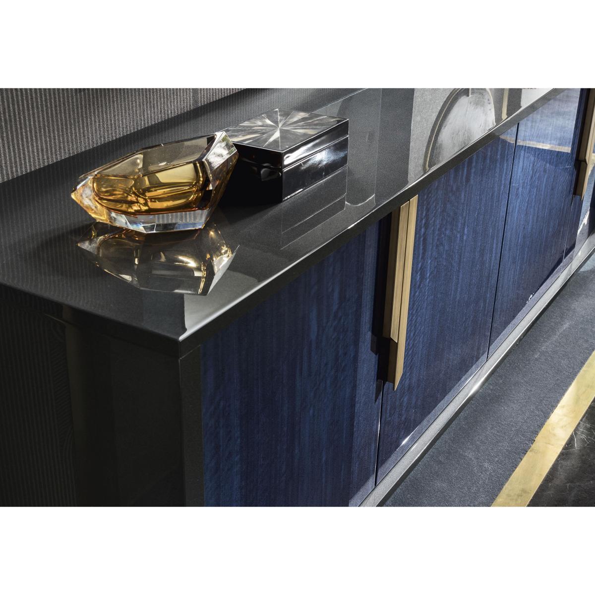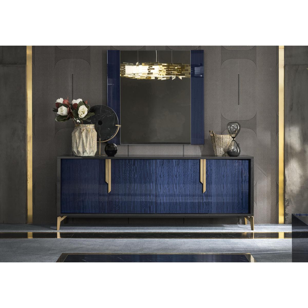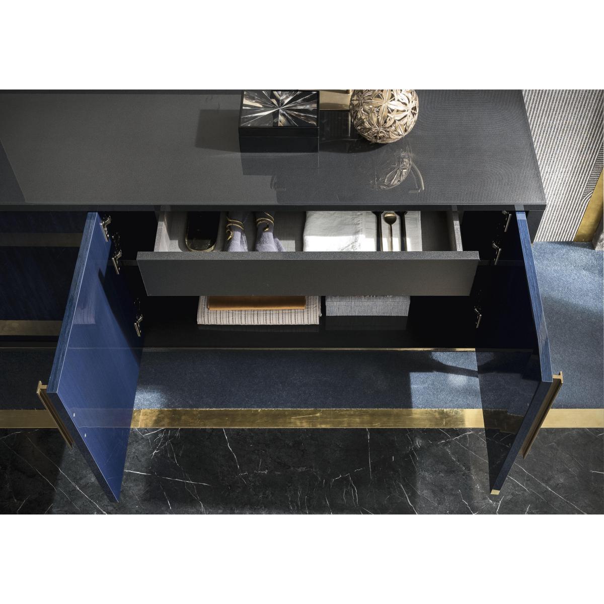 Say ciao to clutter and hello to Italian sophistication with the ALF Oceanum buffet sideboard. Elegant design with gold accents that sits on beautifully brushed brass legs. The definition of dining couture. Why you'll love it. Luxury 4 door buffet sideboard from prestigious Italian design house ALF. Large-scale design with plenty of storage. Soft-close internal drawers, doors and fixed shelves. Attractive brushed brass handles and legs. High-gloss effect in a stunning deep blue cobalt shade. Beautiful and incredibly durable seven-layer lacquered finish. Handcrafted in Italy. What you need to know. The large buffet sideboard is made from natural eucalyptus wood veneers. Finish may show some very light marks as a result of the buffing process. Slight differences are not defects but rather provide added artisanal value. Avoid abrasive cleaners. Coasters and placemats are recommended. Part of the contemporary bedroom and living room collection from ALF Italia. WARNING!. Furniture can tip over unexpectedly and cause injury. This item should be fixed to a wall using the anti-tip kit provided with the furniture. Be sure to use the correct wall fixings suitable for the walls in your home.