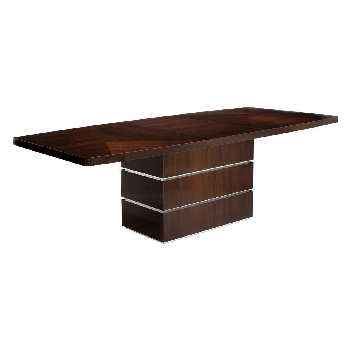 Extends to seat eight. Gorgeous Italian walnut veneers. High-gloss lacquer finish. Central pedestal with dramatic linear design