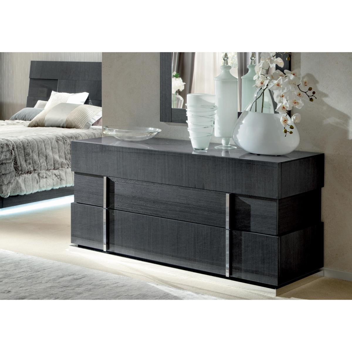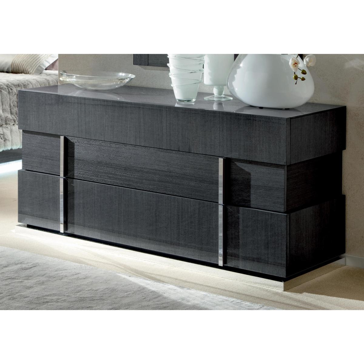 The St Moritz dining collection is as sleek, modern and elegant as you'd expect from prestigious Italian design house ALF. High gloss pedestal tables and cabinets are finished with unique dark grey koto veneers. High backed, luxuriously upholstered chairs with contemporary piping and buttoning detailing complete this glamorous dining collection. Beautiful modern dresser with storage. Crafted from solid wood with high gloss grey koto veneers. Minimalist style with clean modern lines. Rich lacquered finish. Three soft closing drawers offer plenty of hidden storage. Vertical chrome finish handles are part of the design. High end Italian style and glamour. WARNING!. Furniture can tip over unexpectedly and cause injury. This item shall be fixed to a wall using the anti-tip kit provided with the furniture. Be sure to use the correct wall fixings suitable for the walls in your home. Did you know?. Hairline marks are a natural feature of this furniture's beautiful, high gloss finish.