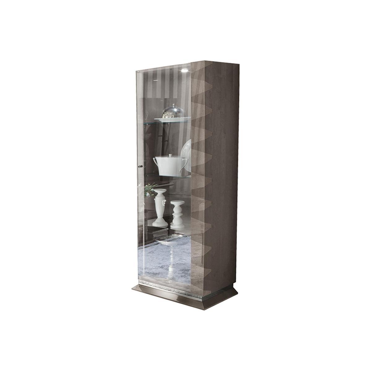 Live – and sleep – in luxury with the glamorous ALF Vito bedroom furniture collection. Designed and handcrafted in Italy, the range showcases its Art Deco inspiration in the form of beautiful geometric birch wood veneer inlays and a glossy taupe finish. A statement bed frame with a high upholstered headboard is a suitably opulent centrepiece for this fabulous collection which also includes chests of drawers, a bedside cabinet and a dressing table with a secret jewellery compartment. Storage gets glamorous with this rather fabulous curio cabinet. Gorgeous wood inlays and a statement pedestal base make it easy to show you off your favourite bits and pieces in style. Why you’ll love it. Art Deco-inspired design from Italian furniture maker ALF. Glamour on a grand scale. High-gloss geometric inlays. Dark taupe colour is versatile and on trend. Pedestal base with mirror detail. Elegant door handles have a brown chrome finish. Seven-layer lacquered finish is beautiful and incredibly durable. Soft-close cupboard door. Handcrafted in Italy. What you need to know. Inlaid veneers are made of birch wood. Full height glass door is hinged at the right. 3 adjustable glass shelves. Finish may show some very light marks as a result of the buffing process. Complete your stylish storage arrangement with the ALF Vito 4 door sideboard.