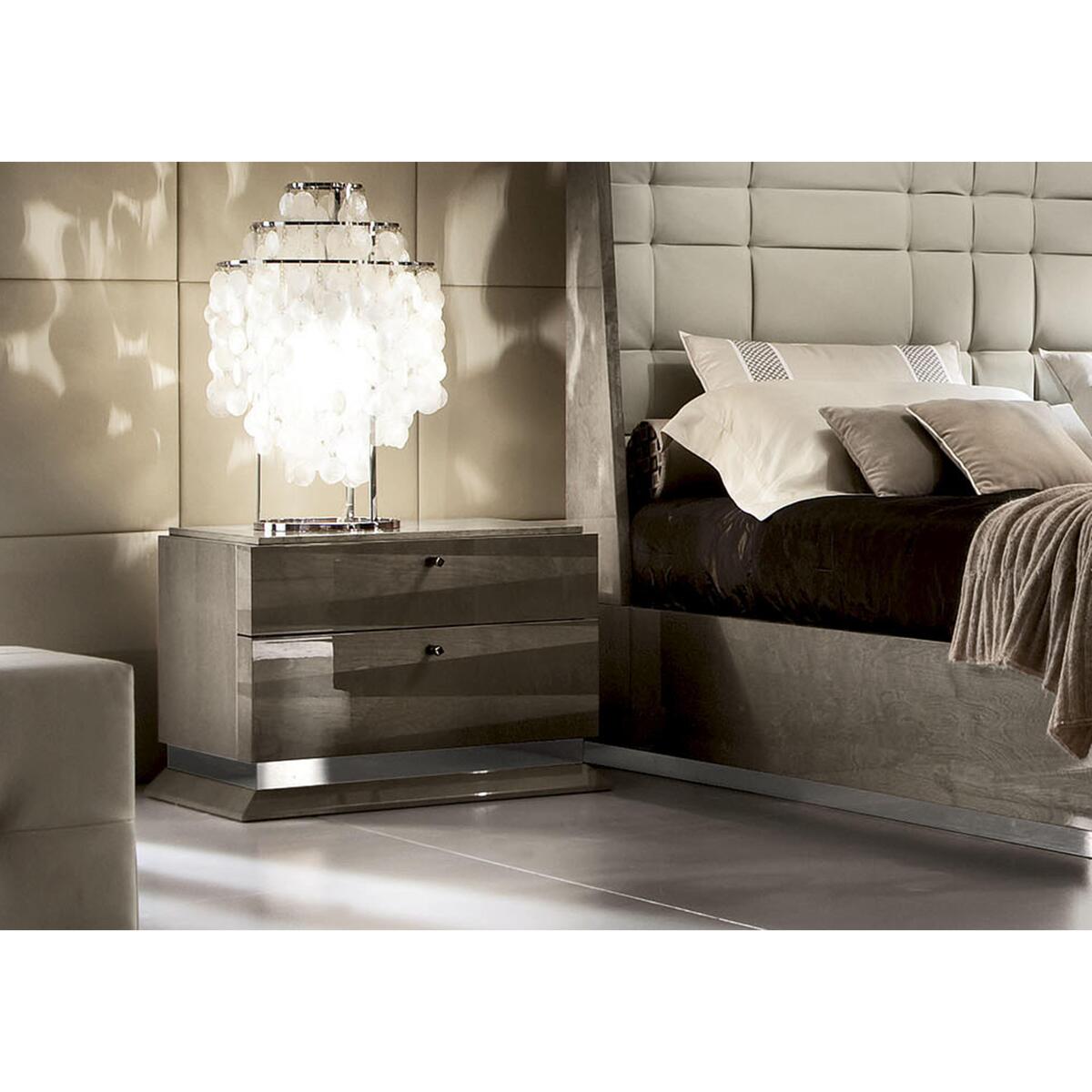 Live – and sleep – in luxury with the glamorous ALF Vito bedroom furniture collection. Designed and handcrafted in Italy, the range showcases its Art Deco inspiration in the form of beautiful geometric birch wood veneer inlays and a glossy taupe finish. A statement bed frame with a high upholstered headboard is a suitably opulent centrepiece for this fabulous collection which also includes chests of drawers, a bedside cabinet and a dressing table with a secret jewellery compartment. Practical as well as beautiful, this large bedside cabinet has two roomy drawers and an altogether luxurious finish. The perfect piece for your glamorous bedroom. Why you’ll love it. Art Deco-inspired design from Italian furniture maker ALF. Glamour on a grand scale. High-gloss geometric inlays. Dark taupe colour is versatile and on trend. Pedestal base with mirror detail. Elegant drawer handles have a brown chrome finish. Seven-layer lacquered finish is beautiful and incredibly durable. Soft-close drawers. Handcrafted in Italy. What you need to know. Inlaid veneers are made of birch wood. 2 drawers, one deep and one shallow. Finish may show some very light marks as a result of the buffing process. The ALF Vito bedroom range includes a fabulous bed frame and storage pieces of all sizes.