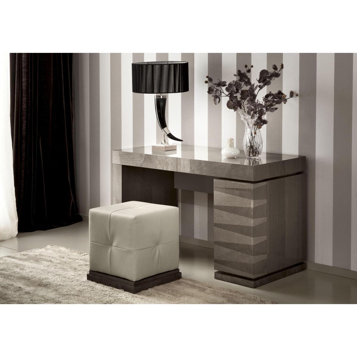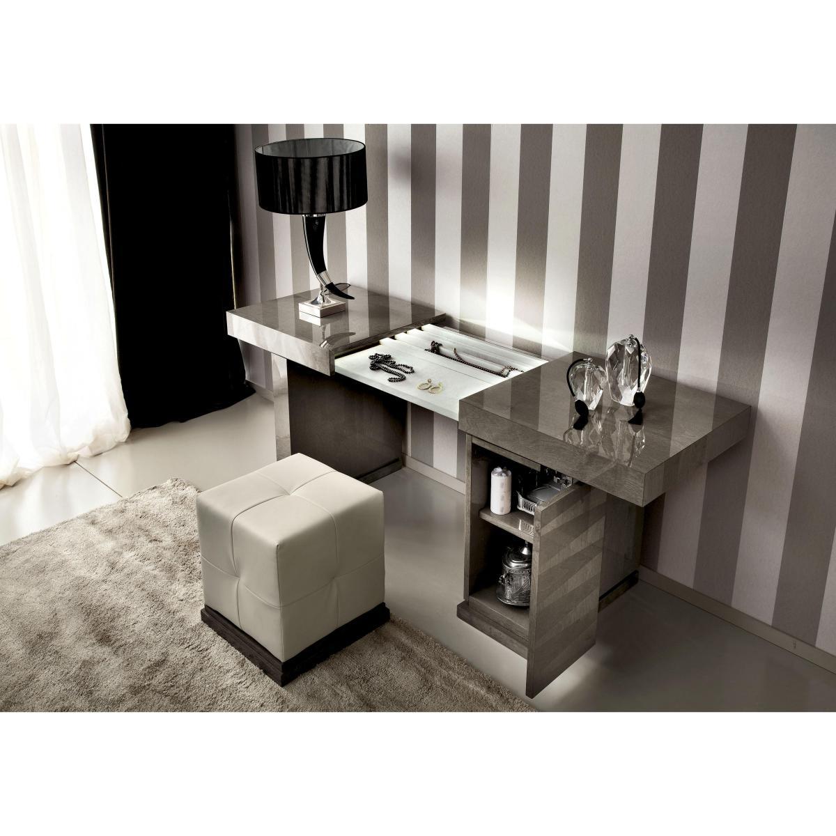 Live – and sleep – in luxury with the glamorous ALF Vito bedroom furniture collection. Designed and handcrafted in Italy, the range showcases its Art Deco inspiration in the form of beautiful geometric birch wood veneer inlays and a glossy taupe finish. A statement bed frame with a high upholstered headboard is a suitably opulent centrepiece for this fabulous collection which also includes chests of drawers, a bedside cabinet and a dressing table with a secret jewellery compartment. This Art Deco-style dressing table with hidden depths has a luxurious high-gloss finish and a secret jewellery compartment. Handcrafted in Italy. Why you’ll love it. Art Deco-inspired design from Italian furniture maker ALF. Glamour on a grand scale. High-gloss geometric inlays. Dark taupe colour is versatile and on trend. Pedestal base with mirror detail. Seven-layer lacquered finish is beautiful and incredibly durable. The top slides apart to reveal a jewellery compartment. Soft-close cupboard door. Handcrafted in Italy. What you need to know. Inlaid veneers are made of birch wood. Cupboard with 1 shelf. Finish may show some very light marks as a result of the buffing process. The ALF Vito bedroom range includes a fabulous bed frame and storage pieces of all sizes. WARNING!. Furniture can tip over unexpectedly and cause injury. This item shall be fixed to a wall using the anti-tip kit provided with the furniture. Be sure to use the correct wall fixings suitable for the walls in your home.
