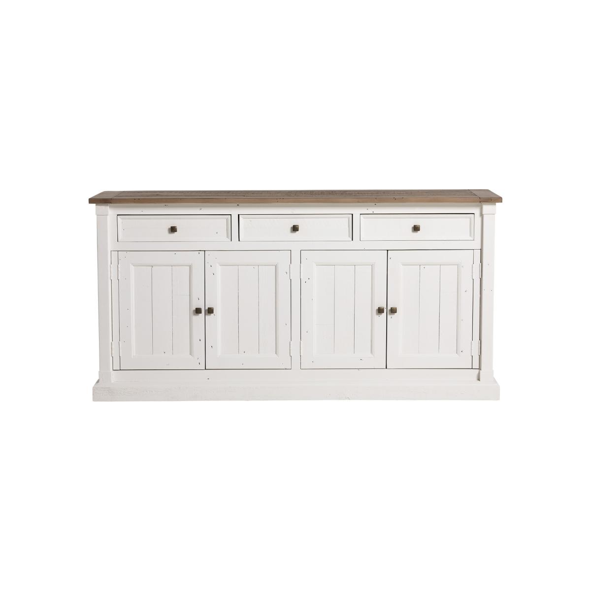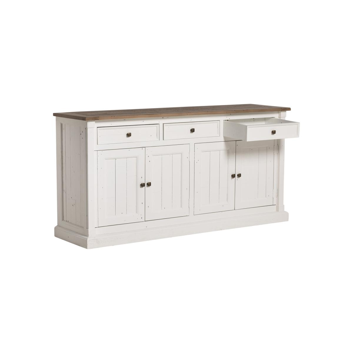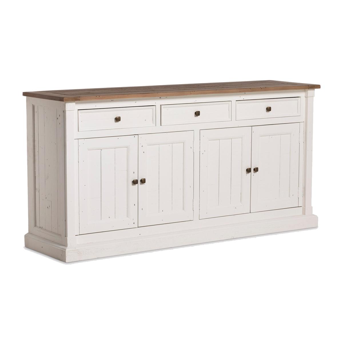 This expertly crafted sideboard combines functionality with sustainability, made from recycled pallet pine for a rustic, eco-conscious appeal. Featuring four doors, three spacious drawers, and two interior shelves, it provides ample storage for your essentials while showcasing the natural charm of reclaimed wood. Its durable construction and timeless design make it a versatile addition to any home, blending seamlessly with various interior styles. Perfect for organizing and displaying your belongings, this sideboard is a practical and stylish statement piece.