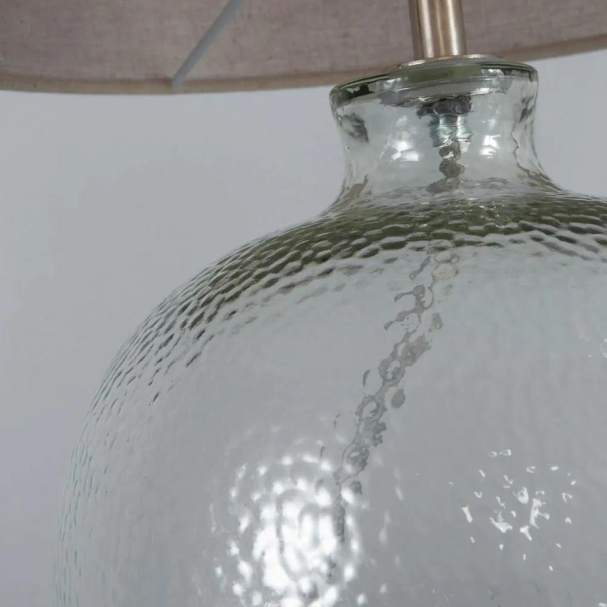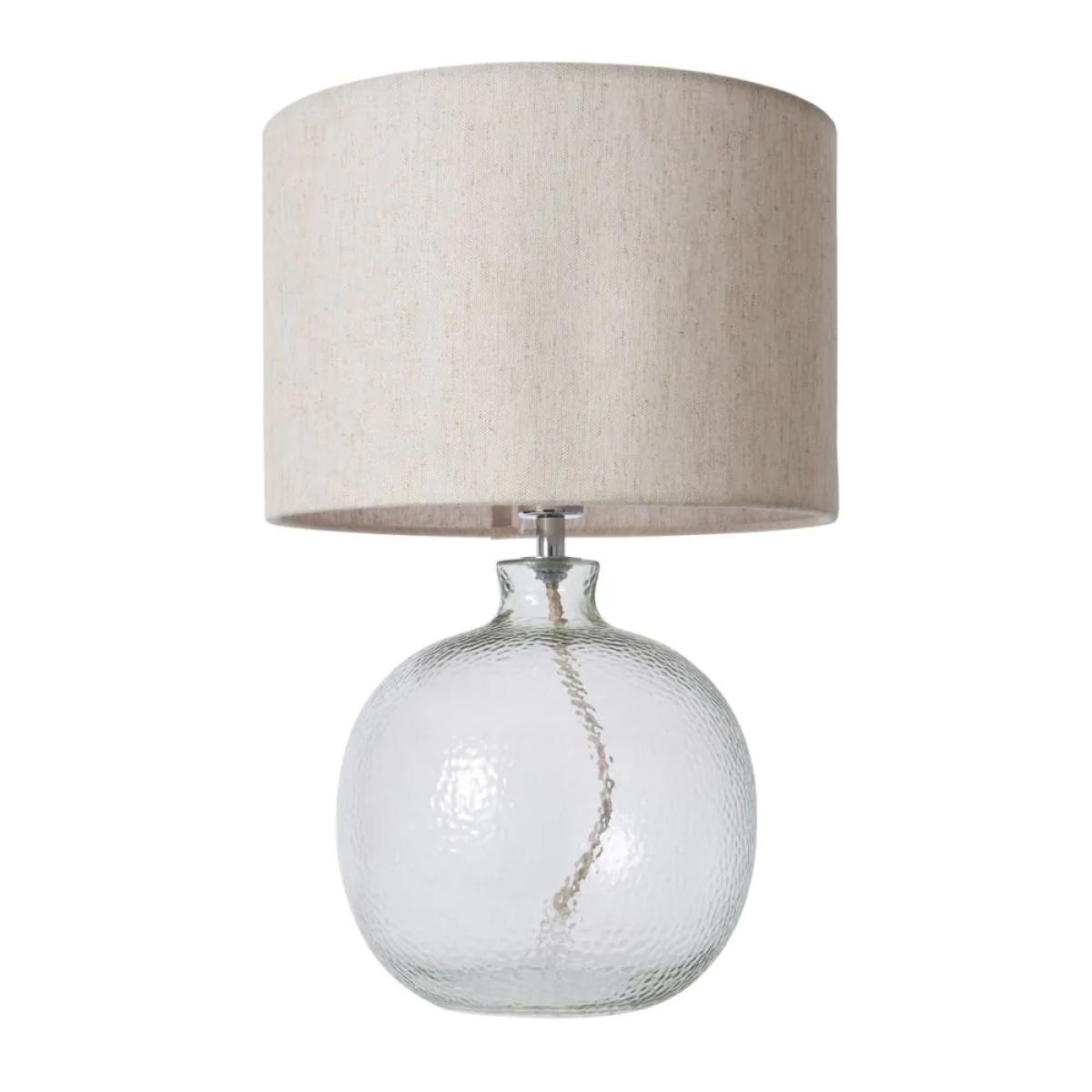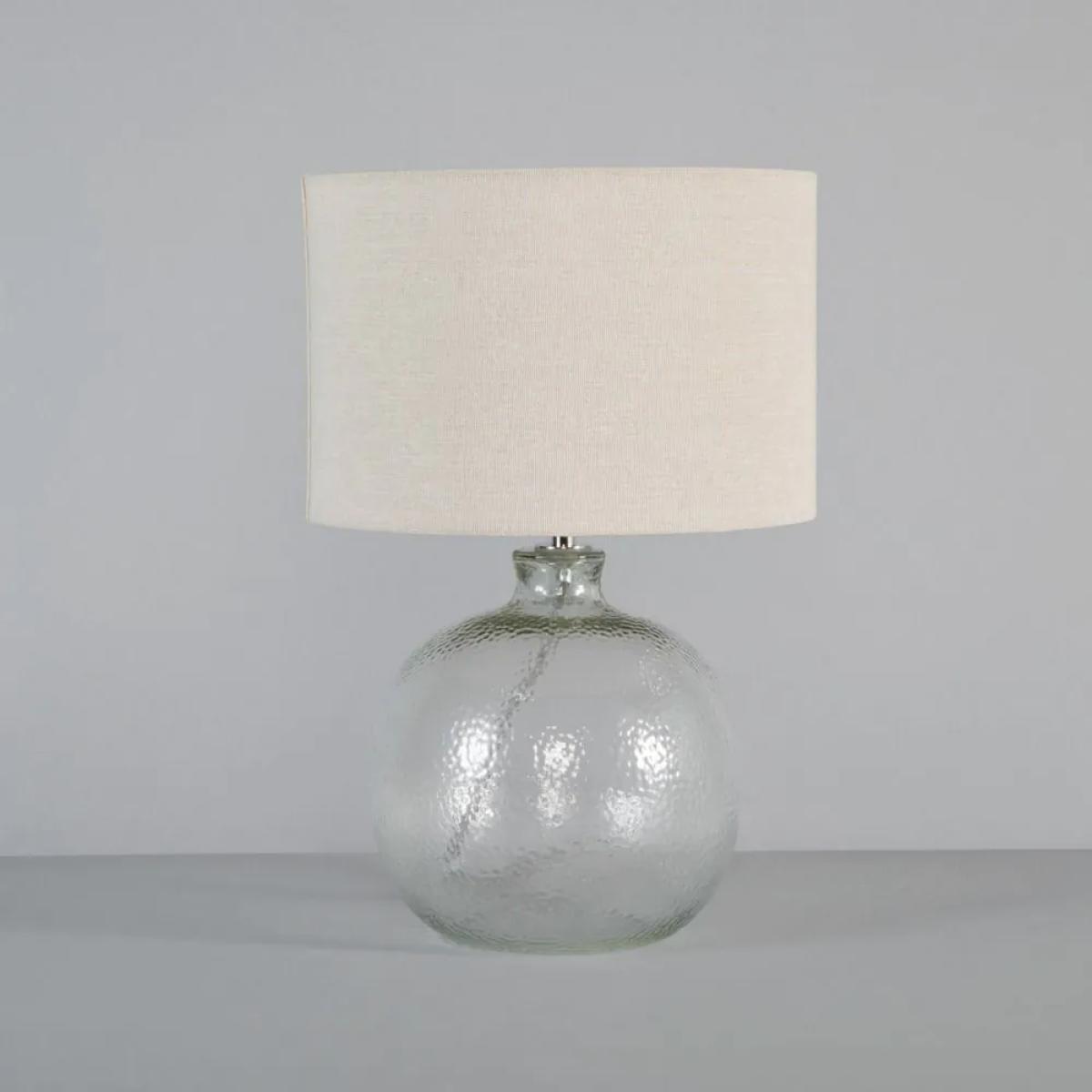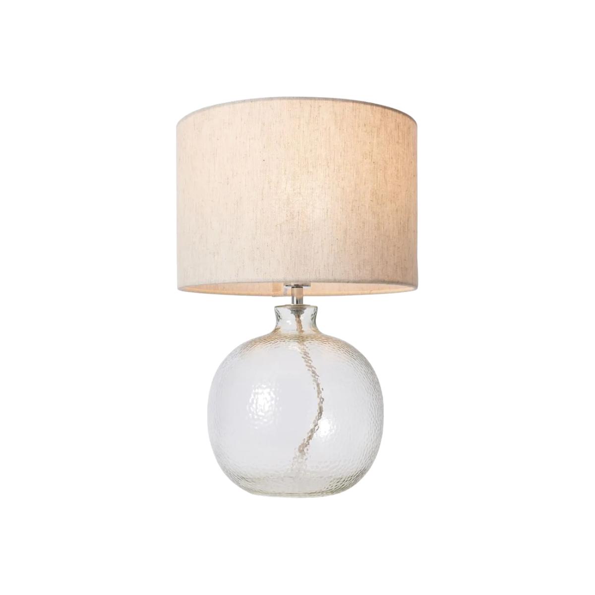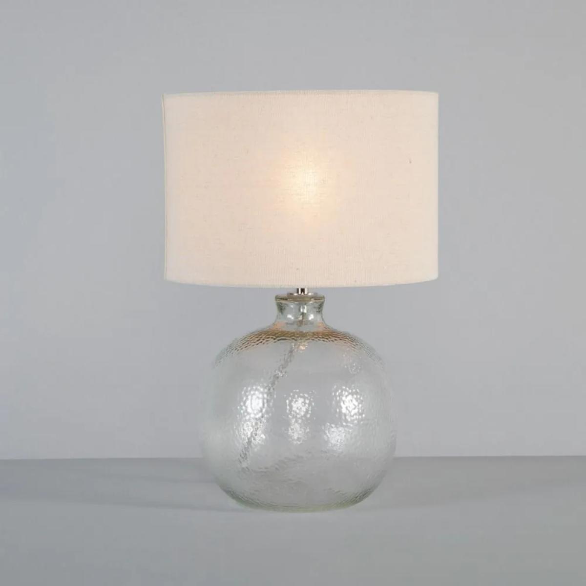 Inspire a stylish look in your home with the Alfie Bobble Glass Table Lamp. This table lamp features a clear vase shaped base with a mottled glass design for a unique texture and a refined appearance to your decor. It also comes with a natural shade for a warm glow diffused outwards, looking ideal on any bedside table or side board.