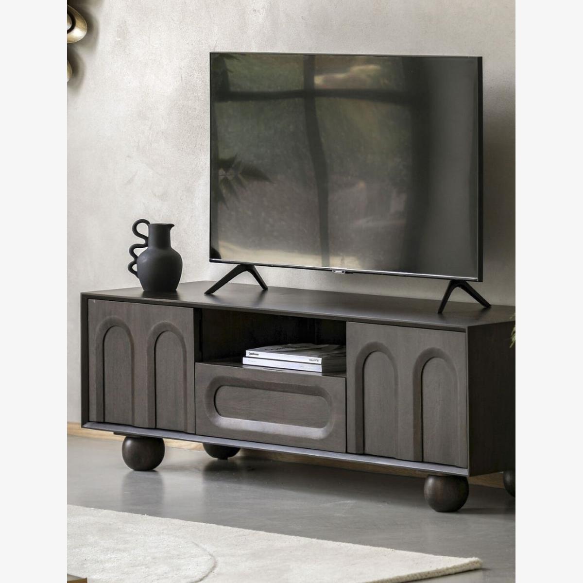 I’m a fan of the Alfred unit for its low-profile silhouette and subtle arch detailing - it’s solid without feeling bulky. The dark, ash-effect finish and rounded bun feet give it a slightly vintage edge but it still sits comfortably in modern, Scandi or even industrial-leaning interiors. Practical styling is straightforward: keep the top clear except for a couple of curated objects (a sculptural vase or a stack of coffee-table books) and let the central shelf house your AV box or a single display piece. Tuck remotes and cables behind the doors to maintain a clean look, and if you’d like to soften the tone, pair it with a cream rug or light-wood side table.