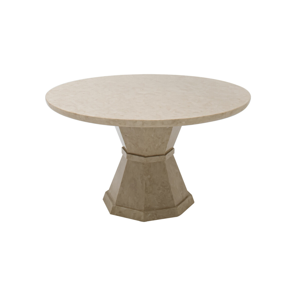 The Alfredo Round Dining Table is a beautifully crafted choice for any dining room. Its classic design is a timeless choice for both modern and traditional interiors and it coordinates with other pieces within the wider Alfredo collection with ease. It combines an exquisite marble tabletop with a stylishly angled pedestal base. Immaculate high quality marble construction. Cream marble accented with rich brown detailing. Elegant slanted pedestal base. Seats up to four diners. Ground floor delivery only.