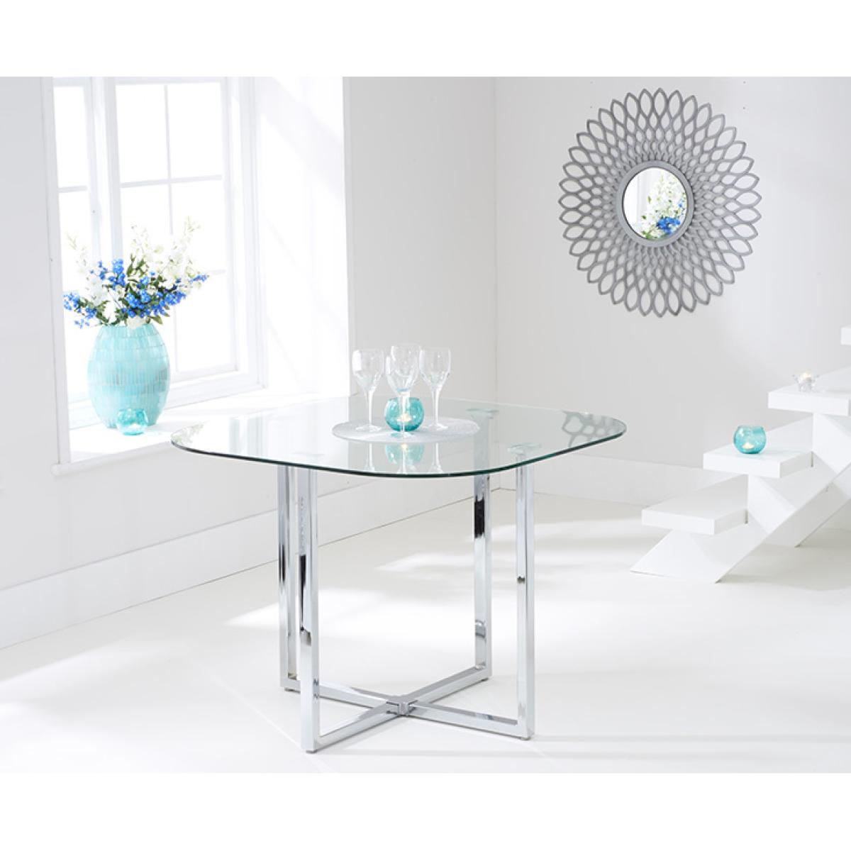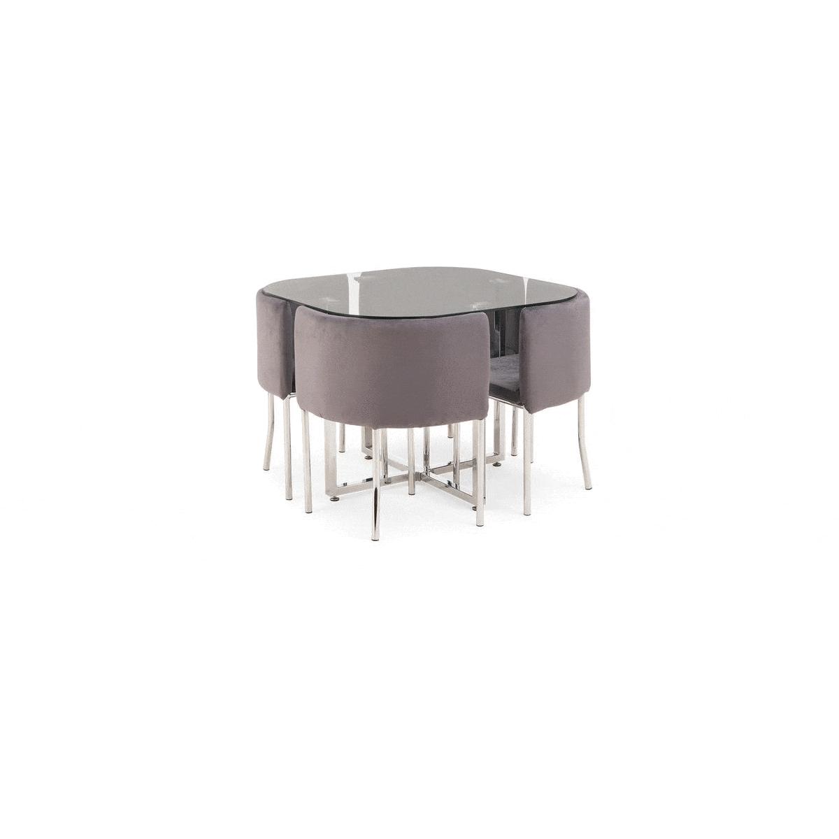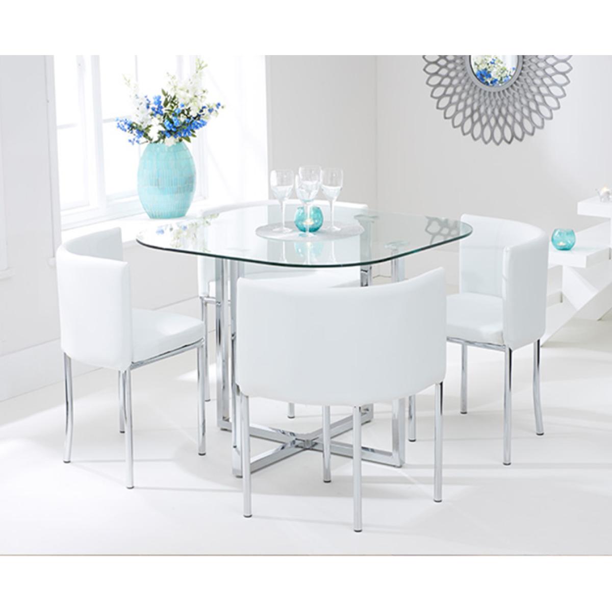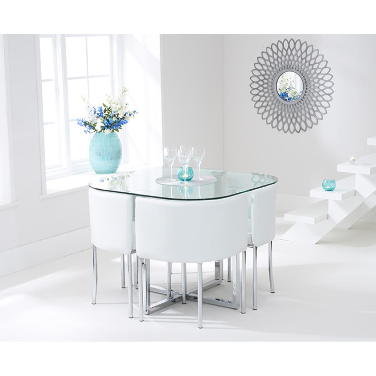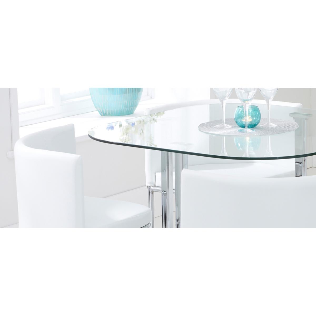 The Algarve Glass Stowaway Dining Set epitomises modern style and functionality. Chic and practical in design, the glass dining set comfortably accommodates 4 people. Recently featured on ITV’s This Morning, the Algarve Table has stunning handmade chrome legs that beautifully complement the smooth tempered glass table top for a beautiful contemporary look. The space saving dining set combines style and practicality as the High Back Stools stow away completely beneath the table top when not in use. Upholstered in Ivory-white PU, the stools are complete with chrome legs to complement the dining table. The stools are also available in a choice of brown, black, cream, grey or red.