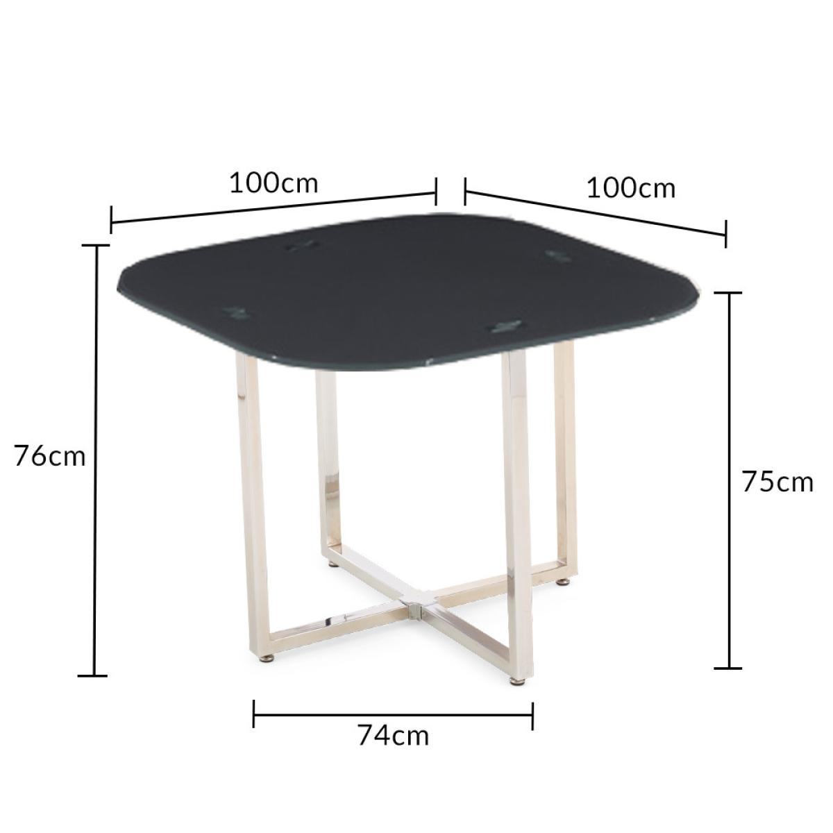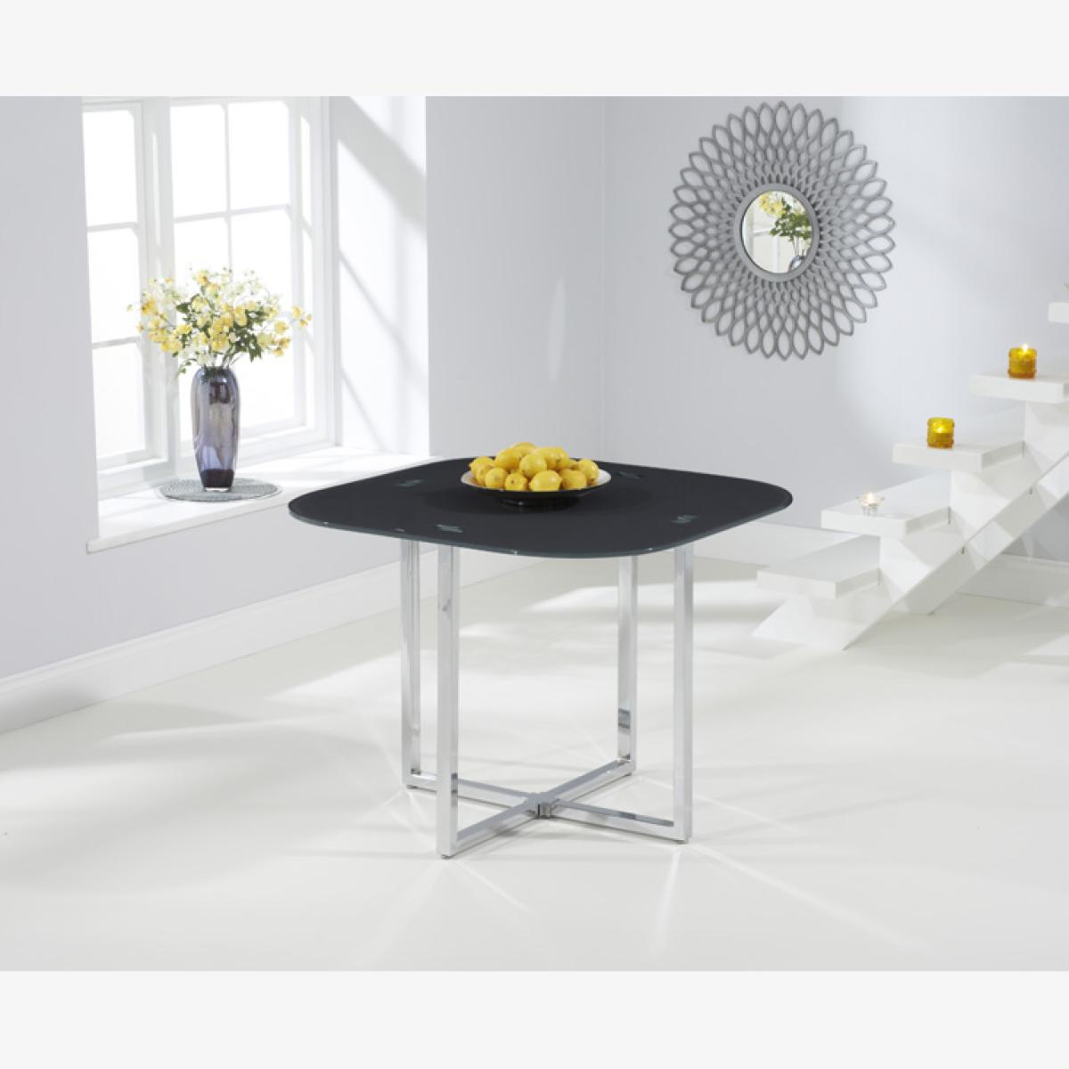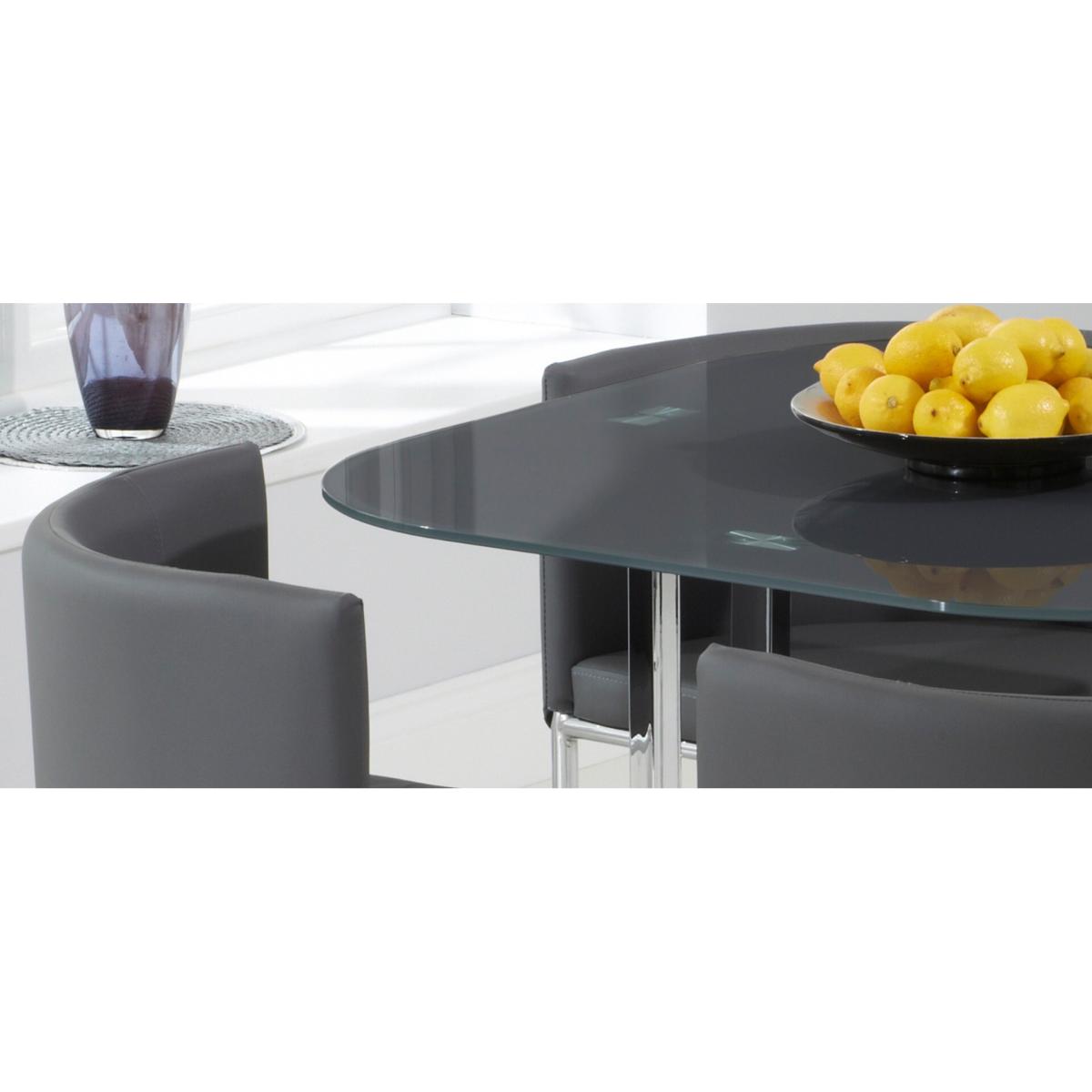 The Algarve dining table features a smooth grey glass tabletop with curved corners, complete with contemporary chrome legs in a sleek crossed design.