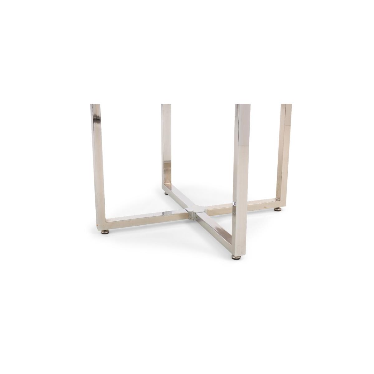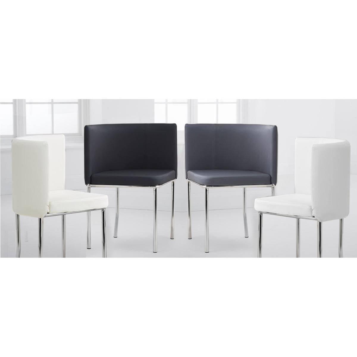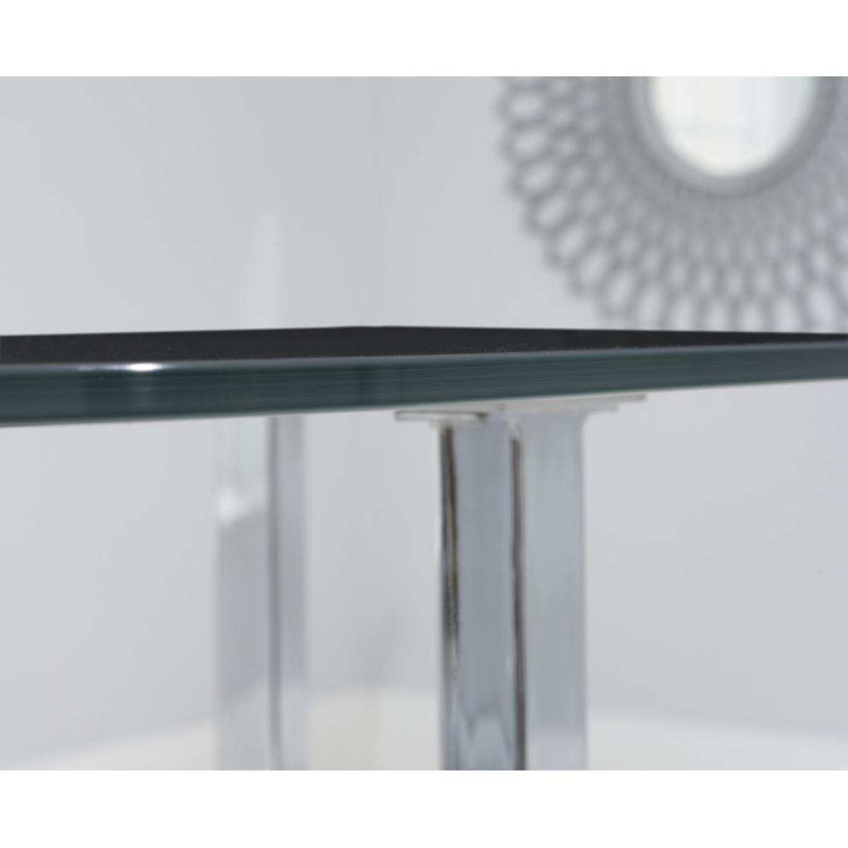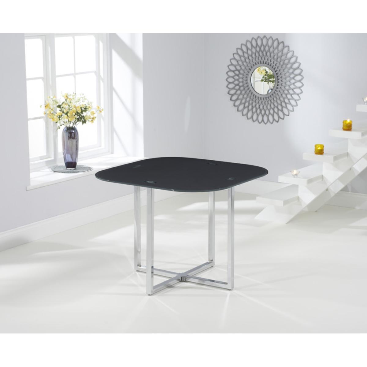 The Algarve dining table features a smooth grey glass tabletop with curved corners, complete with contemporary chrome legs in a sleek crossed design.