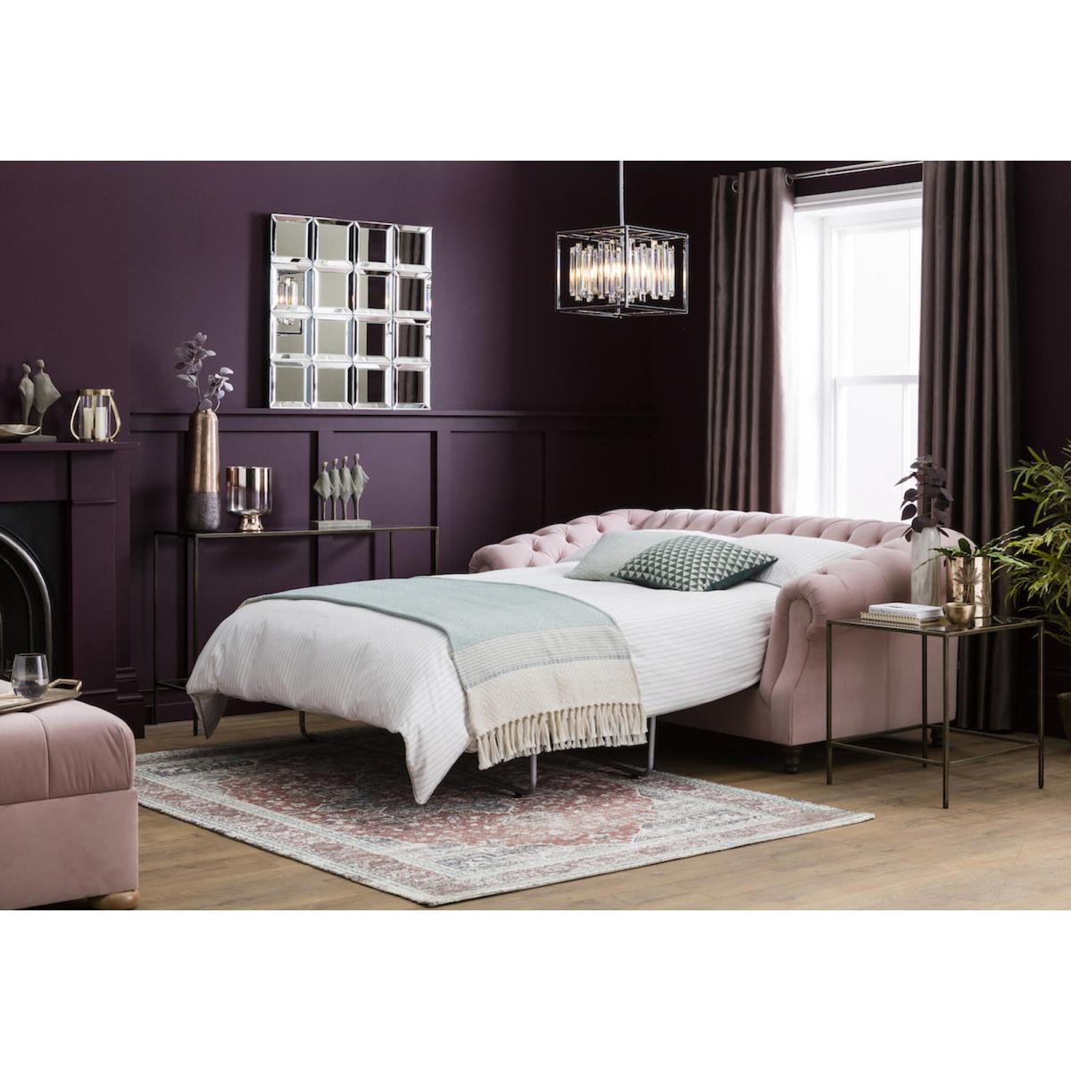 Make way for Algernon; big, bold and beautiful, this guy is a classic hefty Chesterfield style sofa, with the added bonus of a sofa bed! With deeply buttoned supersoft foam and feather wrapped seat cushions, Algernon combines all the presence and grandeur that you'd expect from this timeless sofa together with deeply inescapable comfort. Sofa bed pulls out to reveal sprung mattress over slats ensuring a deep sleep. Please note that seams may vary depending on which fabric you choose.