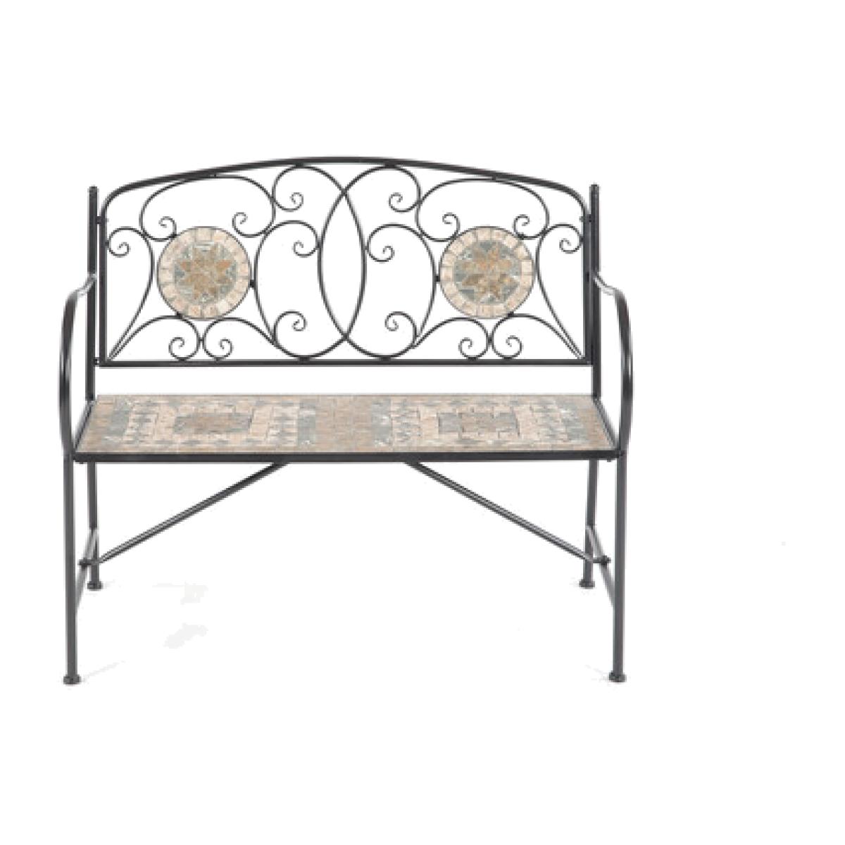 Bring a sweep of vintage charm to your garden with the Algiers Mosaic Bench. This beautiful bench features classically designed mosaic pieces on the back rest and across the seat, which is accented by delicately swooping metal bars. Place this bench against a sunny wall or under the shade of a tree, and you and a loved one really will have the perfect spot for whiling conversations and a few drinks. Algiers Mosaic Bench