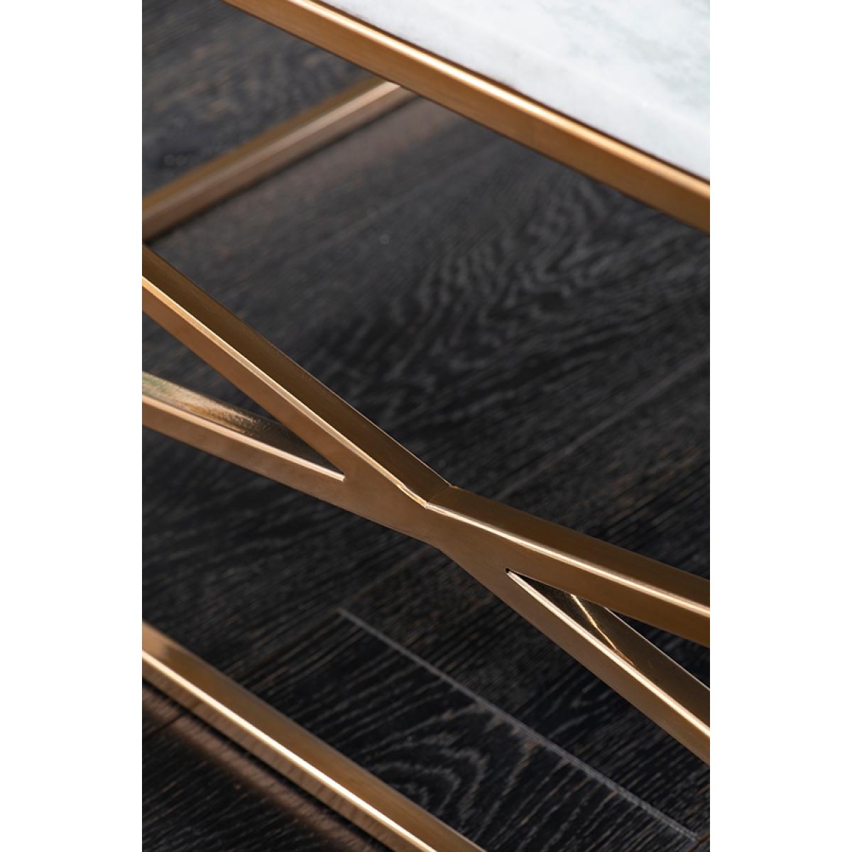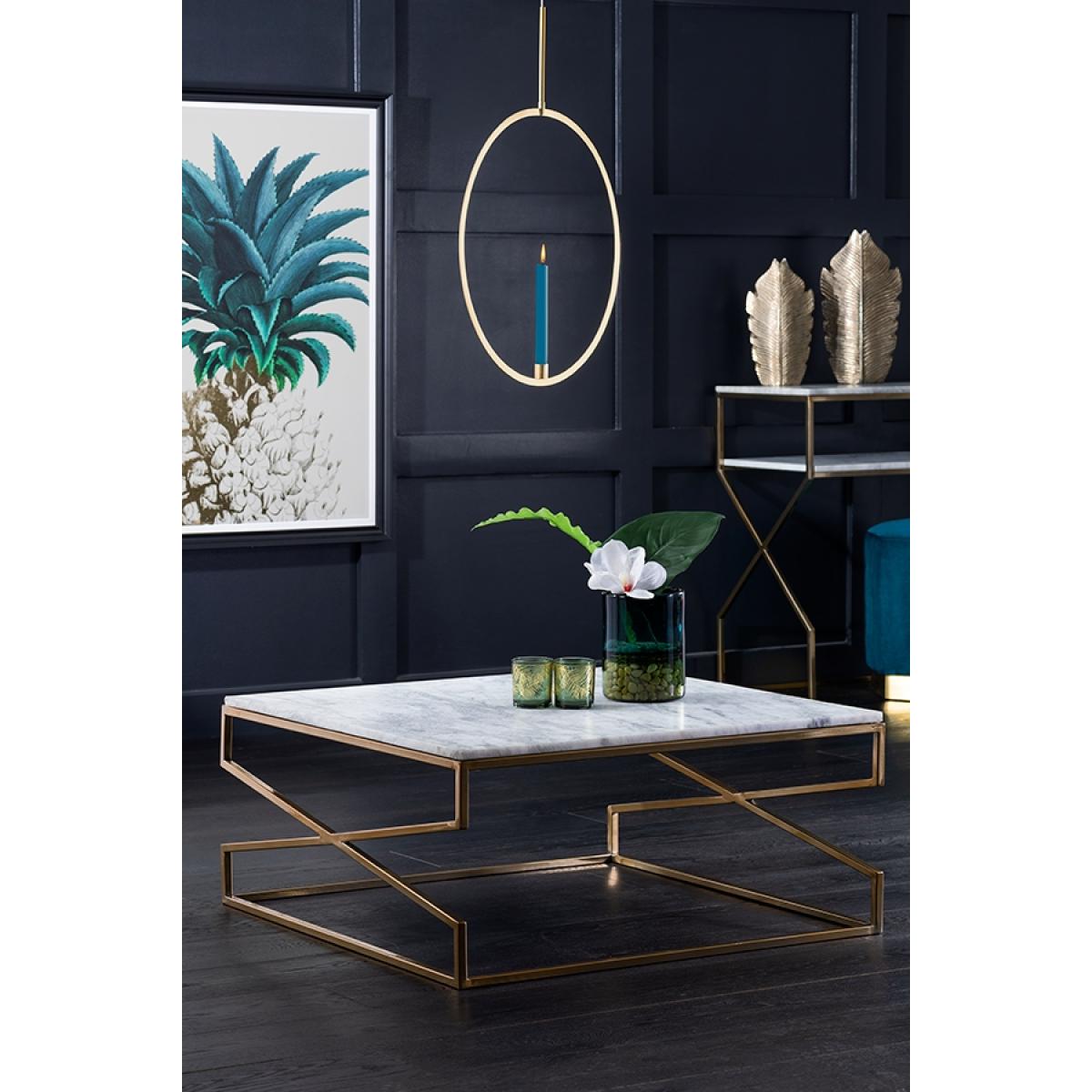 Glamorous design, Inspired by mesmerising geometric patterns from the Alhambra Palace. High quality, steel construction with brass effect finish. Solid marble top. Due to its natural formation every piece of marble is unique. There may be subtle differences in colour, tone and composition from the image shown. On occasions fissures may be present, these are natural characteristics and do not compromise the marble’s structural integrity. Wipe with a soft, dry cloth. Avoid using chemical based cleaners as these could damage the finish.