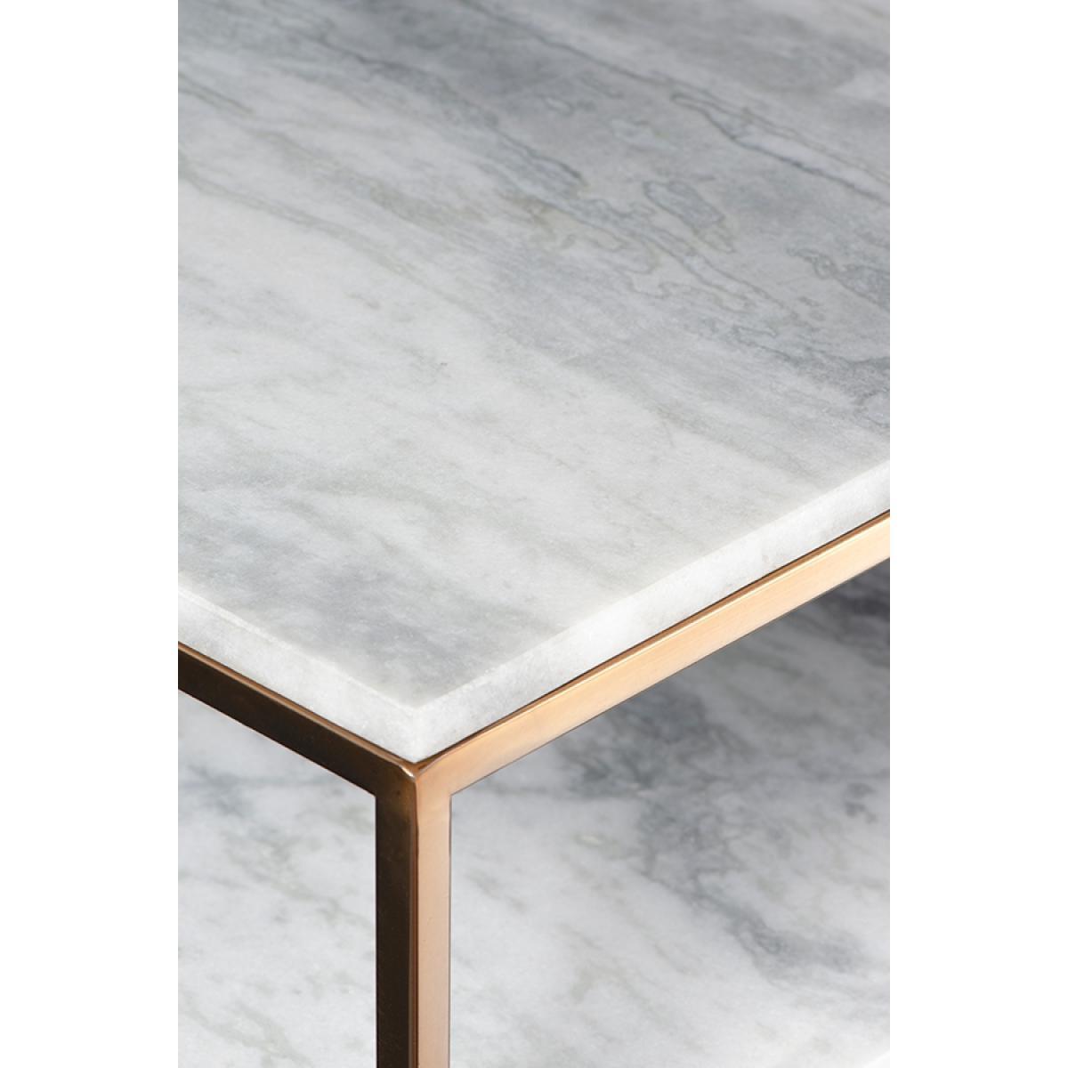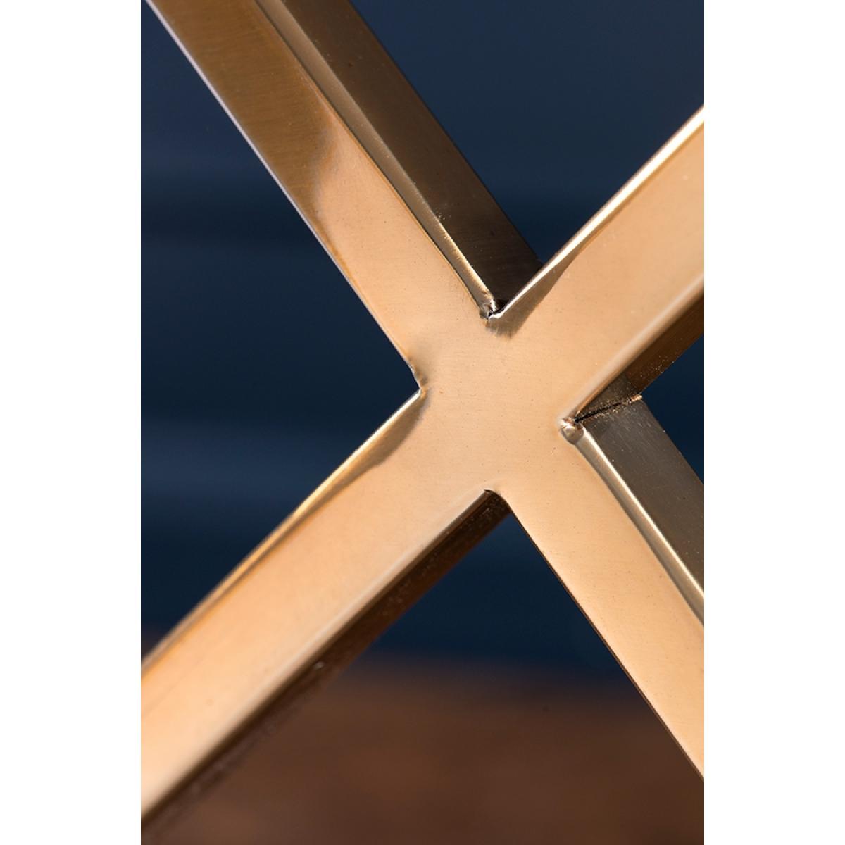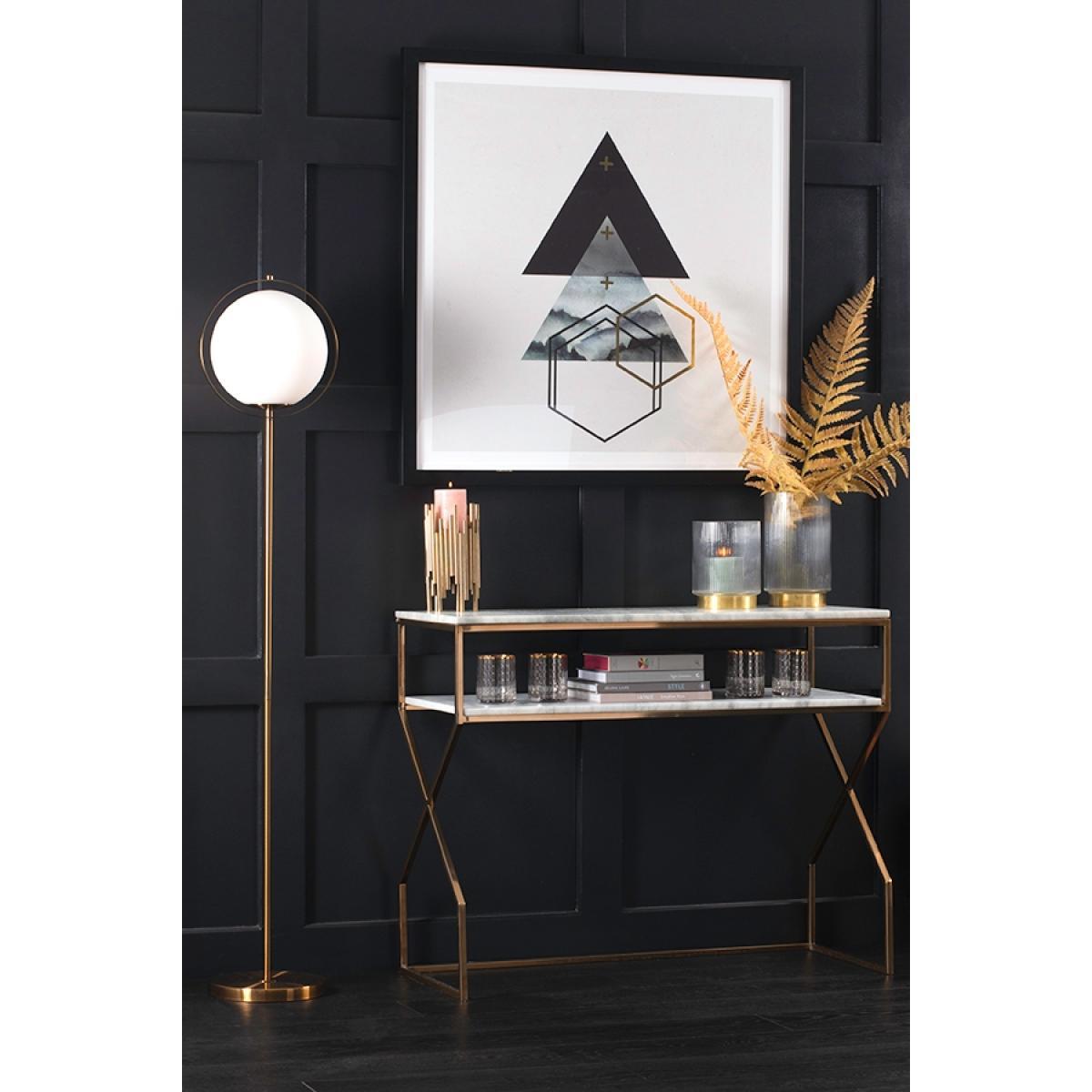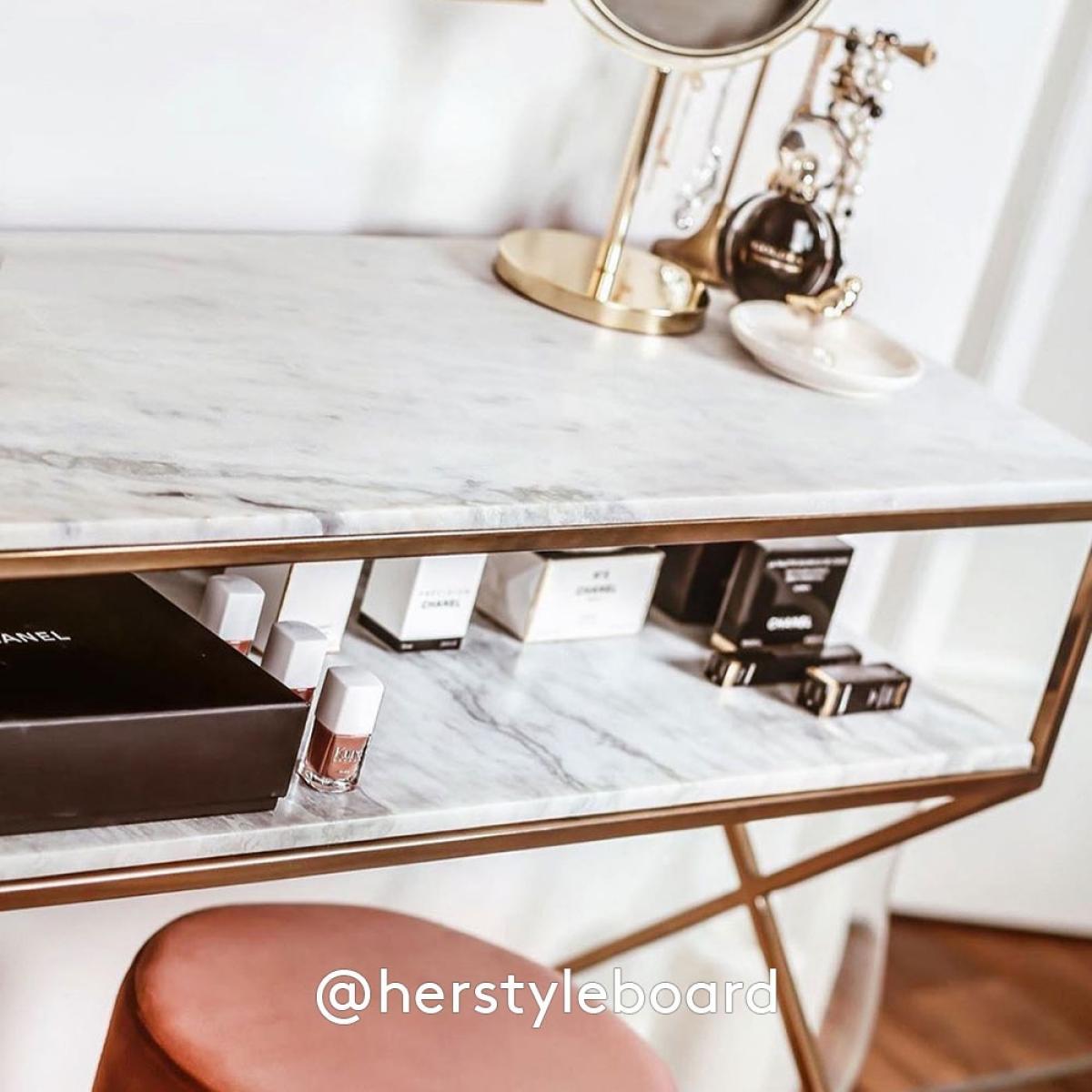 Glamorous design Inspired by mesmerising geometric patterns from the Alhambra Palace. High quality steel construction with brass finish. Solid marble shelf and top. Suitable for use as a console or dressing table. Due to its natural formation every piece of marble is unique. There may be subtle differences in colour, tone and composition from the image shown. On occasions fissures may be present, these are natural characteristics and do not compromise the marble’s structural integrity. Wipe with a soft, dry cloth. Avoid using chemical based cleaners as these could damage the finish.